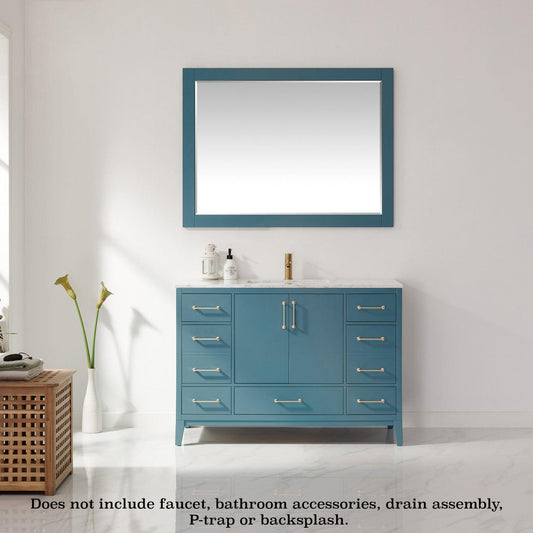 Altair Sutton 48" Single Royal Green Freestanding Bathroom Vanity Set With Mirror, Natural Carrara White Marble Rectangular Undermount Ceramic Sink, and Overflow