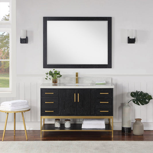 Altair Wildy 48" Black Oak Freestanding Single Bathroom Vanity Set With Mirror, Stylish Composite Grain White Stone Top, Rectangular Undermount Ceramic Sink, Overflow, and Backsplash