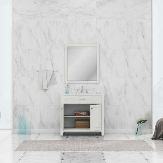 Alya Bath Norwalk 36" Single White Freestanding Bathroom Vanity With Carrara Marble Top, Ceramic Sink and Wall Mounted Mirror