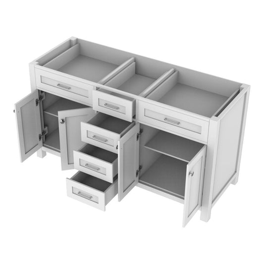 Alya Bath Norwalk Collection 60-inch double bathroom vanity is built with solid wood construction and offers lifetime reliability. This free-standing vanity includes four soft-closing doors and four soft-closing drawers with brushed nickel hardware that adds a modern appeal. This transitional vanity has cabinet space for all of your storage needs.