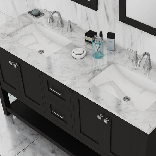 Alya Bath Wilmington 60" Double Espresso Freestanding Bathroom Vanity With Carrara Marble Top, Ceramic Sink and Wall Mounted Mirror