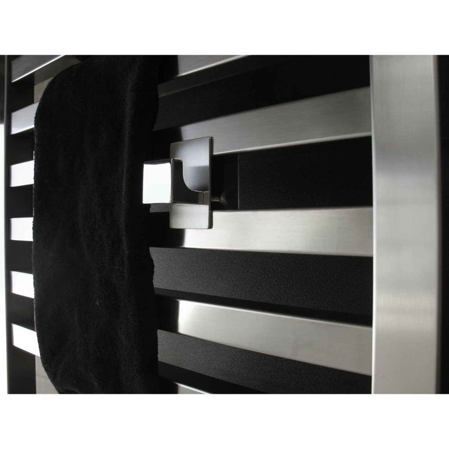 The Quadro and Vega bathrobe hanger AQ–BH Attaches to any of our Quadro or Vega collection heated towel racks and adds a way to easily hang bathrobes, clothing, or additional towels. The bathrobe hanger itself is not heated, though it will conduct heat through contact with the bars.
