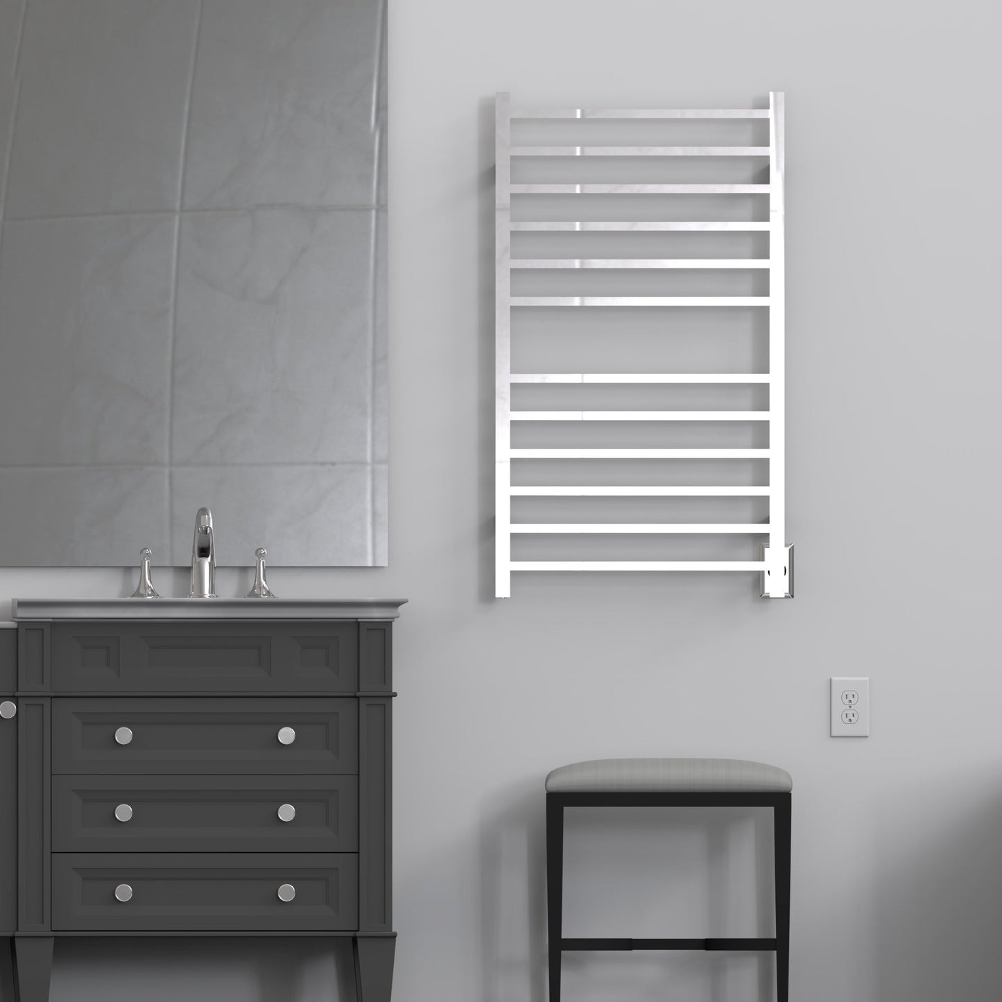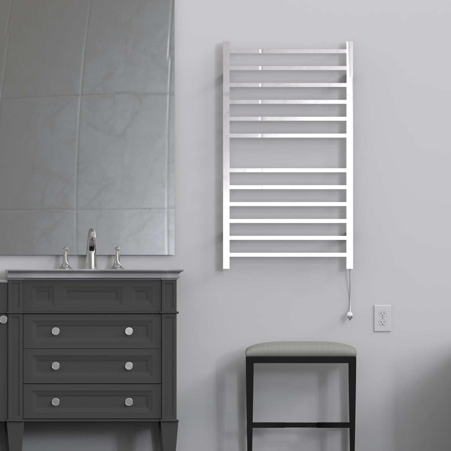 - Space-Saving Design: Replace traditional towel bars and robe hooks. Hang two towels on the horizontal sections and bathrobes from the top of the vertical bars, all of which are heated for added convenience.