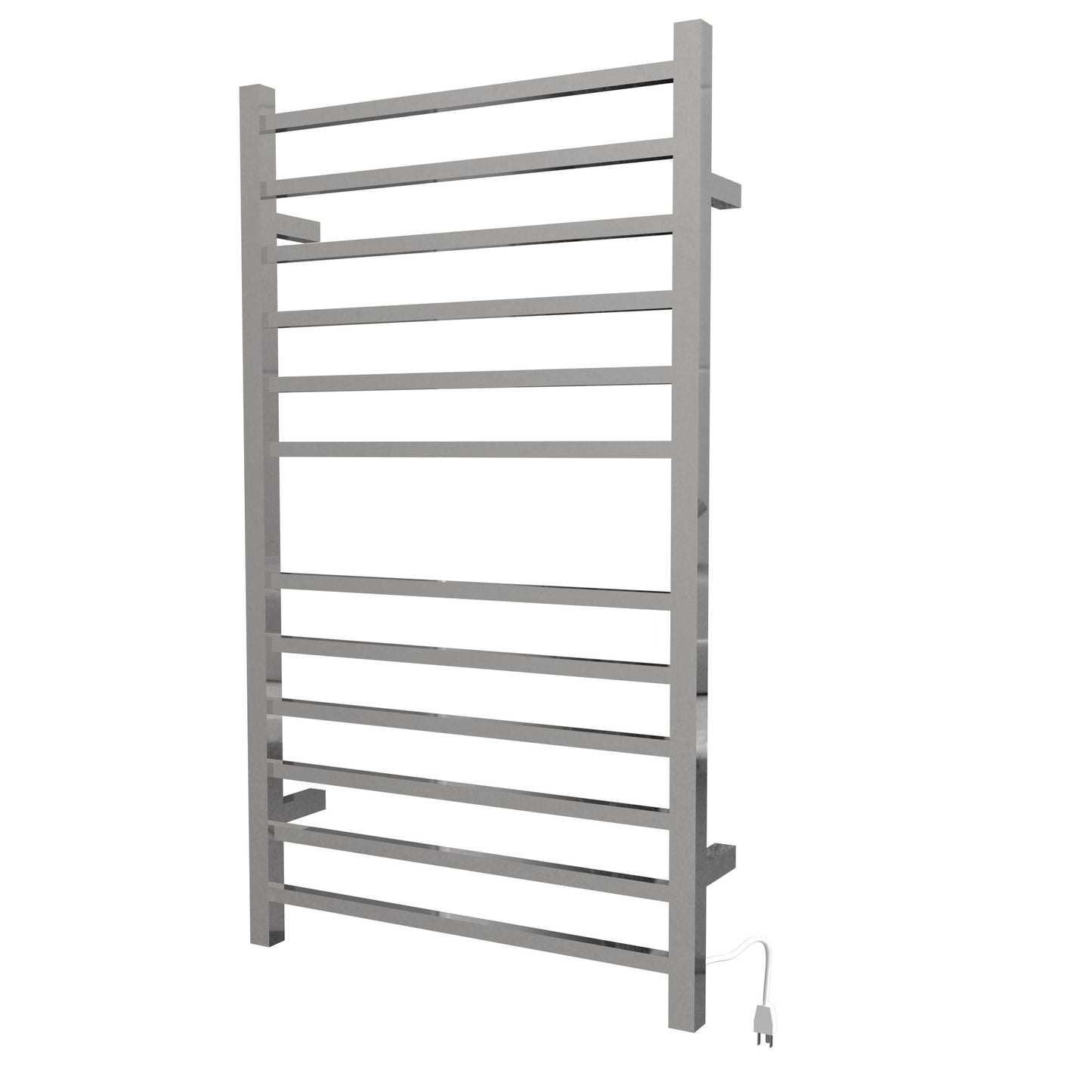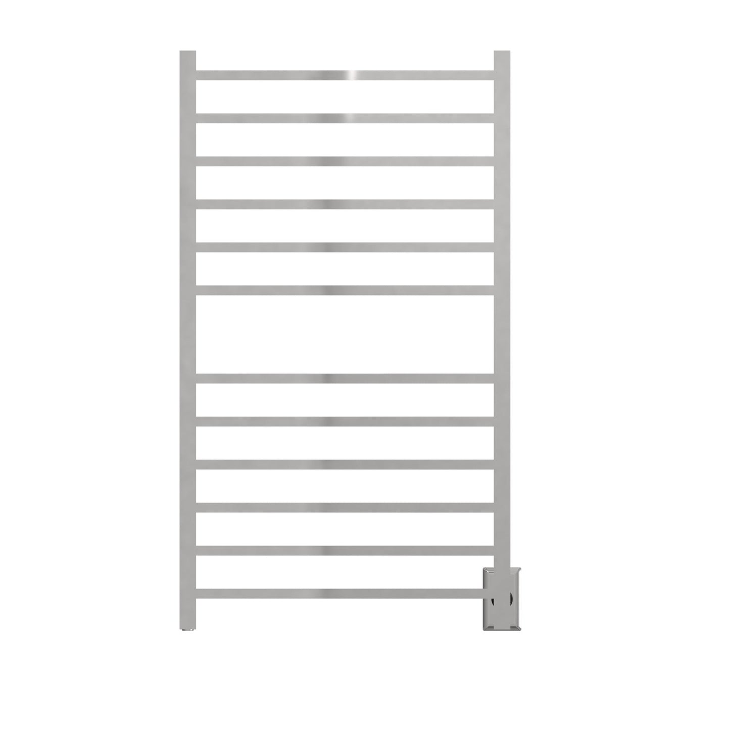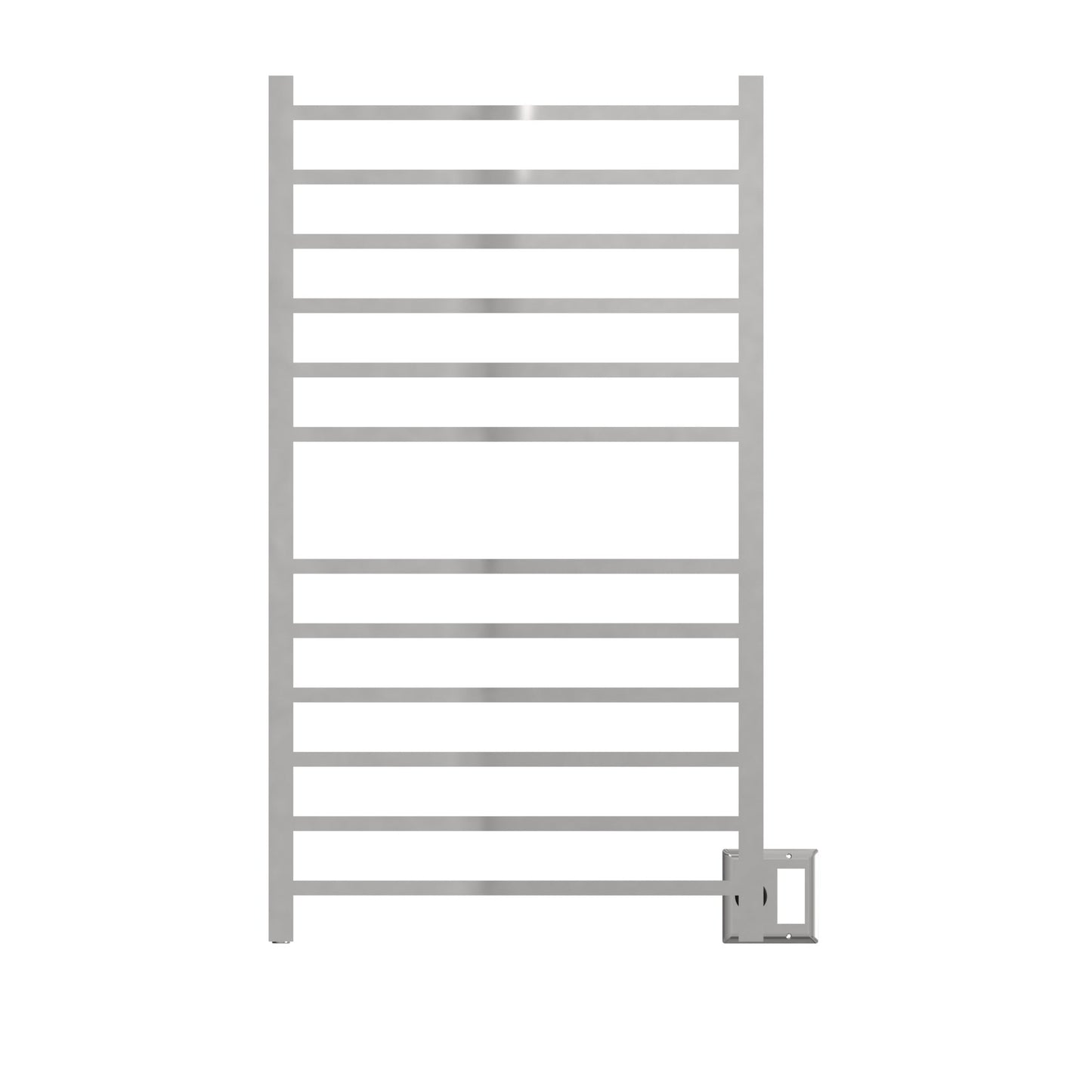 Finish Brushed Stainless Steel Number of Bars 12 Bar Shape Square Bar Type Straight Width 23.625" Height 41.75" Depth 4.75" Overall Width 24.5" Overall Height 41.75" Overall Depth 4.75" Watts 150 Amps 1.25 Volts 120 BTU 512 Towel Capacity 2 Certifications cETLus External Temperature Range 120°F - 180°F Mounting Type Wall Mount Installation Type Plug-in/Hardwire Combo Cord Length 60" Time to Heat 10 - 15 minutes Integrated Switch Yes Primary Material 304 Stainless Steel Shipping Weight 14 lbs Shipping Height 46" Shipping Length 27" Shipping Depth 4" Dimensions