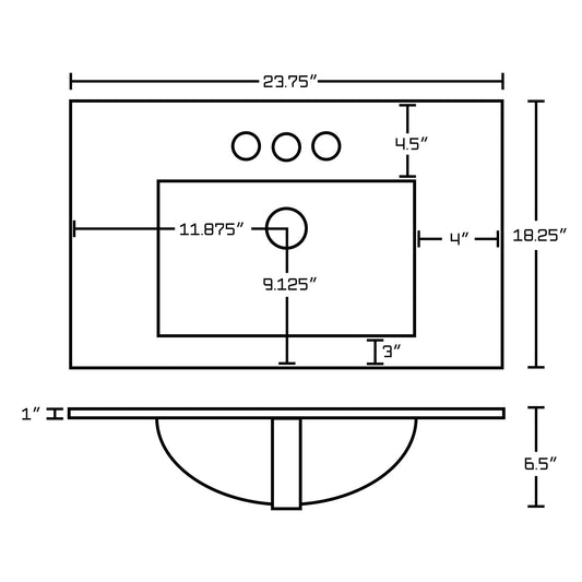 - THIS PRODUCT INCLUDE(S): 1x ceramic top in white color, 1x bathroom sink drain in chrome color. This product is a bundle (set of multiple products). This ceramic top set belongs to the roxy series. This ceramic top set features a rectangle shape with a transitional style. This product is made for drop in installation. DIY installation instructions are included in the box. This ceramic top set is designed for a 3h4-in. faucet and the faucet drilling location is on the center. Comes with an overflow for safety. This ceramic top set features 1 sink. This ceramic top set is made with ceramic. The primary color of this product is white and it comes with chrome hardware. Smooth non-porous surface; prevents from discoloration and fading. Double fired and glazed for durability and stain resistance. 1.75-in. standard USA-Canada drain opening. Constructed with lead-free brass, ensuring strength and durability. Solid bulky brass feel (not cheap and light). 23.75-in. Width (left to right). 18.25-in. Depth (back to front). 9-in. Height (top to bottom). All dimensions are nominal. This product can usually be shipped out in 1 day. Quality control approved in Canada. Each box on your order is physically opened-up and inspected to make sure only the highest quality product is shipped. We take and store photos of every single quality audit of every single order we ship. You can see them when you track your order on our website.