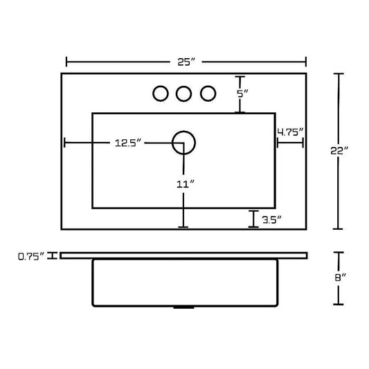 - THIS PRODUCT INCLUDE(S): 1x ceramic top in white color. This ceramic top belongs to the flair series. This ceramic top features a rectangle shape with a transitional style. This product is made for drop in installation. DIY installation instructions are included in the box. This ceramic top is designed for a 3h4-in. faucet and the faucet drilling location is on the center. Comes with an overflow for safety. This ceramic top features 1 sink. This ceramic top is made with ceramic. The primary color of this product is white and it comes with chrome hardware. Smooth non-porous surface; prevents from discoloration and fading. Double fired and glazed for durability and stain resistance. 1.75-in. standard USA-Canada drain opening. 25-in. Width (left to right). 22-in. Depth (back to front). 8-in. Height (top to bottom). All dimensions are nominal. This product can usually be shipped out in 1 day. Quality control approved in Canada. Each box on your order is physically opened-up and inspected to make sure only the highest quality product is shipped. We take and store photos of every single quality audit of every single order we ship. You can see them when you track your order on our website.