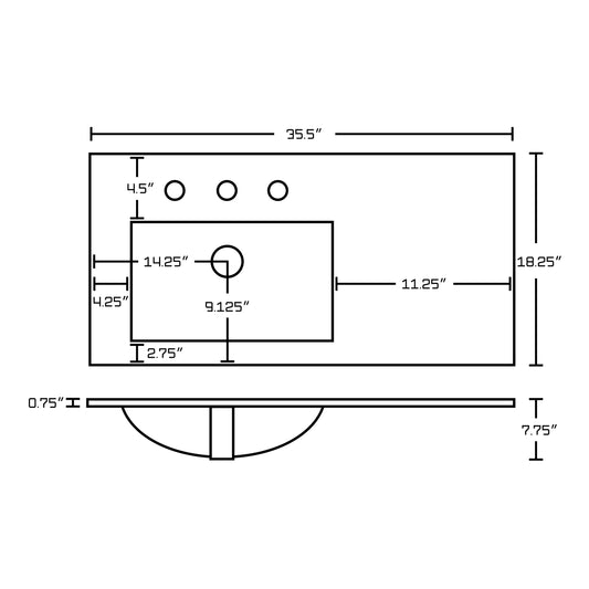 - THIS PRODUCT INCLUDE(S): 1x ceramic top in white color, 1x bathroom sink faucet in chrome color, 1x overflow cap in chrome color. This product is a bundle (set of multiple products). This ceramic top set features a rectangle shape with a transitional style. This product is made for drop in installation. DIY installation instructions are included in the box. This ceramic top set is designed for a 3h8-in. faucet and the faucet drilling location is on the left. Comes with an overflow for safety. This ceramic top set features 1 sink. This ceramic top set is made with ceramic. The primary color of this product is white and it comes with chrome hardware. Smooth non-porous surface; prevents from discoloration and fading. Double fired and glazed for durability and stain resistance. 1.75-in. standard USA-Canada drain opening. 35.5-in. Width (left to right). 18.25-in. Depth (back to front). 7.75-in. Height (top to bottom). All dimensions are nominal. This product can usually be shipped out in 1 day. Quality control approved in Canada. Each box on your order is physically opened-up and inspected to make sure only the highest quality product is shipped. We take and store photos of every single quality audit of every single order we ship. You can see them when you track your order on our website.