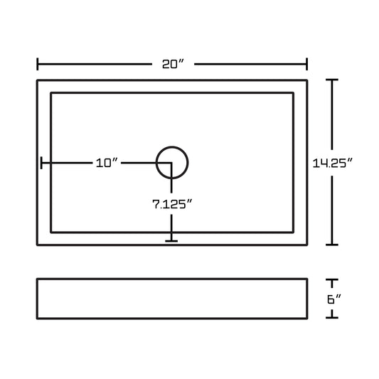 - 20-in. Width (left to right). 14.25-in. Depth (back to front). 6-in. Height (top to bottom).