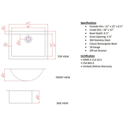 • THIS PRODUCT INCLUDE(S): 1x bathroom sink in stainless steel color. STAINLESS STEEL VANITY SINKSTRAINER HOLE IN THE BACKEXTERIOR 21 X 15 X 6 12INSIDE SIZE 18 X 12 X 6 12 This bathroom sink features a rectangle shape with a modern style. This product is made for undermount installation. DIY installation instructions are included in the box. This bathroom sink is designed for a deck mount faucet and the faucet drilling location is on the deck mount. This bathroom sink features 1 sink. The color of the undermount sink is stainless steel. This bathroom sink is made with stainless steel. The primary color of this product is stainless steel and it comes with stainless steel hardware. 21-in. Width (left to right). 15-in. Depth (back to front). 6.5-in. Height (top to bottom). All dimensions are nominal. This product can usually be shipped out in 1 day. Quality control approved in Canada. Each box on your order is physically opened-up and inspected to make sure only the highest quality product is shipped. We take and store photos of every single quality audit of every single order we ship. You can see them when you track your order on our website.