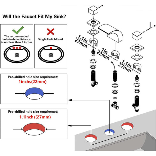 • THIS PRODUCT INCLUDE(S): 1x bathroom sink faucet in black color. THE LED WATERFALL BATHROOM FAUCET UTILIZES WATER PRESSURE TO GENERATE ELECTRICITY, ELIMINATING THE NEED FOR BATTERIES. ITS LED LIGHT CHANGES COLORS DEPENDING ON THE WATER TEMPERATURE, WITH BLUE FOR COLD, GREEN FOR WARM, AND RED FOR HOT WATER. THIS FEATURE NOT ONLY PROVIDES VISUAL PLEASURE BUT ALSO PREVENTS SCALDING, MAKING IT SAFE FOR CHILDREN AND THE ELDERLY.THE 3 HOLE BATHROOM SINK FAUCET BOASTS A CURVED WATER OUTLET THAT CREATES A LAYERED WATERFALL EFFECT, REMINISCENT OF A COUNTRYSIDE STREAM. THIS DESIGN PROVIDES A SOOTHING AND RELAXING EXPERIENCE, IDEAL FOR UNWINDING AFTER A LONG DAY.THE DECK MOUNT BATH SINK FAUCET FEATURES A UNIQUE MATTE BLACK FINISH THAT IS BOTH CLASSIC AND SIMPLE, COMPLEMENTING ANY BATHROOM DECOR. ITS BRASS CONSTRUCTION ENSURES DURABILITY AND RELIABILITY, EVEN WITH DAILY USE.THE 8-16 INCH DECK MOUNT 3 HOLE DOUBLE HANDLE WIDESPREAD BATHROOM FAUCET SET COMES WITH FOUR CONNECTING PIPES AND NECESSARY SPARE PARTS. IT IS SUITABLE FOR USE WITH VARIOUS WASHBASINS AND BATHROOM SINKS, PROVIDING FLEXIBILITY AND CONVENIENCE.OVERALL, THESE FEATURES MAKE THE LED WATERFALL BATHROOM FAUCET, 3 HOLE BATHROOM SINK FAUCET, AND DECK MOUNT BATH SINK FAUCET SET IDEAL CHOICES FOR ANYONE SEEKING A FUNCTIONAL, DURABLE, AND VISUALLY PLEASING BATHROOM FIXTURE. This bathroom sink faucet features a unique shape with a modern style. This product is made for above counter installation. DIY installation instructions are included in the box. This bathroom sink faucet is designed for a 3h8-in. faucet and the faucet drilling location is on the deck mount. This bathroom sink faucet is made with brass. The primary color of this product is black and it comes with black hardware. 4.53-in. Width (left to right). 3.1-in. Depth (back to front). 3.5-in. Height (top to bottom). All dimensions are nominal. This product can usually be shipped out in 1-5 day. Quality control approved in Canada. Each box on your order is physically opened-up and inspected to make sure only the highest quality product is shipped. We take and store photos of every single quality audit of every single order we ship. You can see them when you track your order on our website.
