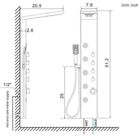 - THIS PRODUCT INCLUDE(S): 1x shower panel in silver color. THIS SHOWER PANEL IS A MULTI-FUNCTION 4-IN-1 SHOWER SYSTEM THAT INCLUDES A RAINFALL SHOWER, WATERFALL SHOWER, BODY MASSAGE SPRAY JETS, AND HANDHELD SHOWER TO SOOTHE YOUR MUSCLES AND HELP YOU RELAX. THE RAINFALL AND WATERFALL SHOWER COMBO ALLOWS YOU TO ENJOY A FULL-BODY COVERAGE WITHOUT HAVING TO TURN AROUND, WHILE THE SHOWER HEAD WITH RUBBER NOZZLES MAKES IT EASY TO CLEAN. THERE ARE 5 ANGLE-ADJUSTABLE BODY SPRAYS THAT ACT AS A HYDRO MASSAGE, HELPING YOU TO REDUCE STRESS, AND THE 3-FUNCTION SHOWER WAND COMES WITH A FLEXIBLE SHOWER HOSE FOR CONVENIENT USAGE. THE SHOWER PANEL IS MADE OF PREMIUM QUALITY MATERIALS SUCH AS A 304 STAINLESS STEEL THICKENED PANEL, BRASS MIXING VALVE, AND EXPLOSION-PROOF HOSES, MAKING IT STABLE AND RELIABLE. ADDITIONALLY, THE ELEGANT BRUSHED SURFACE IS ANTI-RUST AND FINGER-PROOF. USING THE SHOWER PANEL IS EASY, AS THERE ARE 5 SHOWER KNOBS FROM TOP TO BOTTOM. SIMPLY ROTATE THE TOP 4 SHOWER KNOBS ANTICLOCKWISE TO TURN ON THE SHOWERS, WHICH CAN RUN SEPARATELY OR SIMULTANEOUSLY. THEN, USE THE BOTTOM KNOB TO ADJUST THE SHOWER TEMPERATURE AND VOLUME. This shower panel features a rectangle shape with a modern style. This product is made for wall mount installation. DIY installation instructions are included in the box. This shower panel is made with stainless steel-brass. The primary color of this product is silver and it comes with stainless steel hardware. Constructed with lead-free brass, ensuring strength and durability. Solid bulky brass feel (not cheap and light). 10.35-in. Width (left to right). 8.66-in. Depth (back to front). 52.87-in. Height (top to bottom). All dimensions are nominal. This product can usually be shipped out in 1-5 day. Quality control approved in Canada. Each box on your order is physically opened-up and inspected to make sure only the highest quality product is shipped. We take and store photos of every single quality audit of every single order we ship. You can see them when you track your order on our website.