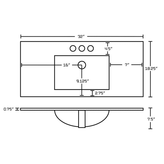 - THIS PRODUCT INCLUDE(S): 1x ceramic top in white color. This ceramic top belongs to the flair series. This ceramic top features a rectangle shape with a transitional style. This product is made for drop in installation. DIY installation instructions are included in the box. This ceramic top is designed for a 3h4-in. faucet and the faucet drilling location is on the center. Comes with an overflow for safety. This ceramic top features 1 sink. This ceramic top is made with ceramic. The primary color of this product is white and it comes with chrome hardware. Smooth non-porous surface; prevents from discoloration and fading. Double fired and glazed for durability and stain resistance. 1.75-in. standard USA-Canada drain opening. 32-in. Width (left to right). 18.25-in. Depth (back to front). 7.5-in. Height (top to bottom). All dimensions are nominal. This product can usually be shipped out in 1 day. Quality control approved in Canada. Each box on your order is physically opened-up and inspected to make sure only the highest quality product is shipped. We take and store photos of every single quality audit of every single order we ship. You can see them when you track your order on our website.
