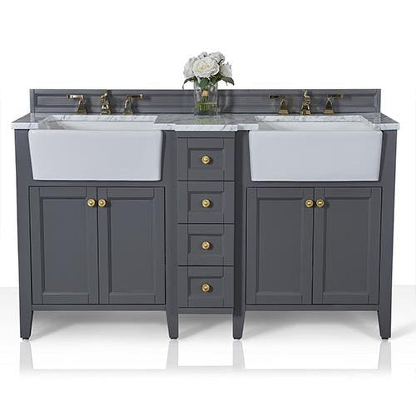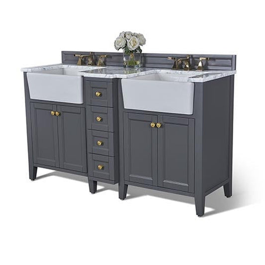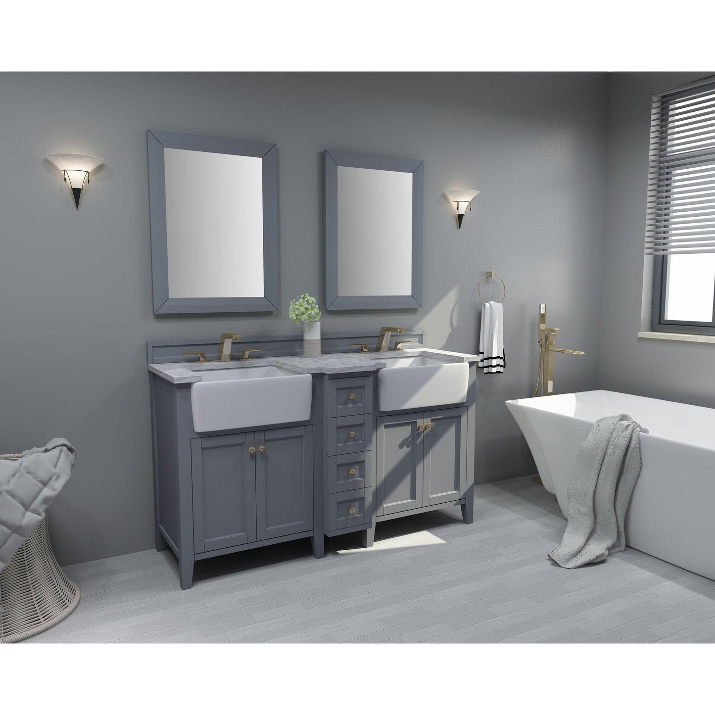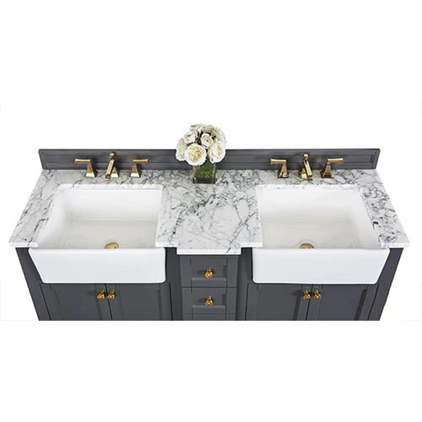 Ancerre Designs Adeline 60" 4-Door 4-Drawer Sapphire Gray Bathroom Vanity With White Marble Vanity Top, White Farmhouse Double Ceramic Sinks, 4" Solid Wood Backsplash and Satin Brushed Gold Hardware