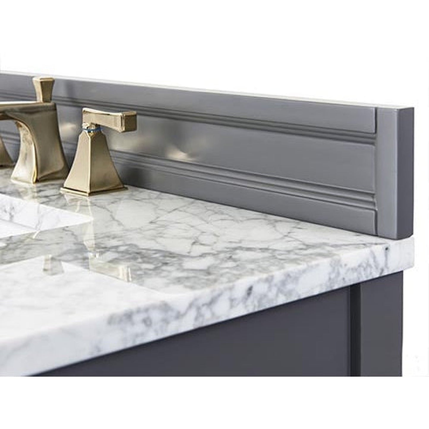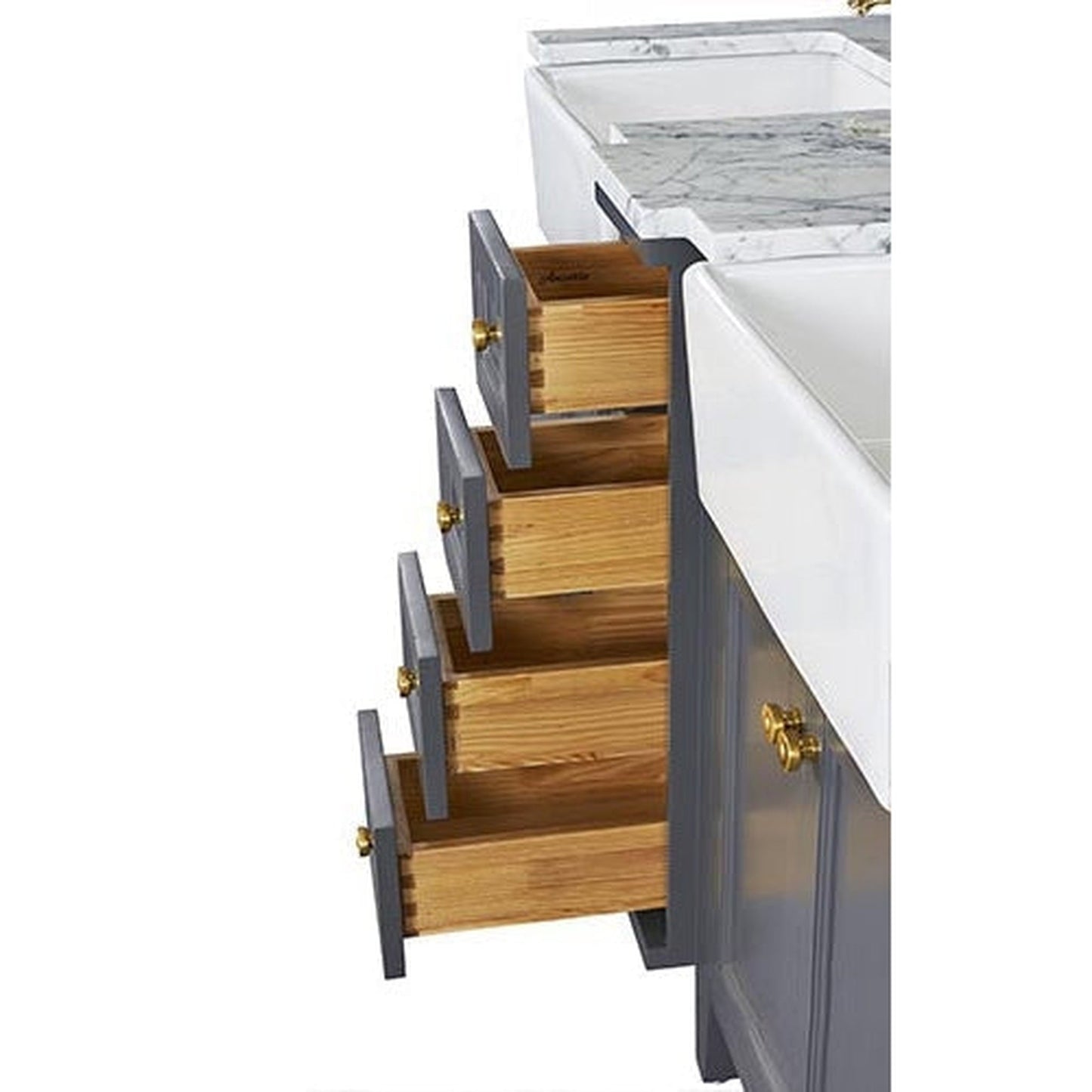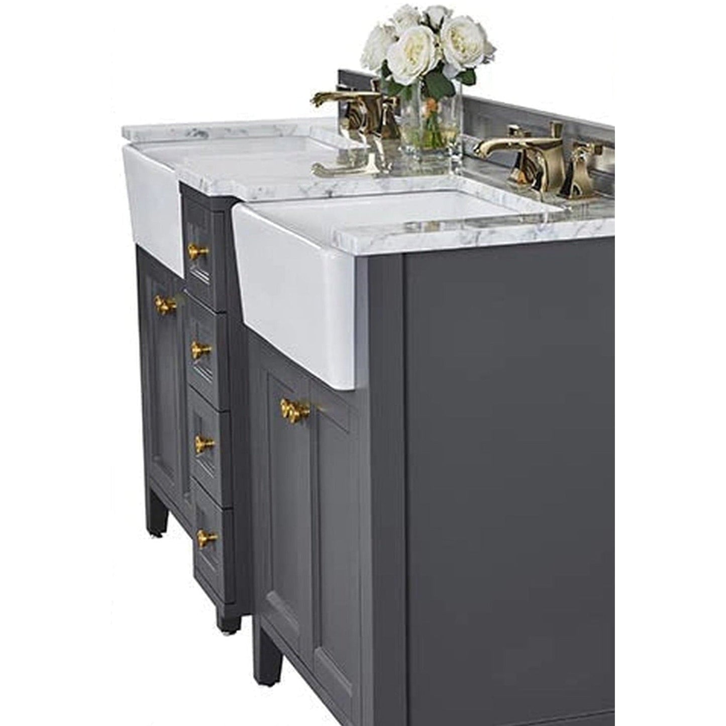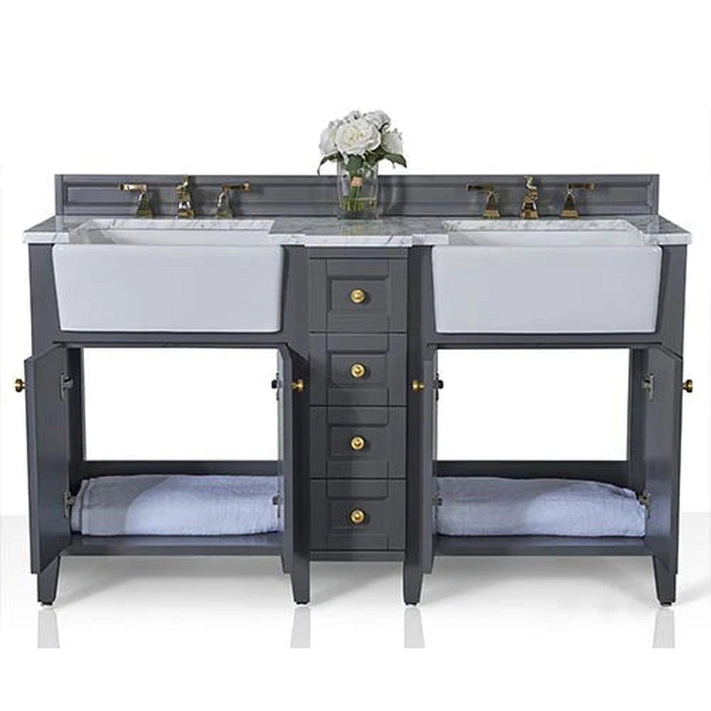 Ancerre Designs Adeline 60" 4-Door 4-Drawer Sapphire Gray Bathroom Vanity With White Marble Vanity Top, White Farmhouse Double Ceramic Sinks, 4" Solid Wood Backsplash and Satin Brushed Gold Hardware