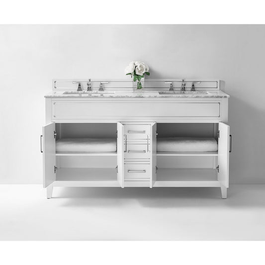 Ancerre Designs Aspen 60" 4-Door 3-Drawer White Bathroom Vanity Set With White Marble Vanity Top, Double Undermount Ceramic Sinks, 4" Solid Wood Backsplash and Chrome Hardware