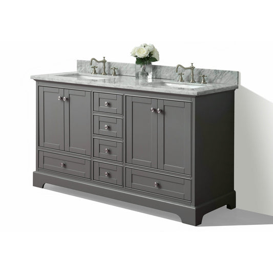 Ancerre Designs Audrey 72" 4-Door 6-Drawer Sapphire Gray Bathroom Vanity With White Marble Vanity Top, Double Undermount Ceramic Sink, 4 Solid Wood Backsplash and Brushed Nickel Finish Hardware