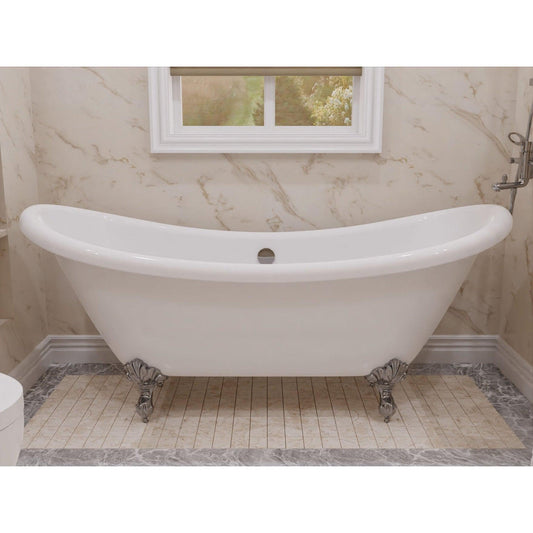 Classic, contemporary and chic all in one, our beautiful Belissima claw foot tub makes a bold statement of style for any bathroom. Soft, sleek lines culminate in a gentle roll around the rim, complimented by the striking contrast of chrome claw feet. The Double slipper design positions faucet and drain in the middle of the tub, giving you the freedom to lounge on either side. Our expert craftsmanship is backed by a limited lifetime warranty that guarantees you’ll enjoy your tub for years to come.