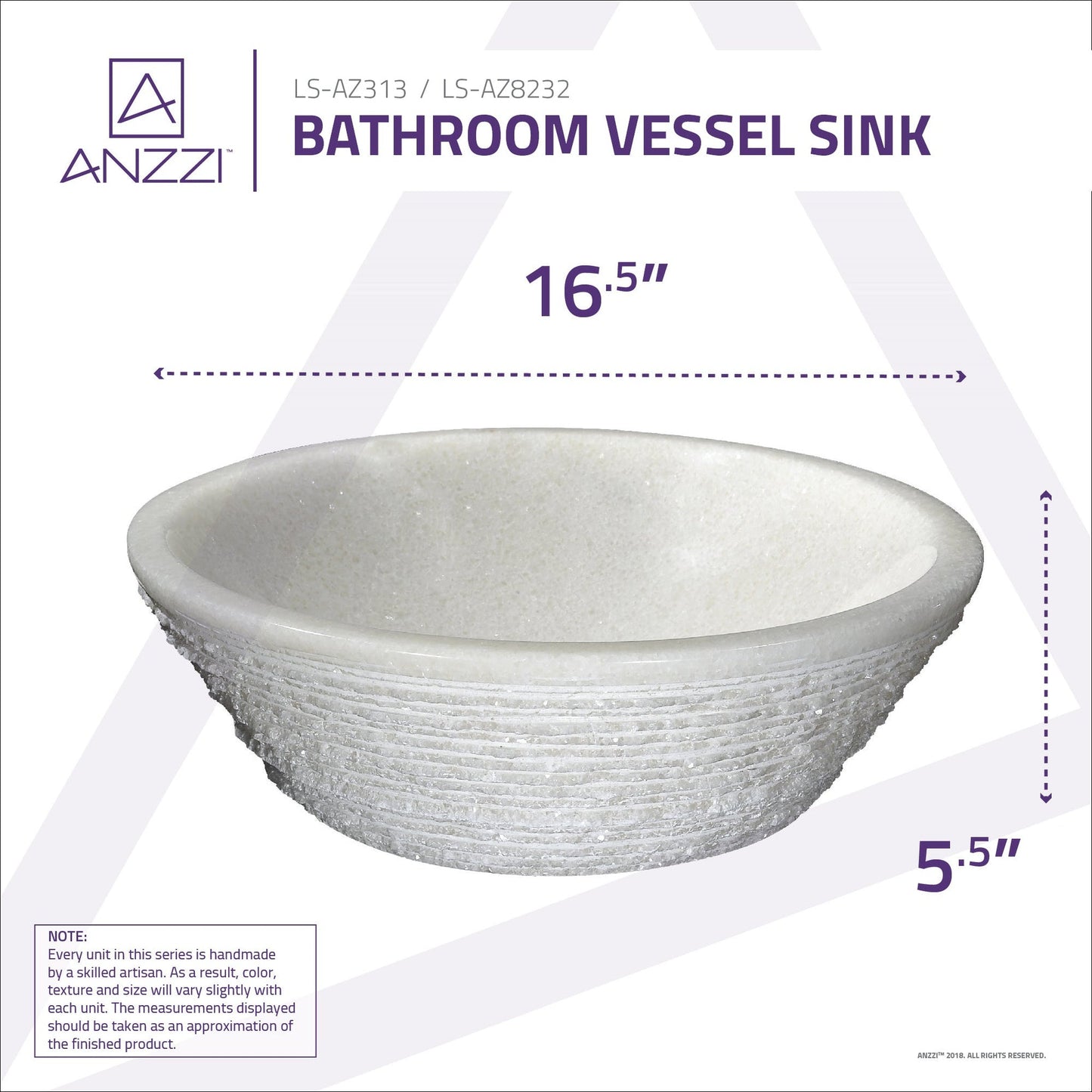 - Each natural ANZZI STONE vessel sink is handcrafted and unique so dimensions and textures may vary