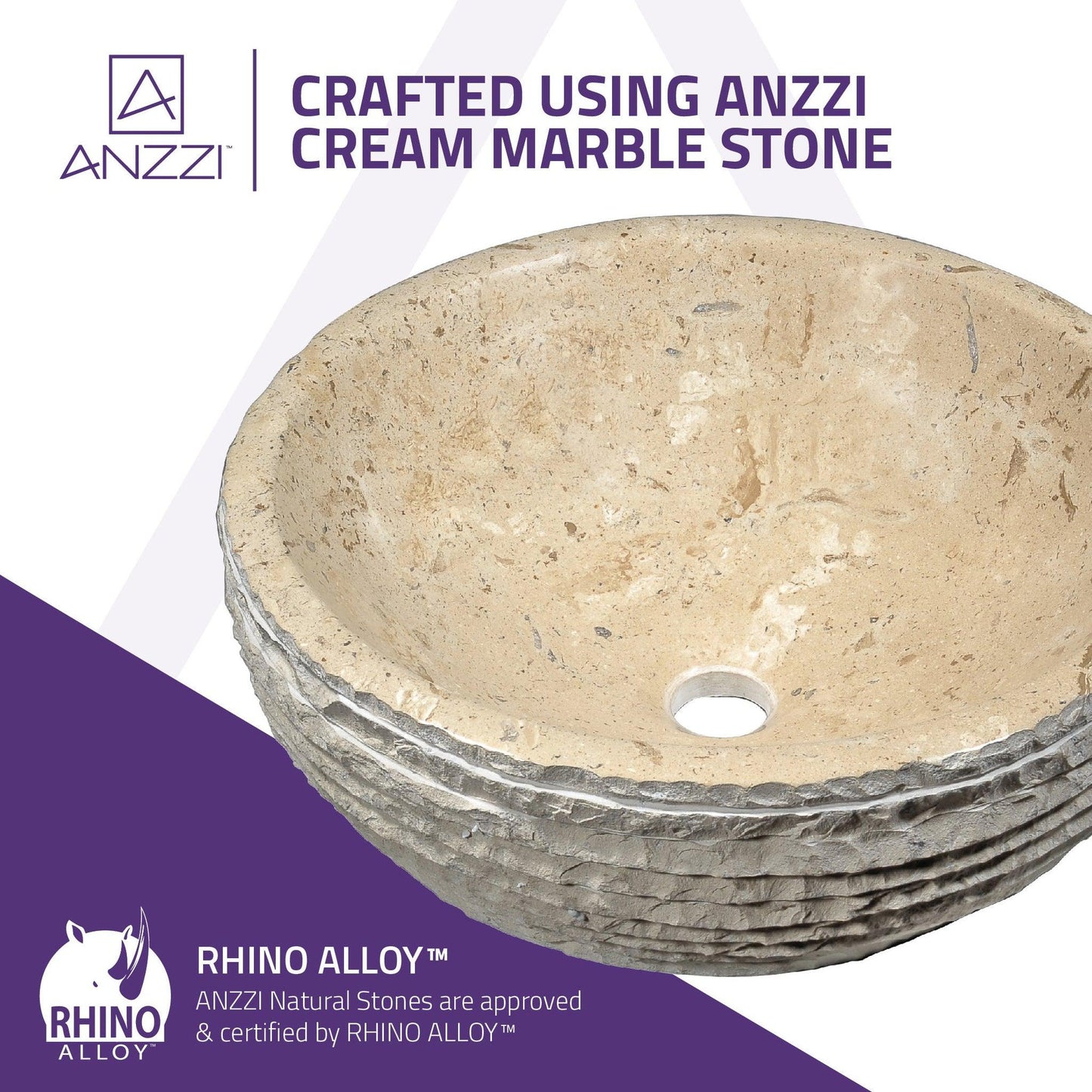 Introducing the ANZZI Desert Basin Classic Cream Marble handcrafted natural stone bathroom sink. Crafted from handpicked, RHINO ALLOY certified samples of Classic Cream Marble ANZZI STONE the Desert Basin is handcrafted and polished to exquisite perfection. ANZZI continues its tradition of introducing rising European trends to the North American market. The natural beauty of this sublime sedimentary sink complements many modern bathroom décor and styles..