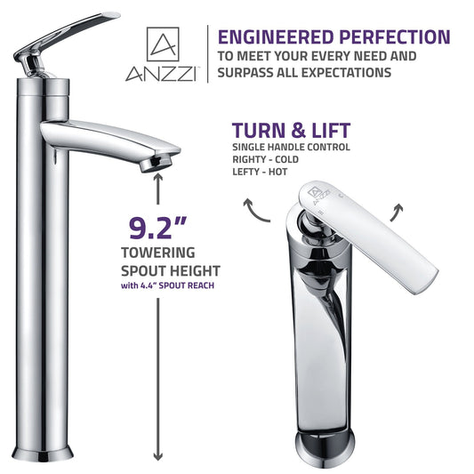 ANZZI is committed to introducing the latest in European bath fixture design to the North American home. ANZZI presents the Fifth Series Single Handle Vessel Sink Faucet. Crafted using lead-free RHINO ALLOY certified brass as the interior and our traditional chrome rust resistant finish. This all metal combination of high quality materials ensures you will enjoy a flawlessly performing faucet for many years to come. The deceptively simple single handle design allows for complete and easy control of both water flow and temperature while maintaining the fine minimalist aesthetic to match with any modern or contemporary decor style. The ANZZI Fifth Series is listed certified under cUPC, NSF, AB1953, Watersense for installation within North America.