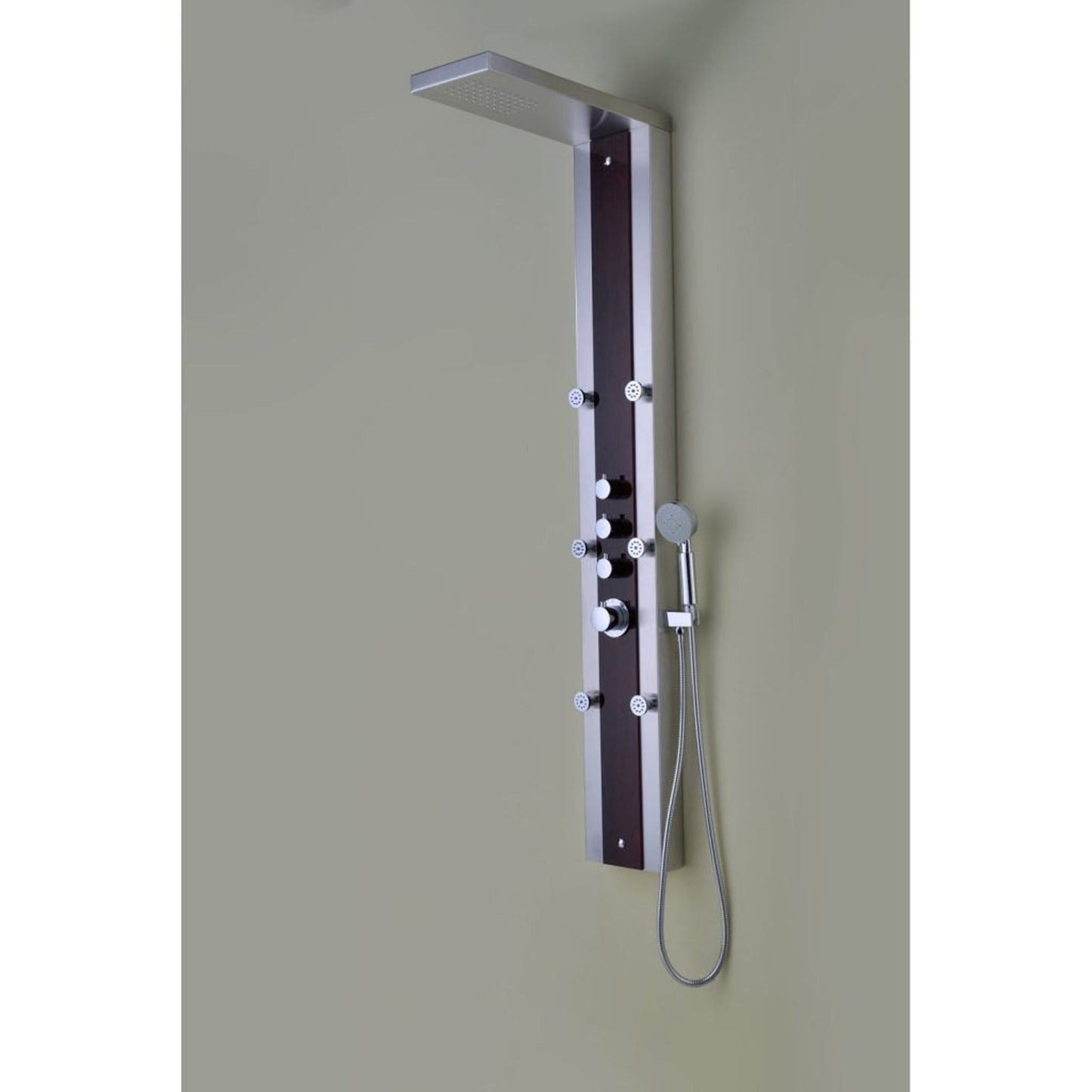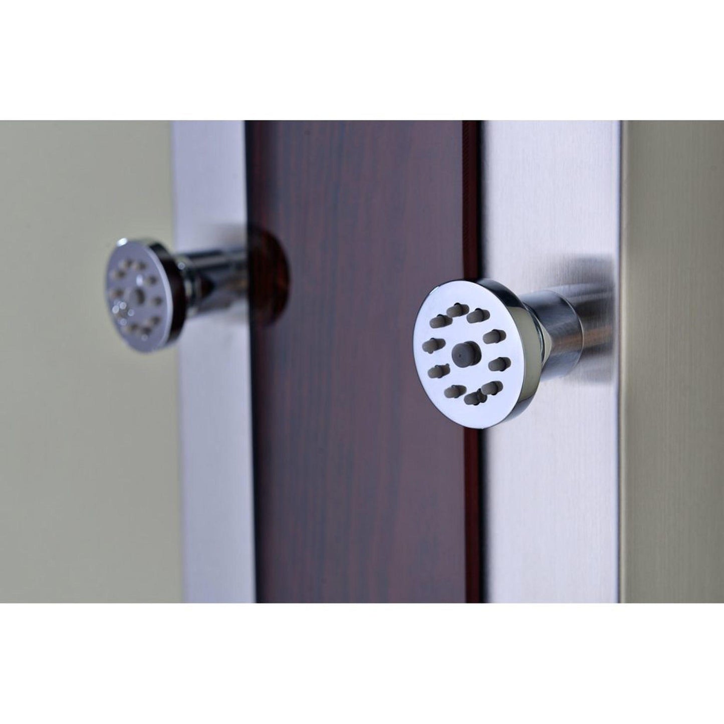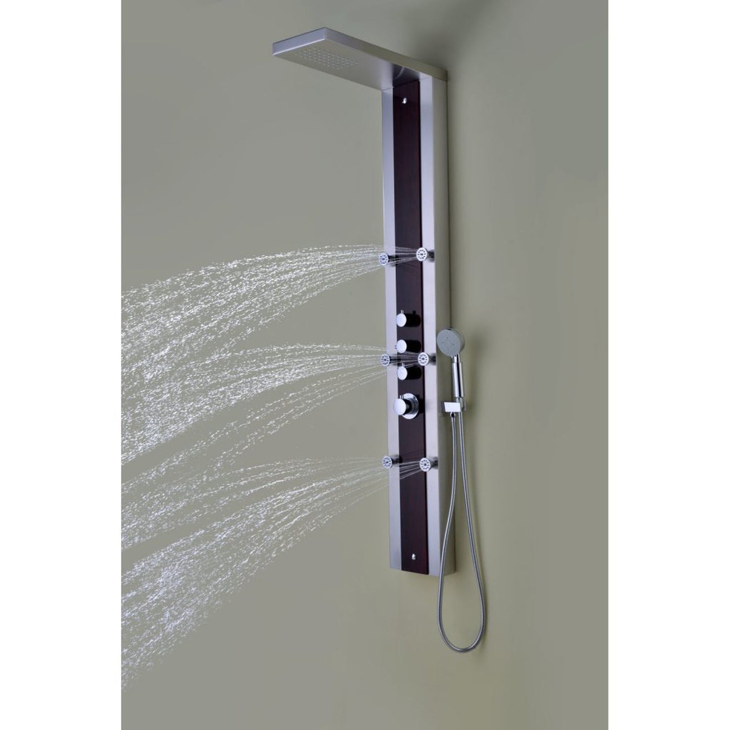The ANZZI Full Body Kiki Shower Panel features hard edged 90 degree modernist angles in a rich mahogany style finish with Tempered Deco-Glass and accented with high polished chrome stainless steel trimming. Six high polished chrome plated swiveling ACU-Stream body jets provide a relaxing yet powerful water stream to massage the body. The fixed Heavy Rain shower head hangs overhead releasing a steady torrent of soothing water from above. And finally, always positioned at the column’s flank is the Euro-Grip hand held sprayer with free reign reach of up to 60 inches. And everything is control through four polished chrome plated thermostatic and diverter knobs.