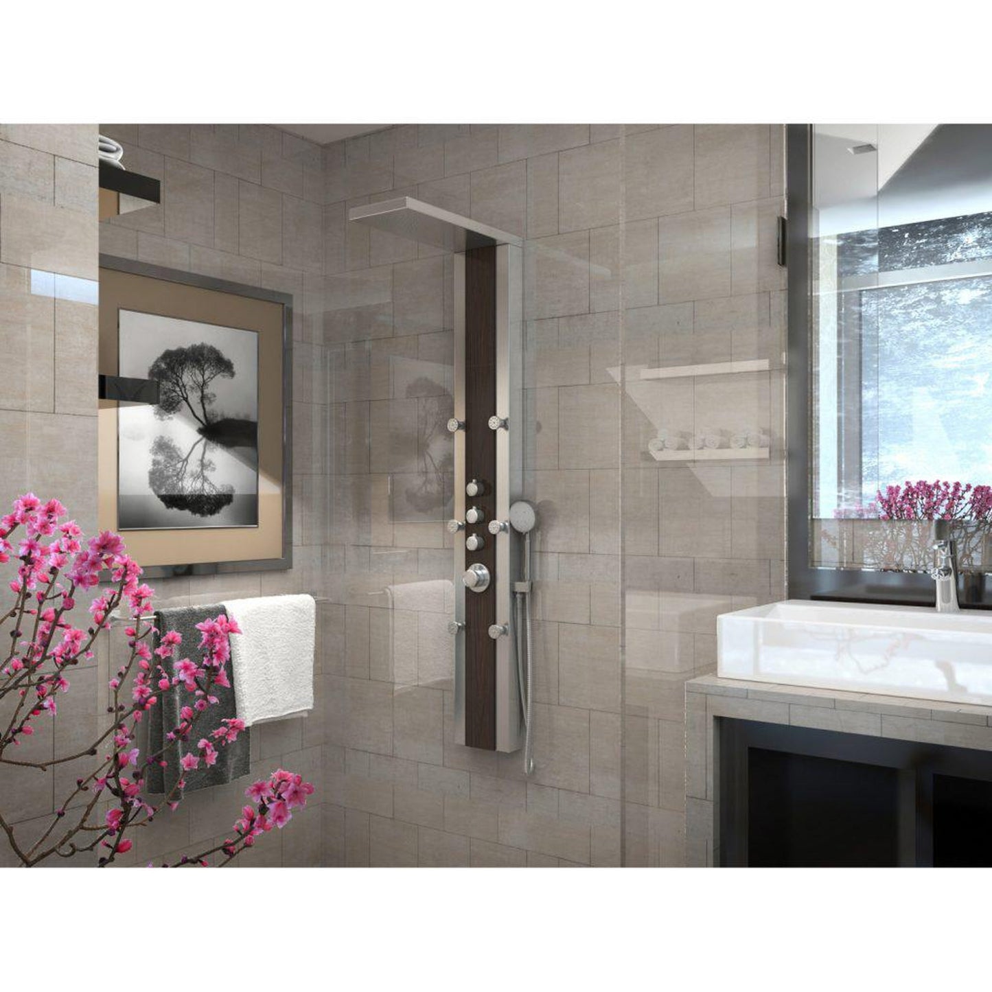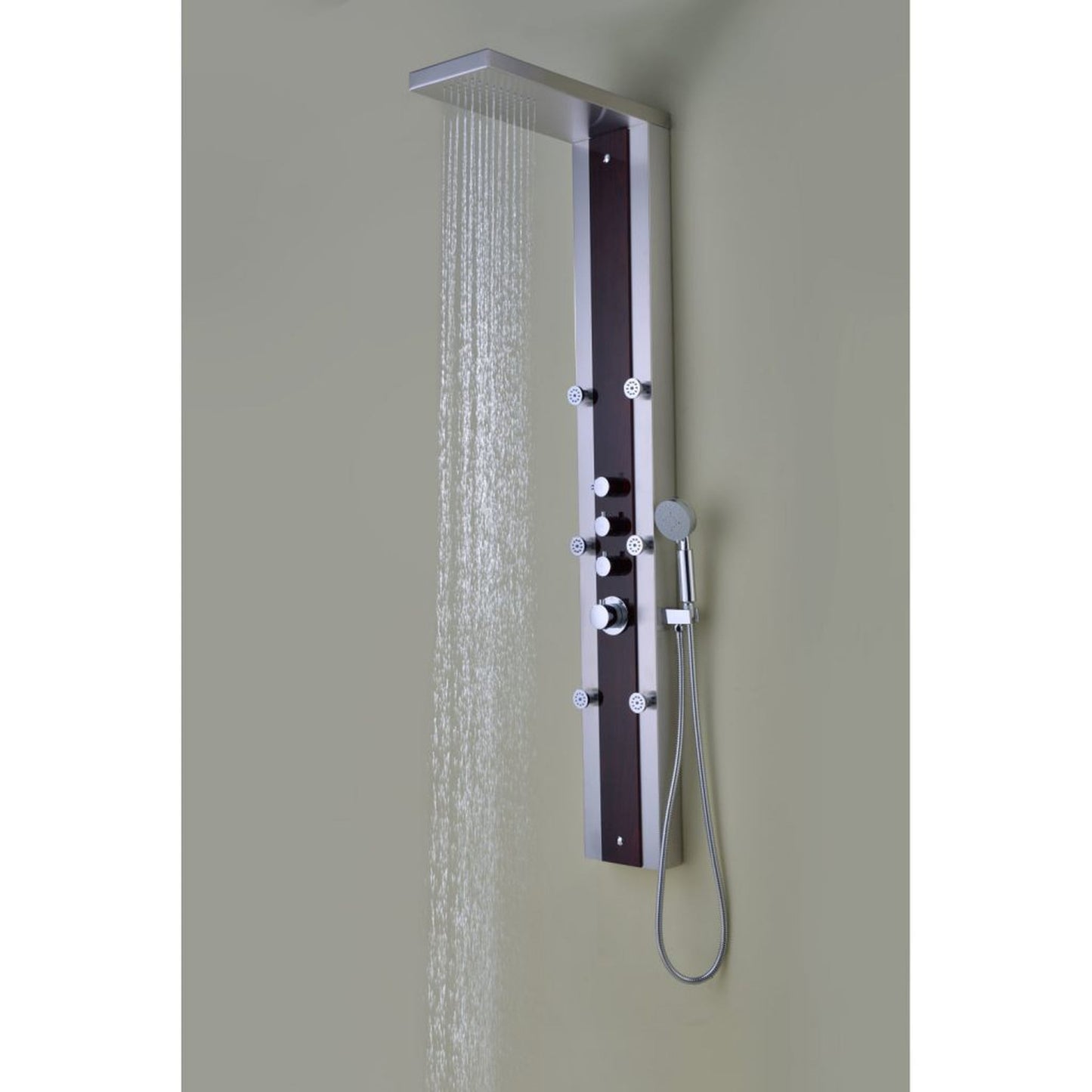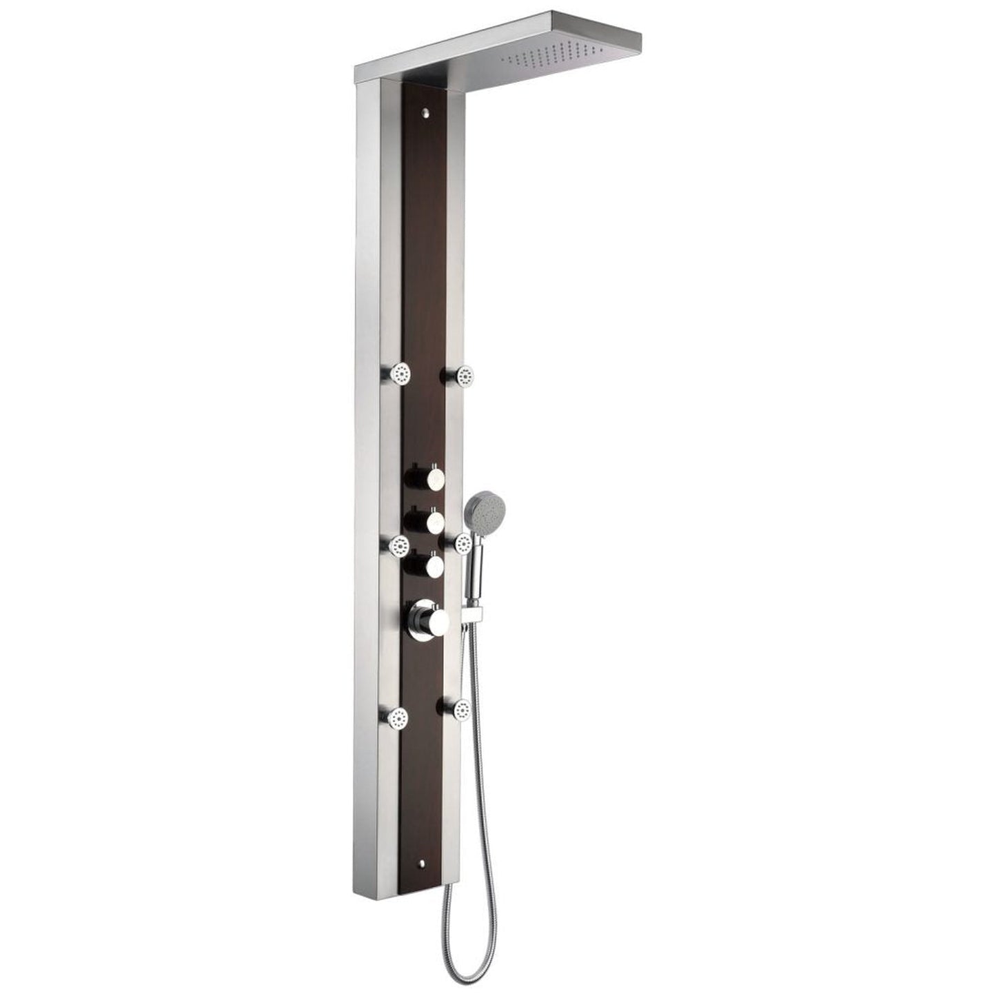 The ANZZI Full Body Kiki Shower Panel features hard edged 90 degree modernist angles in a rich mahogany style finish with Tempered Deco-Glass and accented with high polished chrome stainless steel trimming. Six high polished chrome plated swiveling ACU-Stream body jets provide a relaxing yet powerful water stream to massage the body. The fixed Heavy Rain shower head hangs overhead releasing a steady torrent of soothing water from above. And finally, always positioned at the column’s flank is the Euro-Grip hand held sprayer with free reign reach of up to 60 inches. And everything is control through four polished chrome plated thermostatic and diverter knobs.