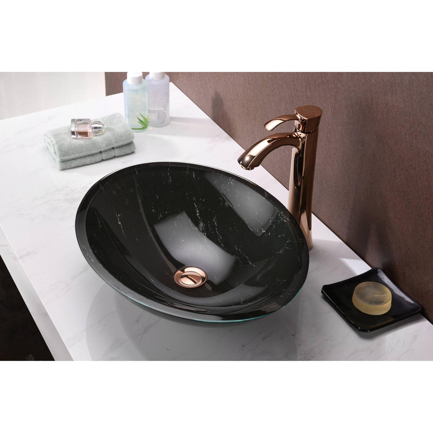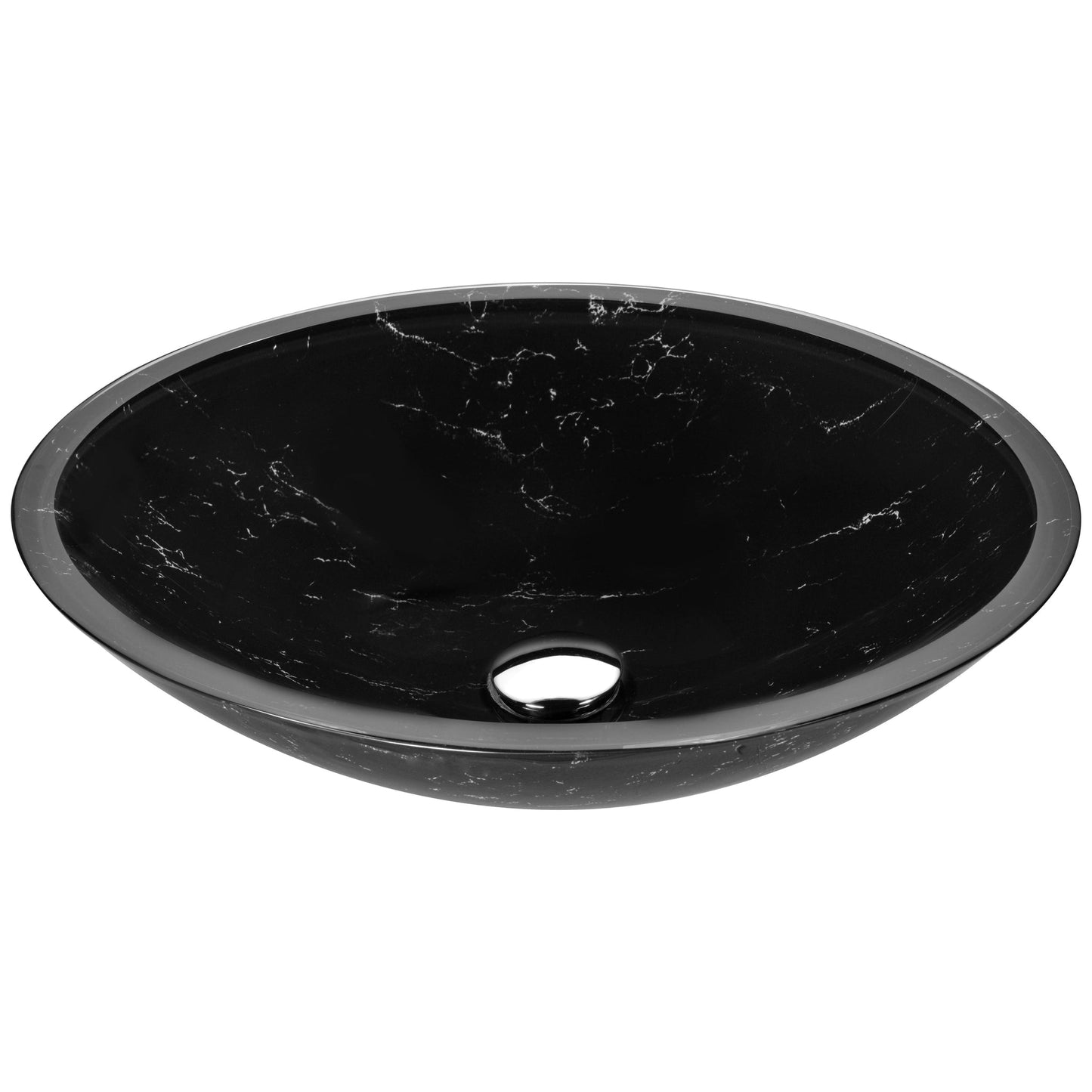 ANZZI Marbela Series 20" x 16" Oval Shaped Marbled Black Deco-Glass Vessel Sink With Polished Chrome Pop-Up Drain