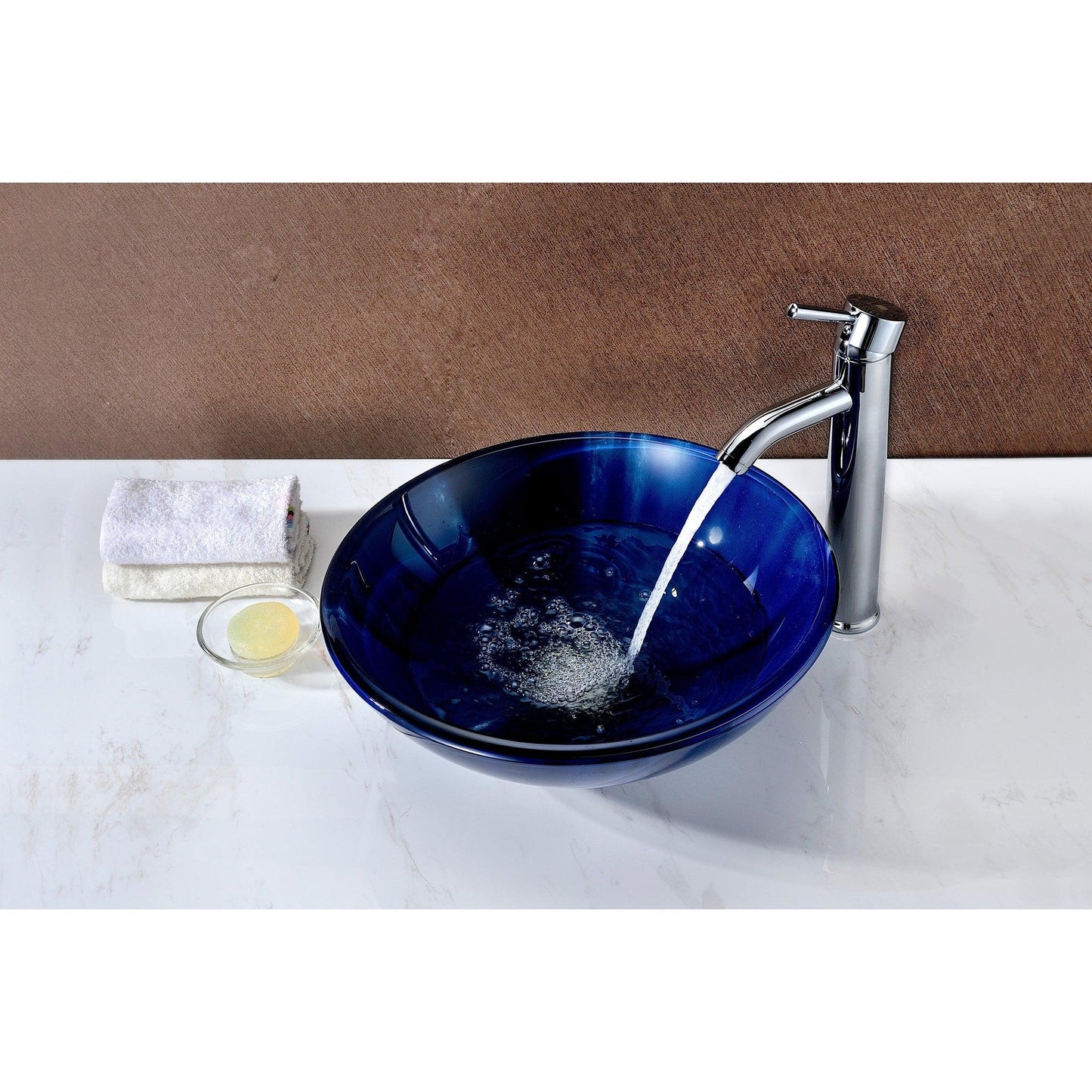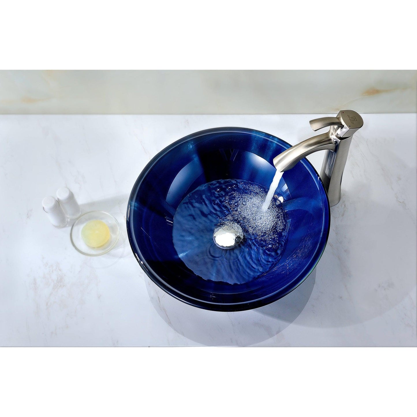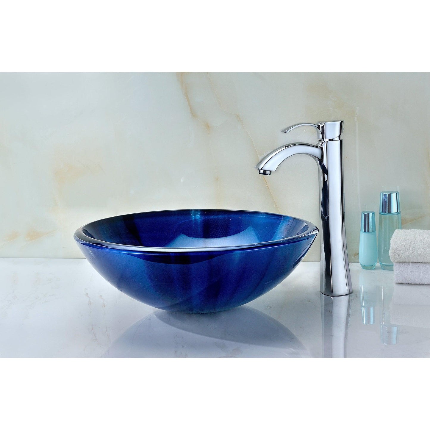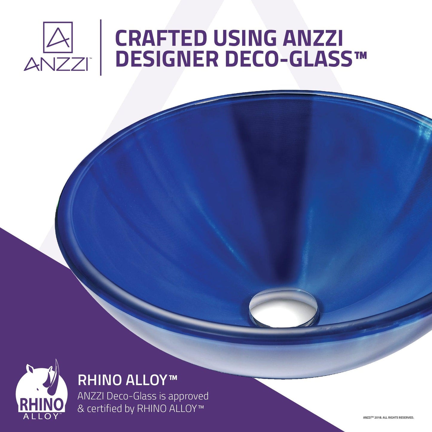 The ANZZI Meno Series sink is a traditionally crafted round vessel sink adorned in a Lustrous Blue Finish. Each ANZZI vessel sink is formed using RHINO ALLOY certified high tempered Deco-Glass material. The result is a dynamically shaped and captivating vessel centerpiece for any bathroom counter.