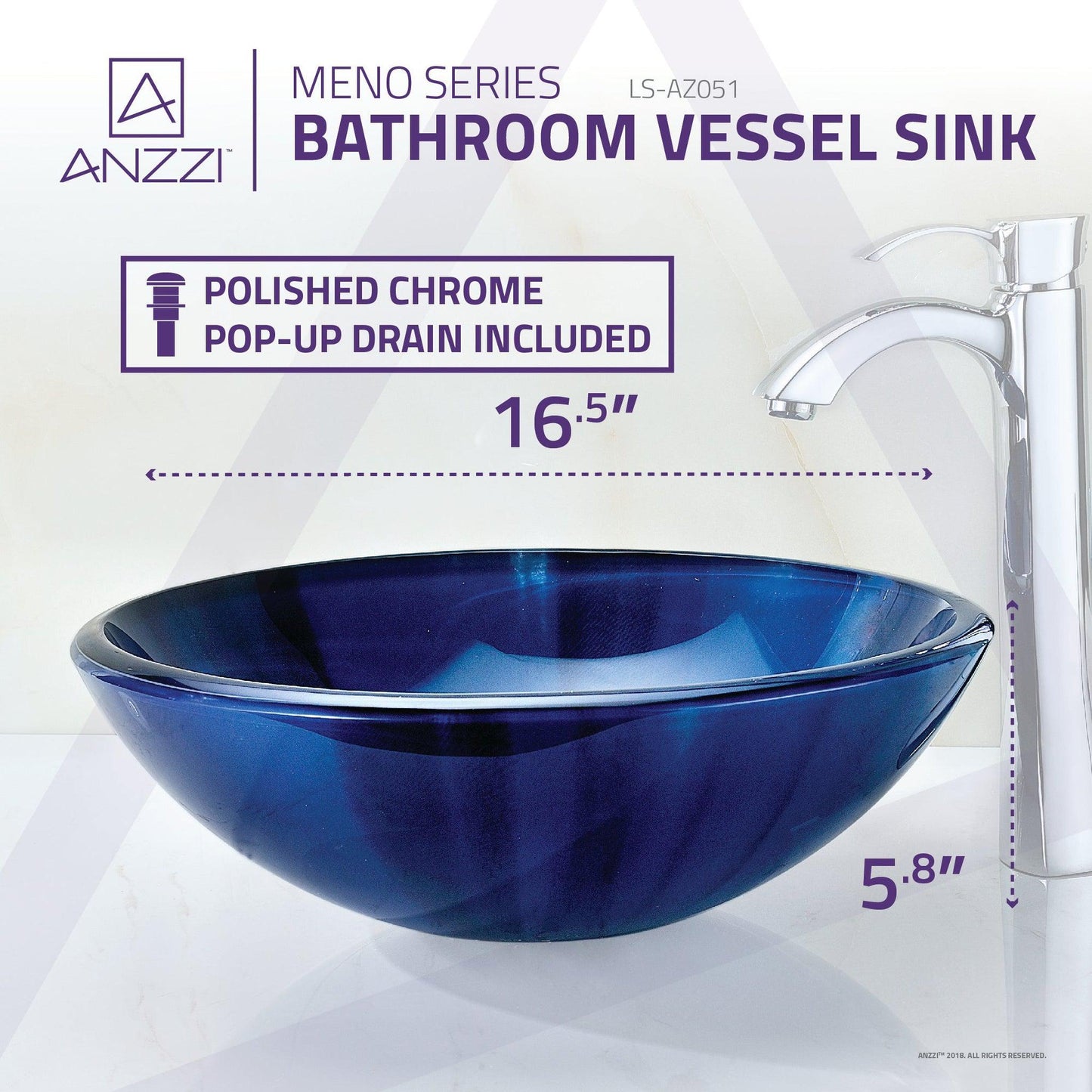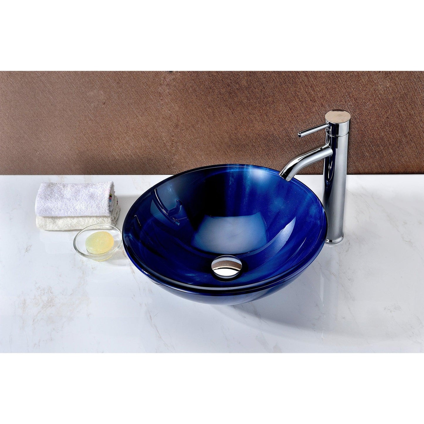 ANZZI Meno Series 17" x 17" Round Lustrous Blue Deco-Glass Vessel Sink With Polished Chrome Pop-Up Drain