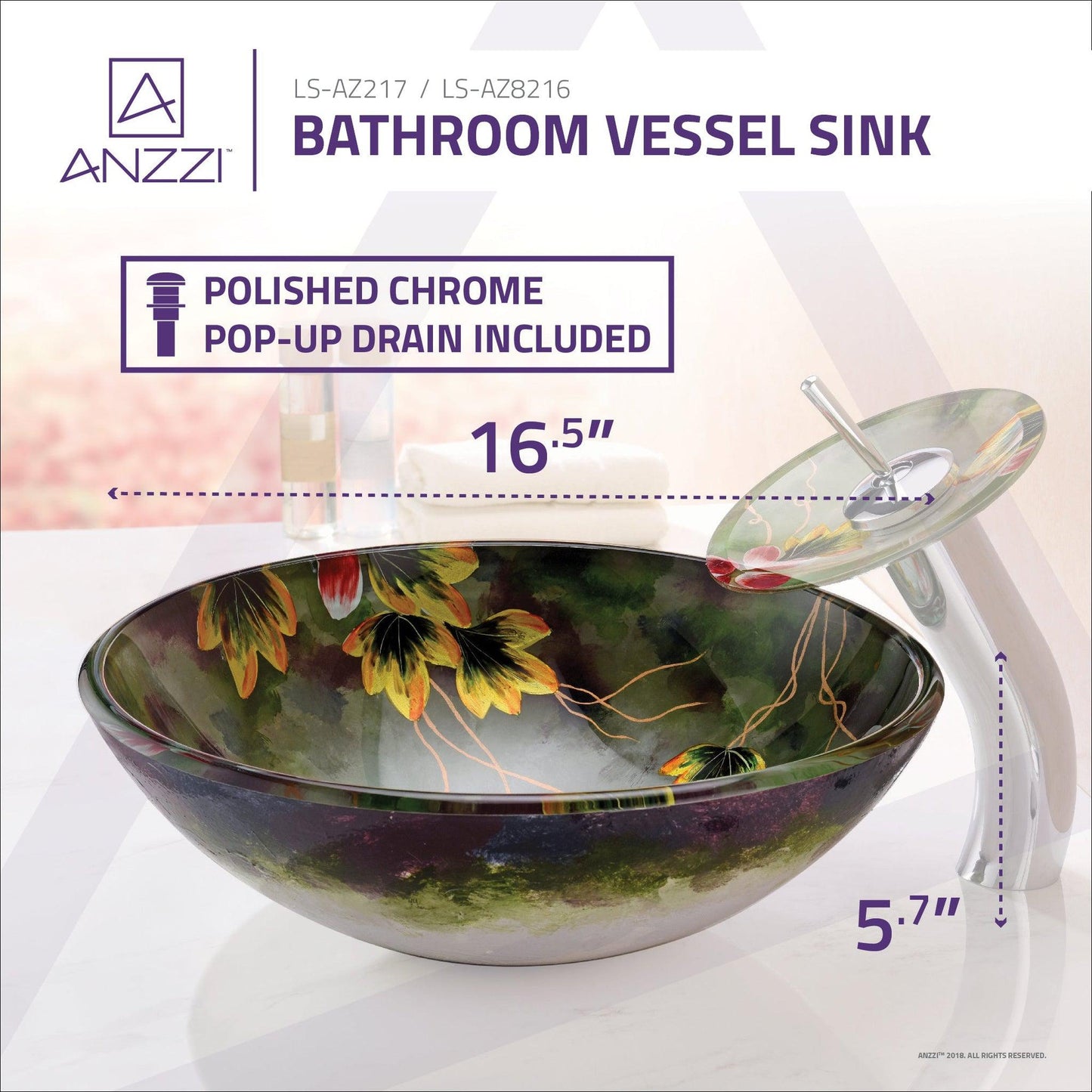 ANZZI Panye Series 17" x 17" Round Green Hand Painted Mural Deco-Glass Vessel Sink With Polished Chrome Pop-Up Drain and Waterfall Faucet
