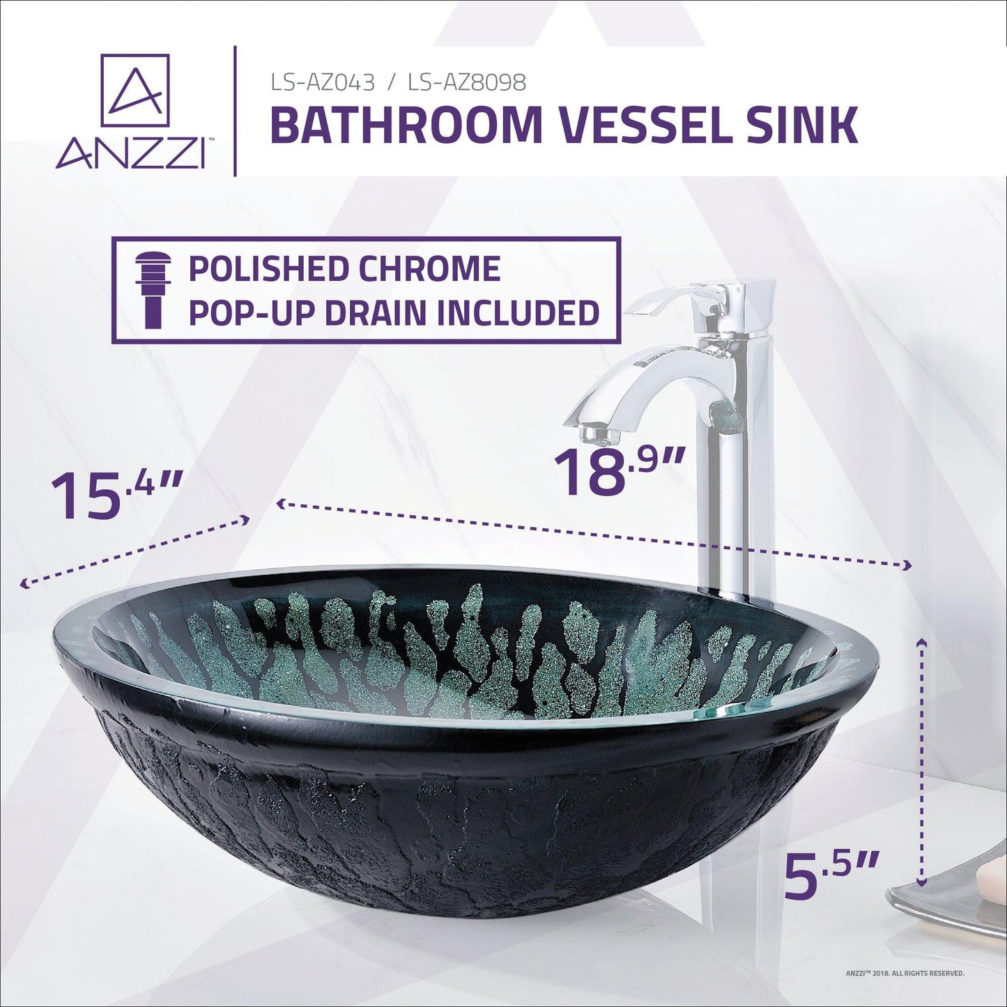 ANZZI Patuvendi Series 19" x 16" Oval Shaped Lustrous Black Deco-Glass Vessel Sink With Polished Chrome Pop-Up Drain