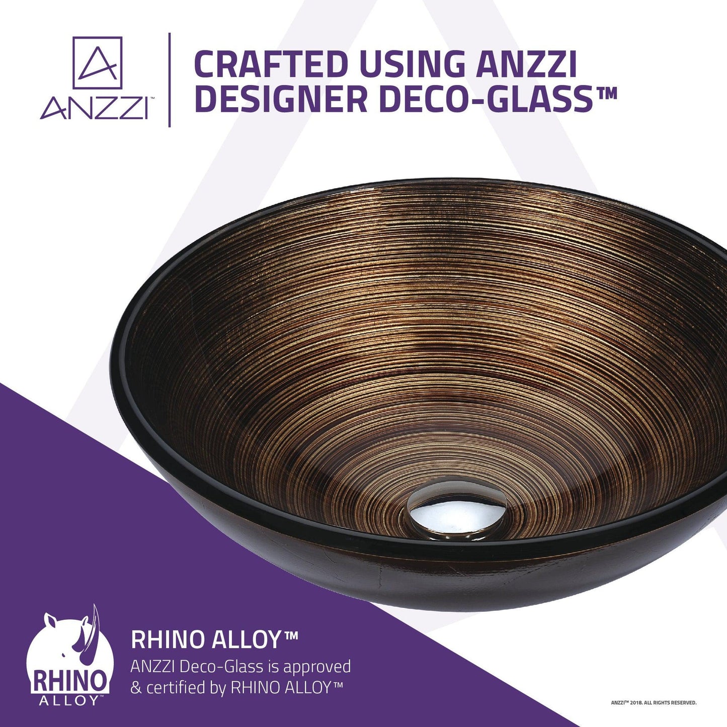 The ANZZI Posh Series sink is a traditionally crafted round vessel sink adorned in a Radial Umber finish. Each ANZZI vessel sink is formed using RHINO ALLOY certified high tempered Deco-Glass material. The result is an elegantly shaped and captivating vessel centerpiece for any bathroom counter.