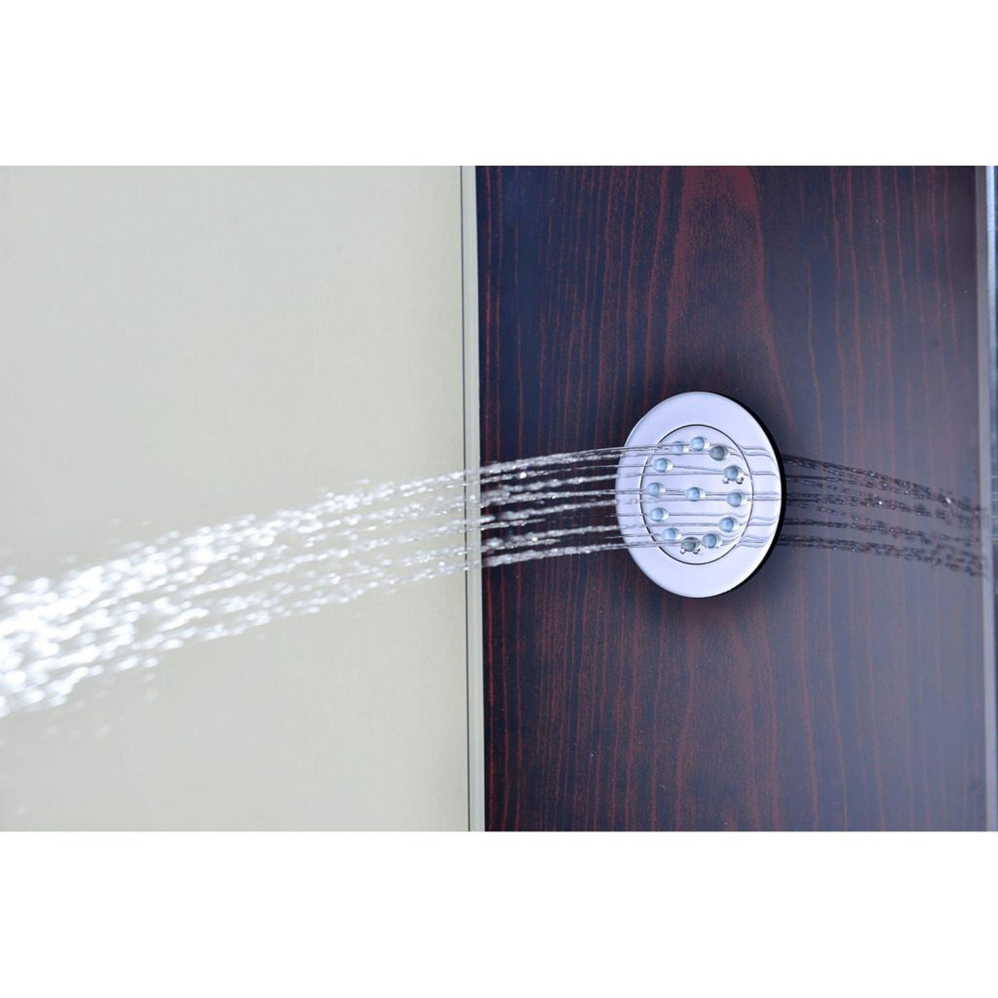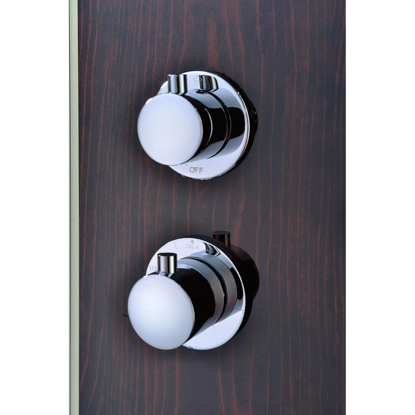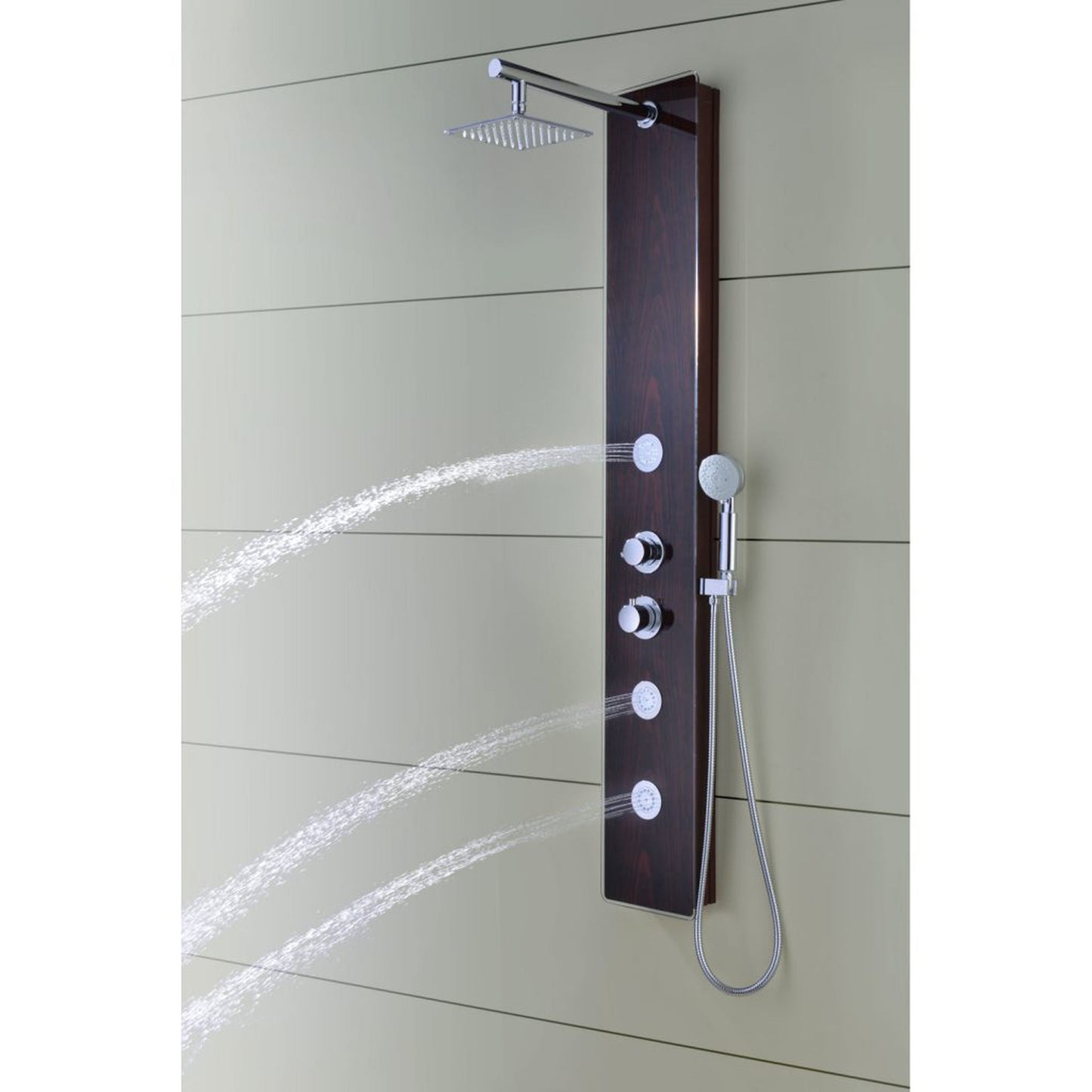 The ANZZI Full Body Pure Shower Panel features hard edged 90 degree modernist angles with a rich Mahogany styled finish protected by a Tempered Deco-Glass facing. Three polished chrome plated fixed Acu-Stream body jets provide powerful and evenly dispersed streams to massage the body. The swiveling Heavy Rain shower head hangs overhead releasing a steady torrent of soothing water from above. And finally, always positioned at the column’s flank is the Euro-Grip hand held sprayer with free reign reach of up to 60 inches. And everything is control through the two polished chrome plated thermostatic and diverter knobs.