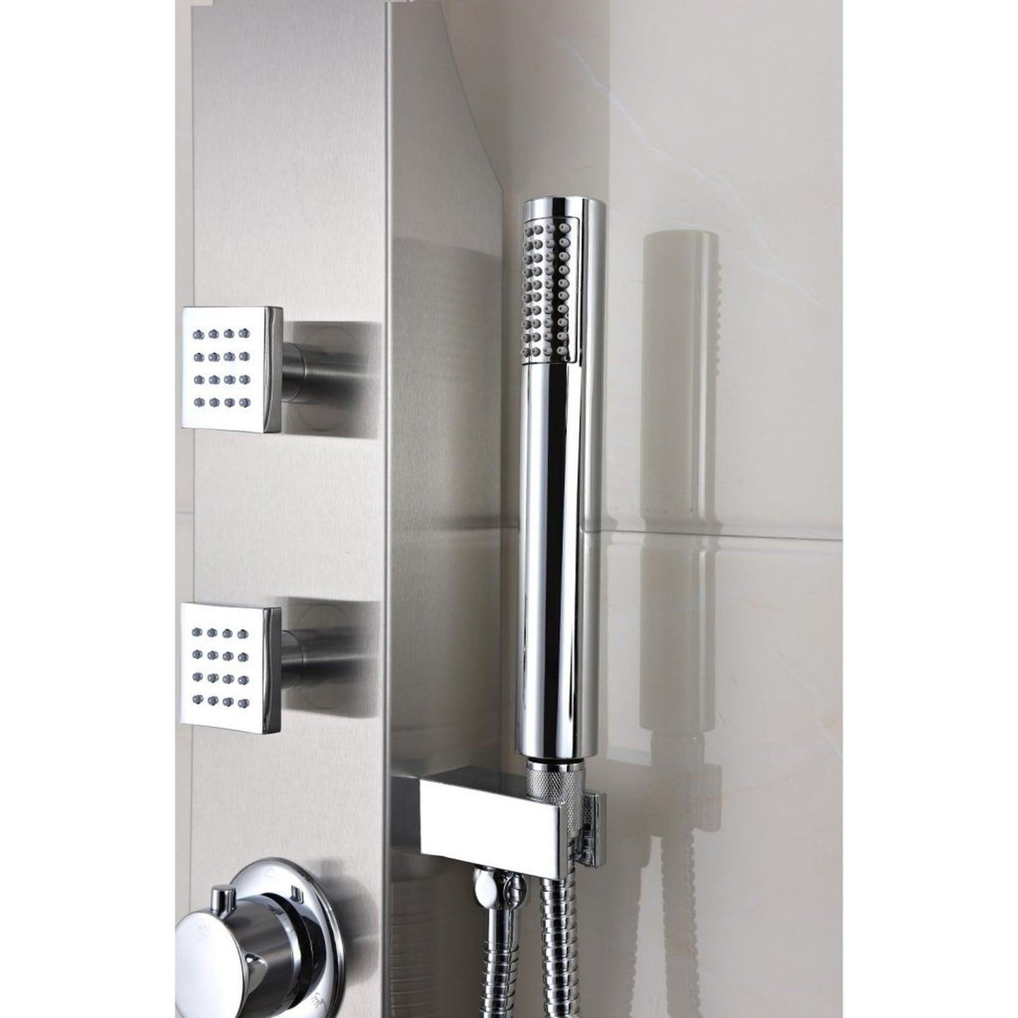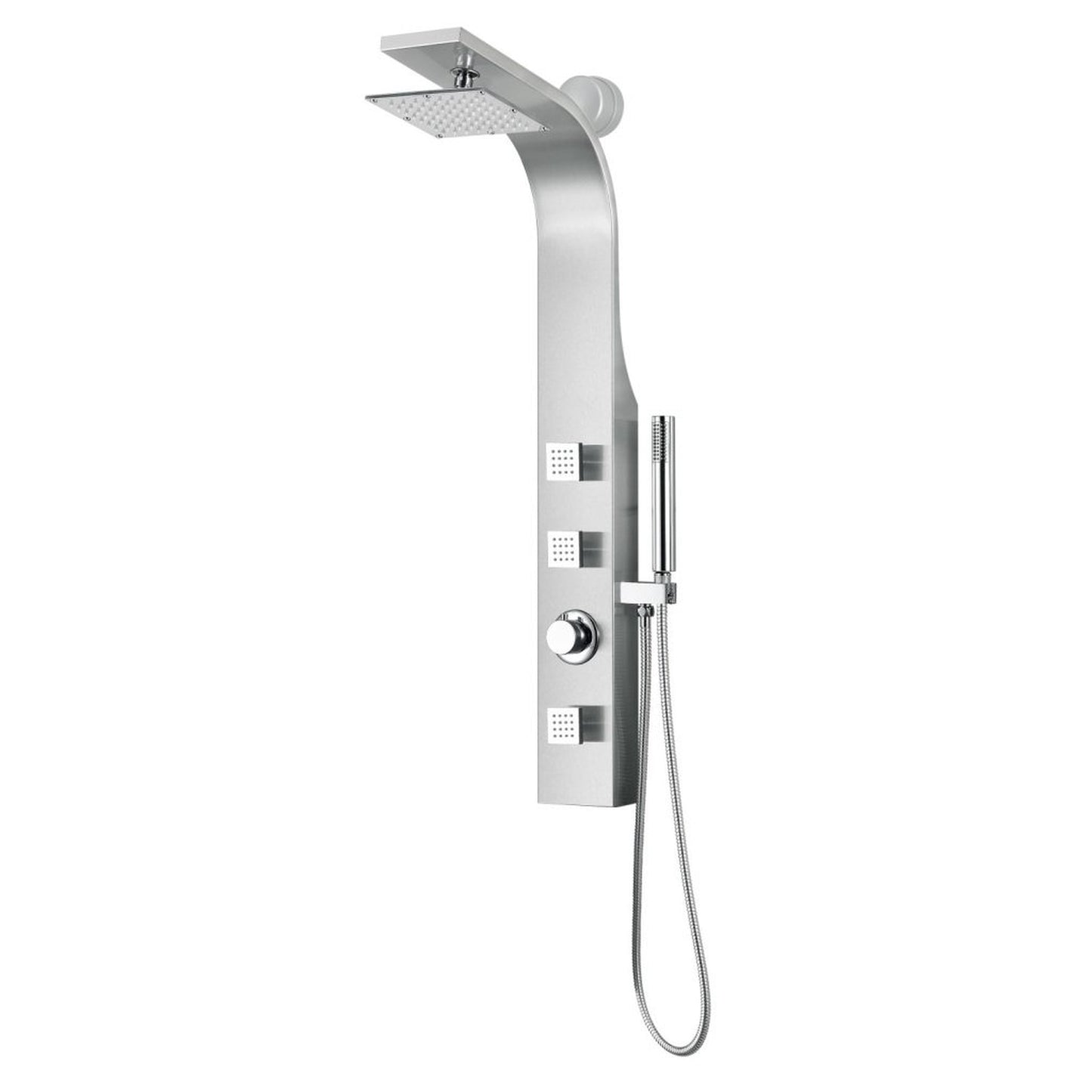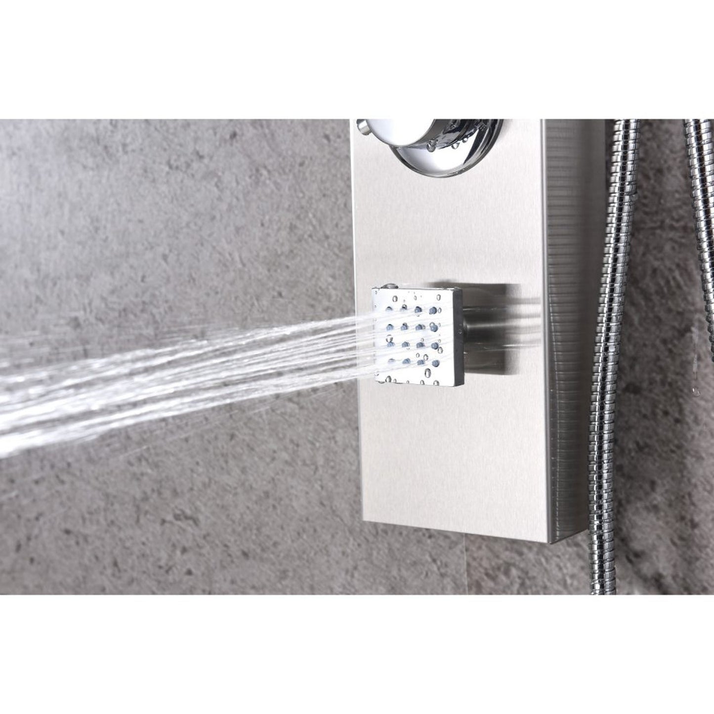 The ANZZI full body Silent shower panel features a modern laser cut brushed 304 stainless steel body with 3 ACU-Stream body jets providing a relaxing yet powerful water stream to massage the body. The Heavy Rain shower head hangs overhead releasing a steady torrent of soothing water from above. And always positioned at the column's flank is the Euro-Grip hand held sprayer with free reign reach of up to 40 inches. And everything is controlled through 1 chrome diverter control.