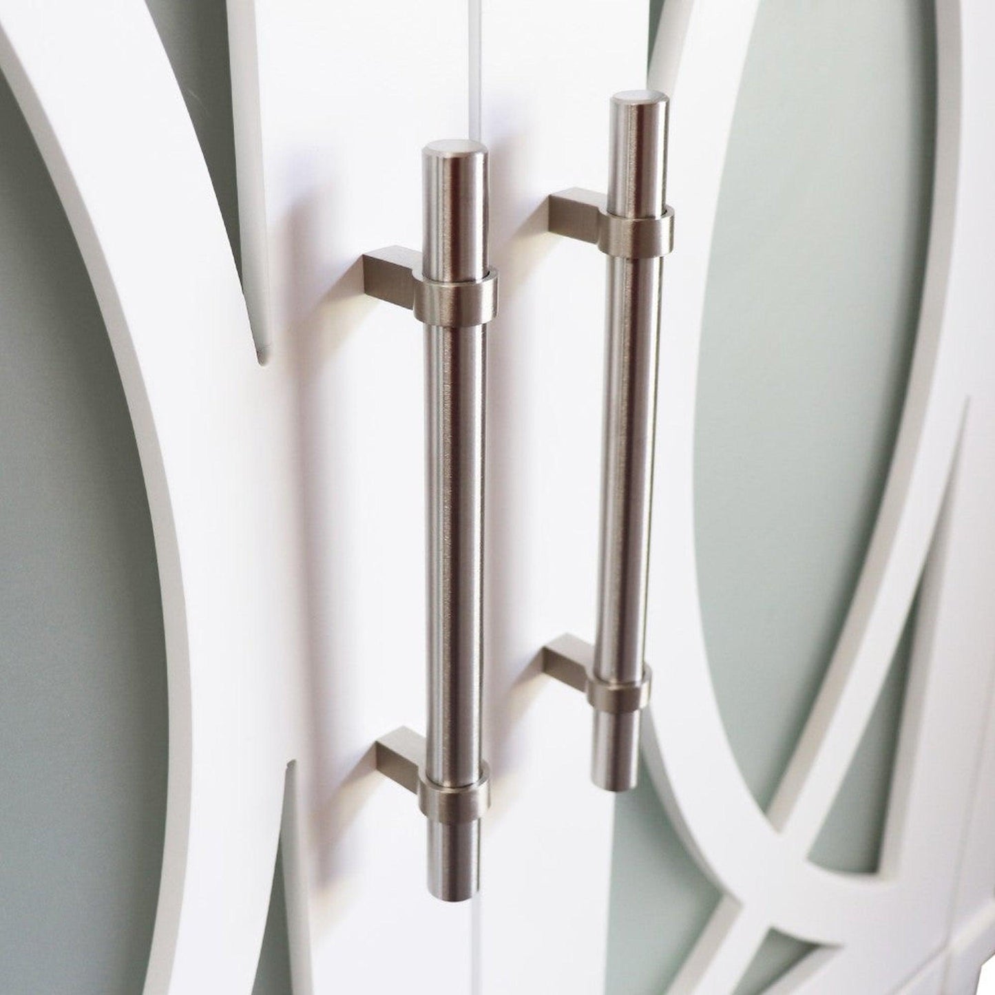 - Featuring a flat-front half circle motif door panels design with glass inserts.