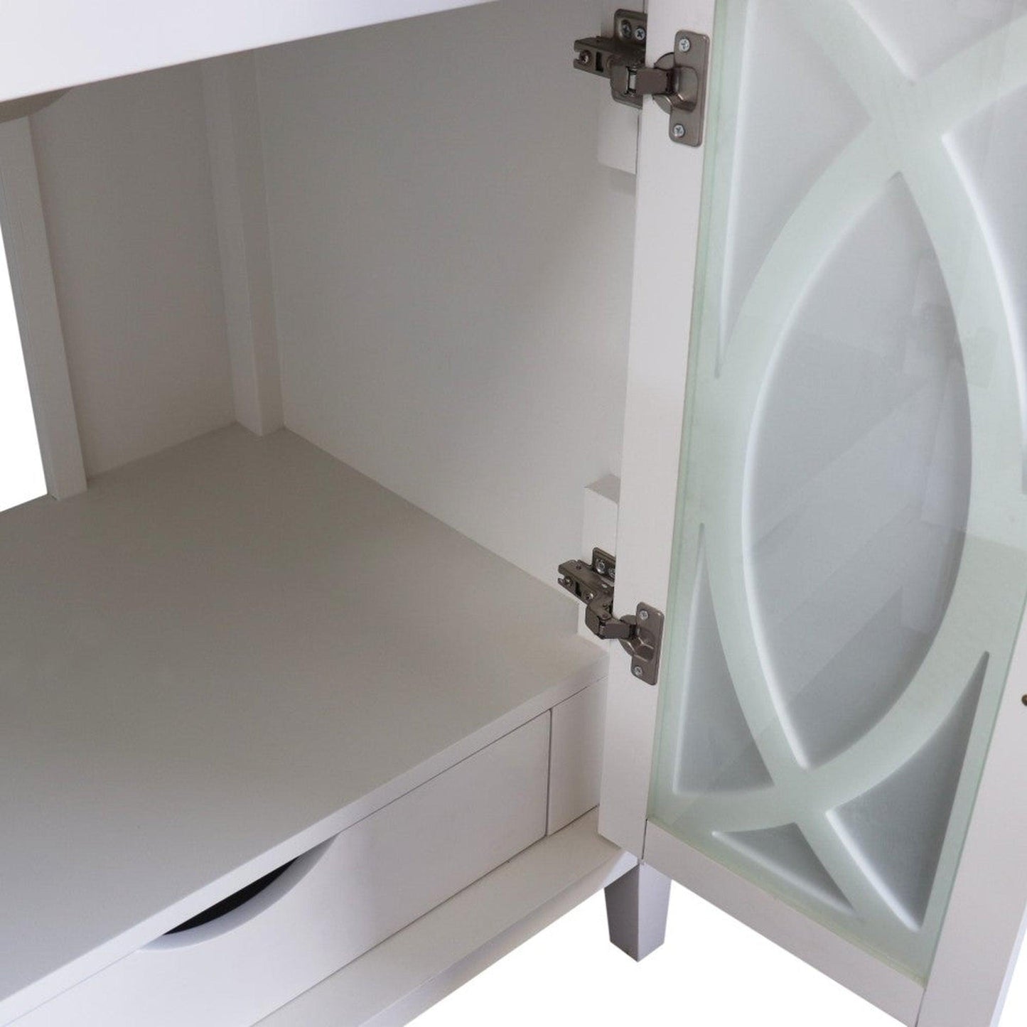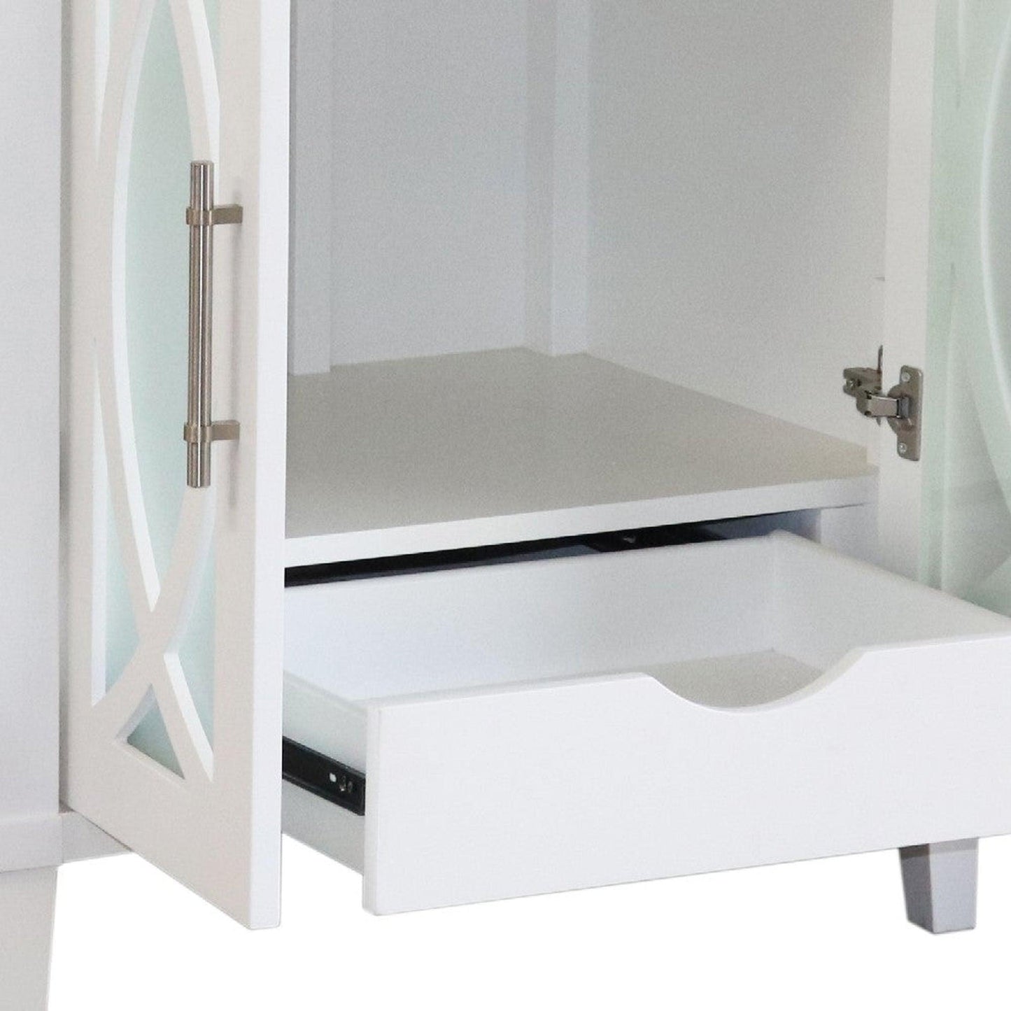 This stylish yet simple single sink vanity offers two beautiful glass inserted doors and one interior drawer. This gorgeous white vanity will be the focal point of your bathroom