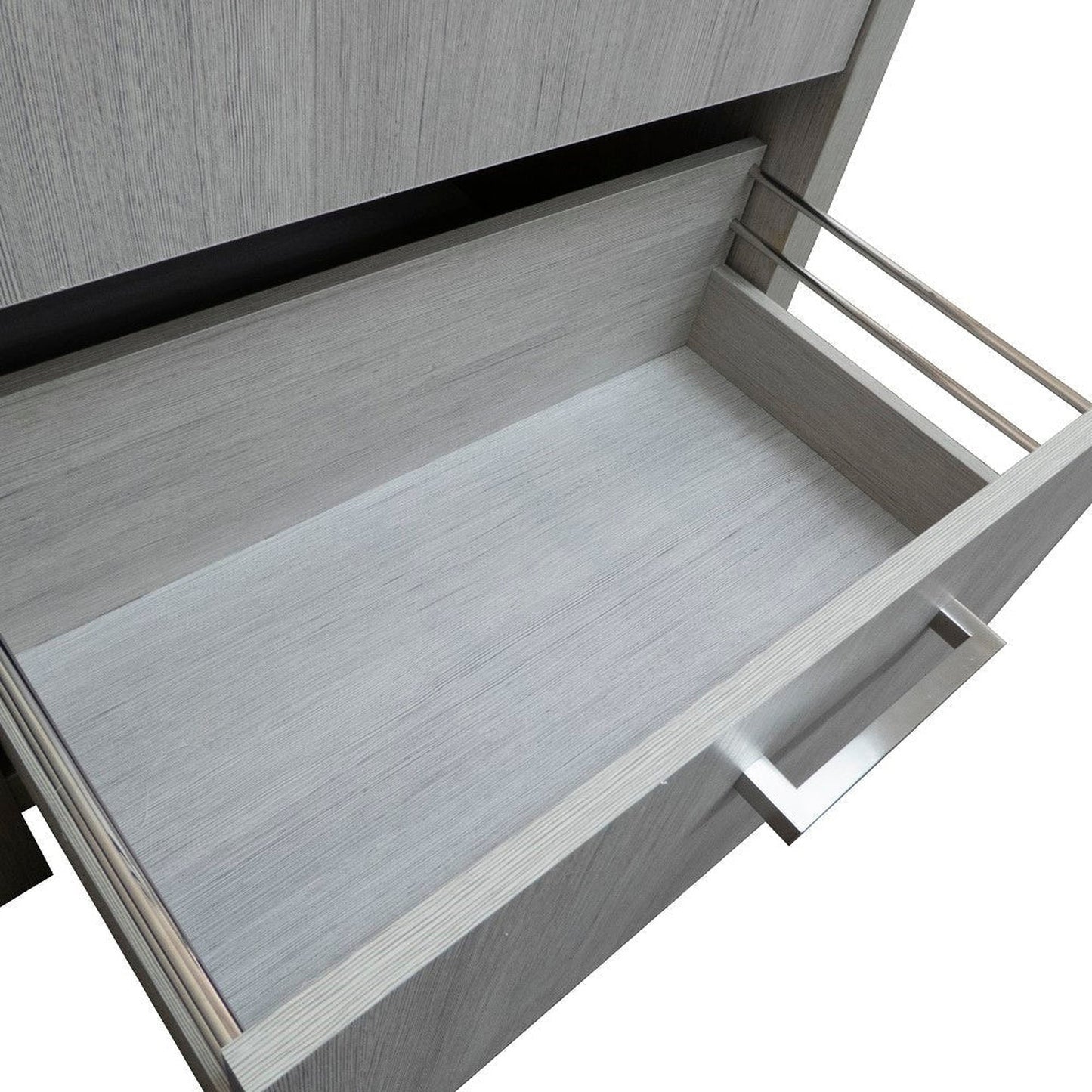 This 30 in. Vanity is elegantly constructed of solid wood finished in a gray pine color. The integrated ceramic counter top and seamless drop in design bring a crisp and contemporary look to any bathroom. The integrated Rectangle drop in sink beautifully showcases the rich features of vanity. This stylish design includes two soft close drawers all adorned with satin nickel hardware. If you have a small bathroom, this is one of the best compliments you can provide. Dimensions: 29.5Wx18Dx33H