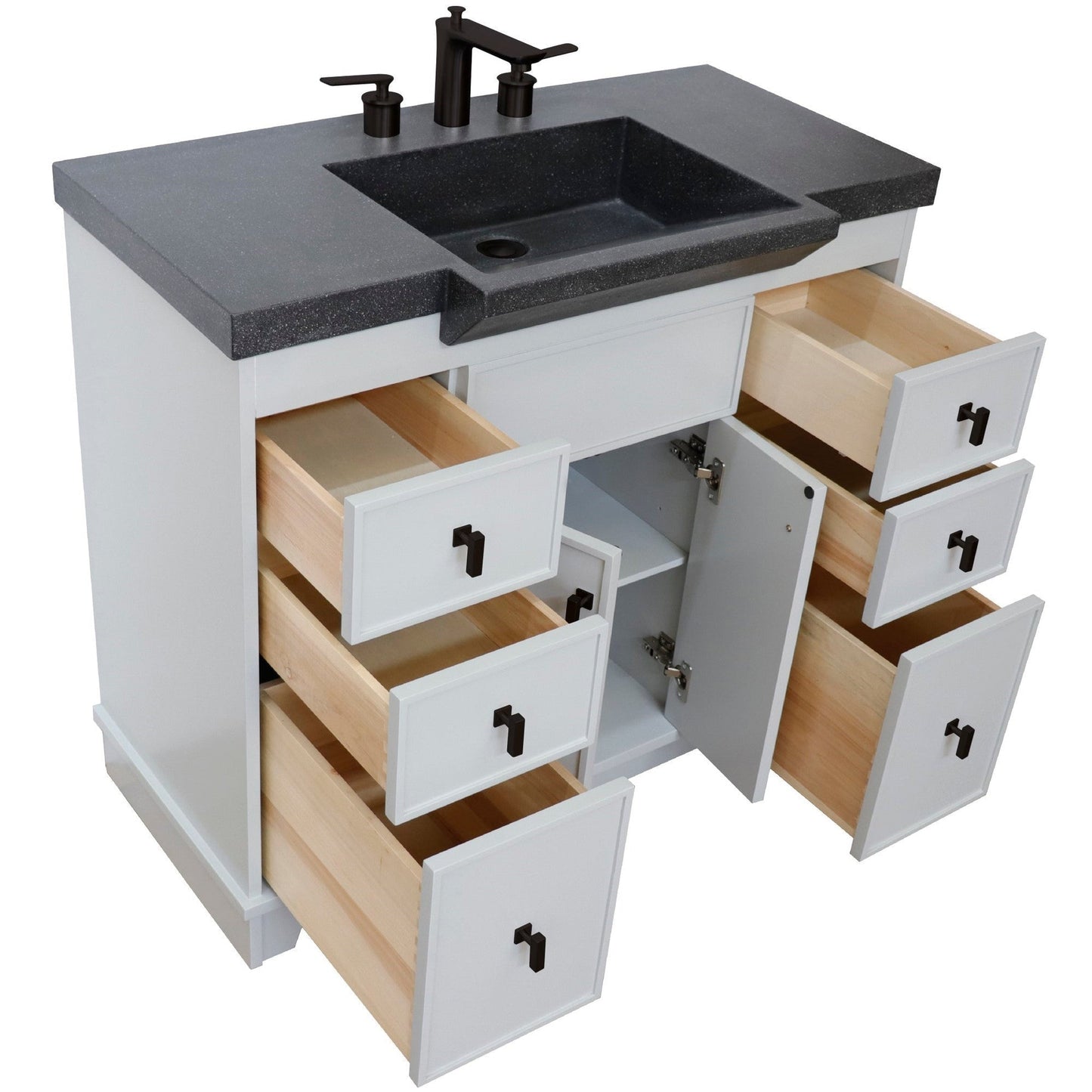 This single bathroom vanity brings clean lines and extra storage space to your main bathroom or guest bath. It's made from solid wood with a fresh, breezy finish that works well with any aesthetic, from coastal to the farmhouse. The 39" wide concrete top surface gives you enough room for your daily use. The vanity top build with a sleek ramp sink which brings functionality and modern design to any bathroom. There are two cabinet doors and six pull-out drawers with inset paneling open up to reveal ample storage space for big and small household items. Plus, we have 3 choices of hardware color, brushed nickel, black and brushed gold. This will easily match with the overall design of your bathroom.