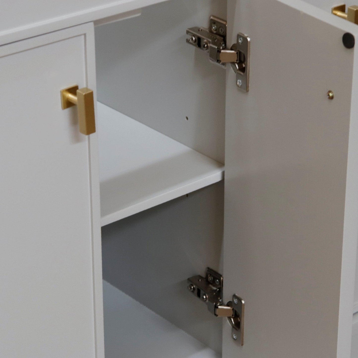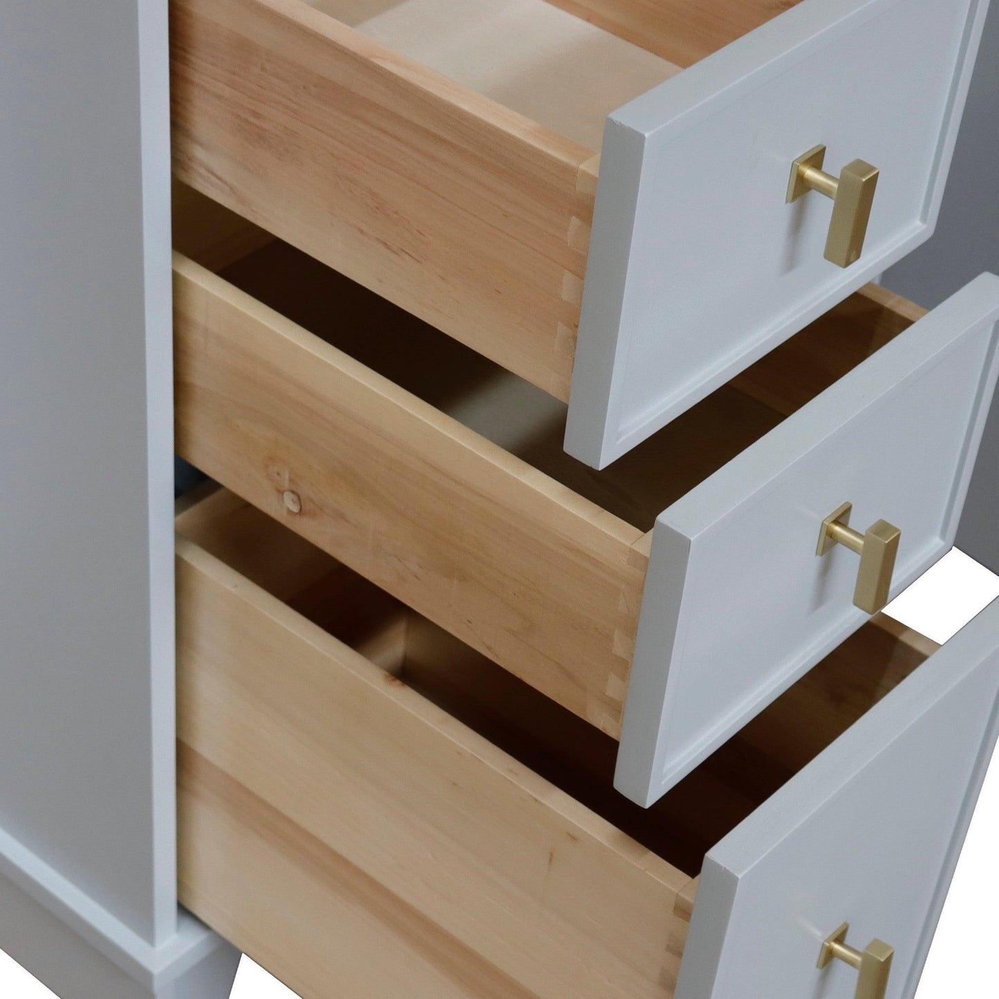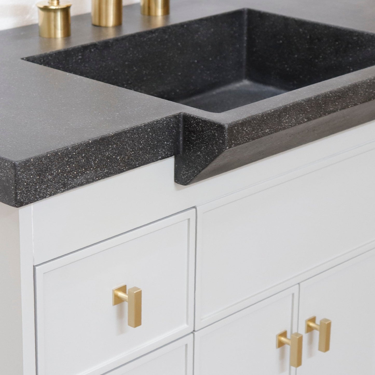 This single bathroom vanity brings clean lines and extra storage space to your main bathroom or guest bath. It's made from solid wood with a fresh, breezy finish that works well with any aesthetic, from coastal to the farmhouse. The 39" wide concrete top surface gives you enough room for your daily use. The vanity top build with a sleek ramp sink which brings functionality and modern design to any bathroom. There are two cabinet doors and six pull-out drawers with inset paneling open up to reveal ample storage space for big and small household items. Plus, we have 3 choices of hardware color, brushed nickel, black and brushed gold. This will easily match with the overall design of your bathroom.