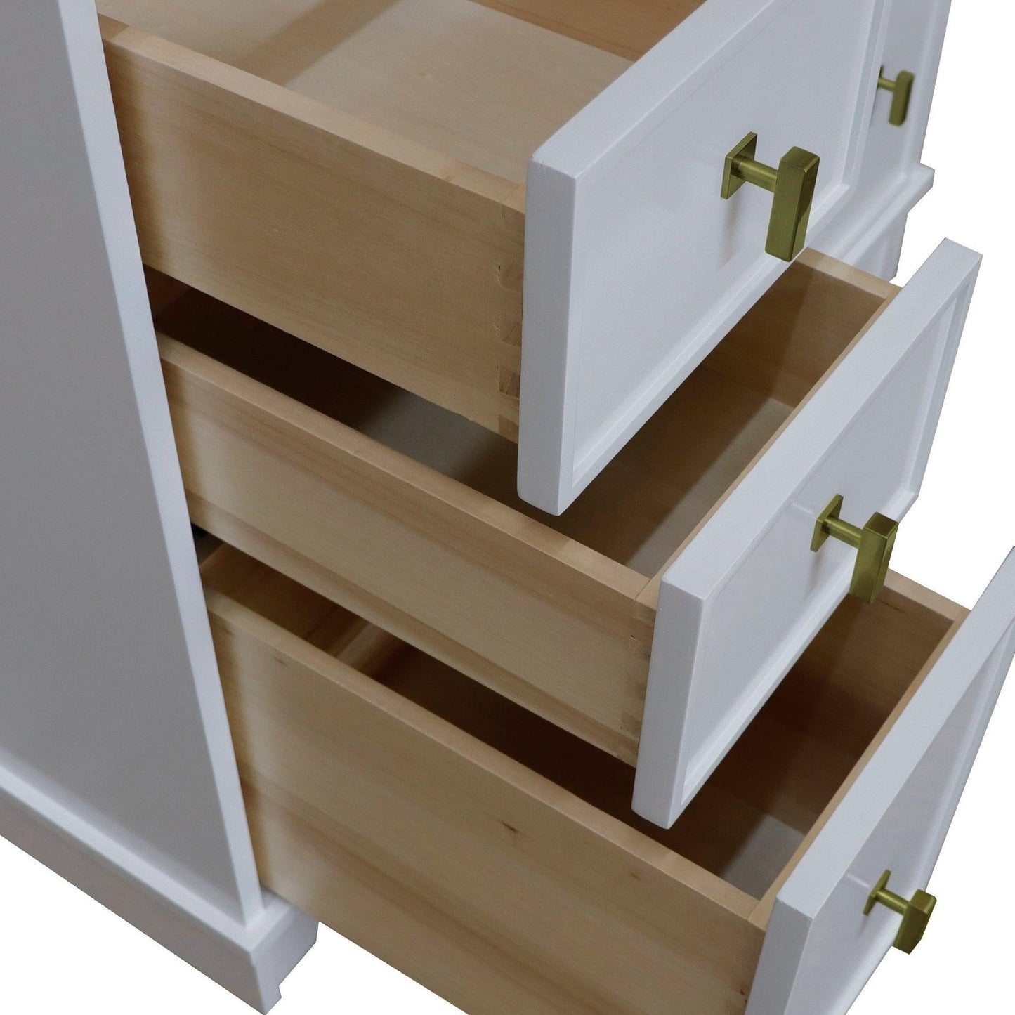 This single bathroom vanity brings clean lines and extra storage space to your main bathroom or guest bath. It's made from solid wood with a fresh, breezy finish that works well with any aesthetic, from coastal to the farmhouse. The 39" wide concrete top surface gives you enough room for your daily use. The vanity top build with a sleek ramp sink which brings functionality and modern design to any bathroom. There are two cabinet doors and six soft-close drawers with inset paneling open up to reveal ample storage space. The bottom drawers has extra deep drawer boxes which is great for storing big tall items. Plus, this series offer 3 choices of hardware color, brushed nickel; black and brushed gold plus three choice of top color choices (sandy white / gray / black). This will easily match with the overall design of your bathroom.