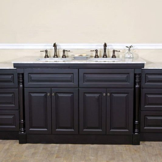 This stunning double bathroom vanity with beautiful hand carved column legs that are sure to become the showpiece of your home. The vanity is built with solid birch wood and plywood on the sides and drawer boxes, built with precise furniture quality integrated rabbet joinery. High quality commercial glue as well as mechanical fasteners combines to create optimal strength and stability. This vanity features raised door and drawer panels in rich mahogany finish, installed with soft close hinges and drawer glides. To optimize storage, there are two tiered corner shelves, to be placed behind the cabinet doors. This makes storing all the necessary items for a bathroom so much easier. In addition, there is an optional extension that allows for one or two extra cabinets. With this extension, this double vanity can go up to 93 in. wide. This vanity blends flawless classic styles with modern functions, resulting in a simply amazing, one-of-a-kind vanity