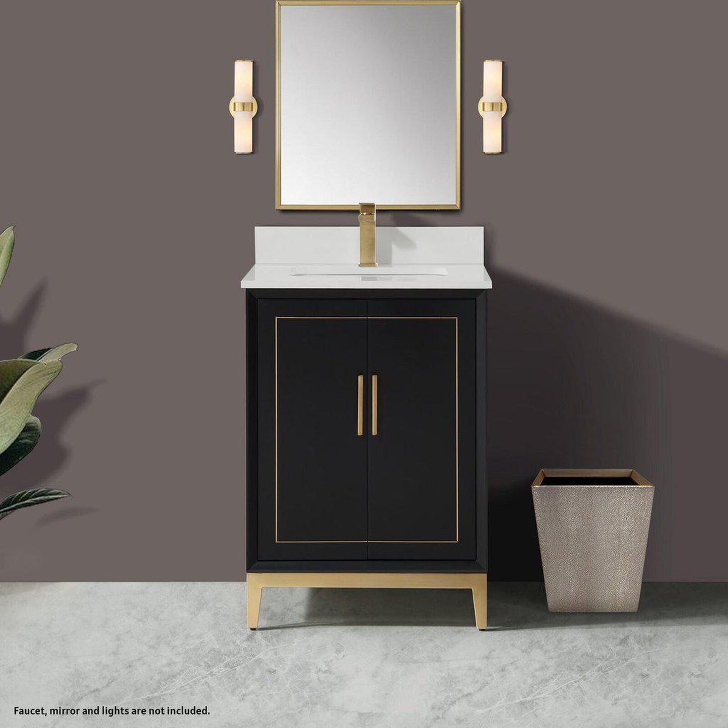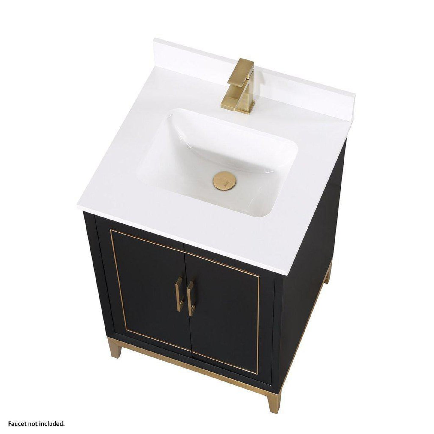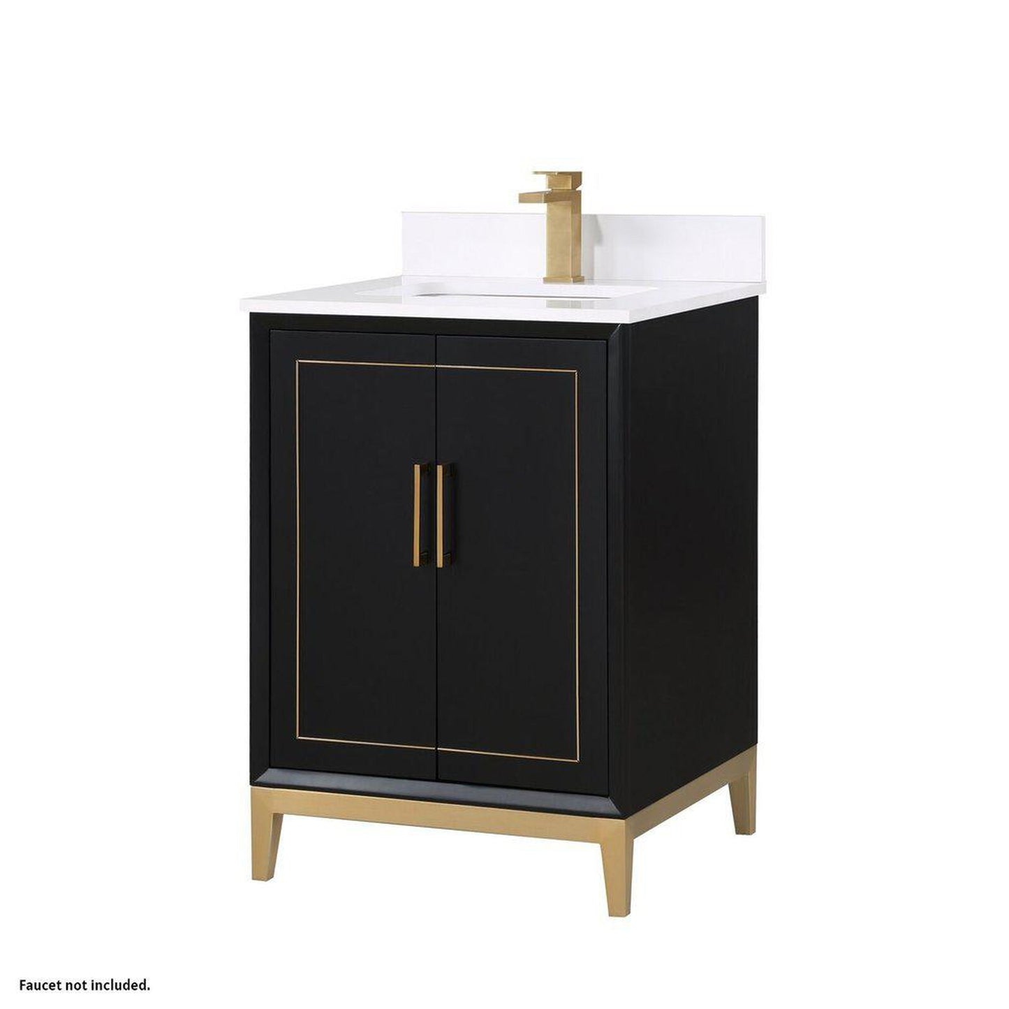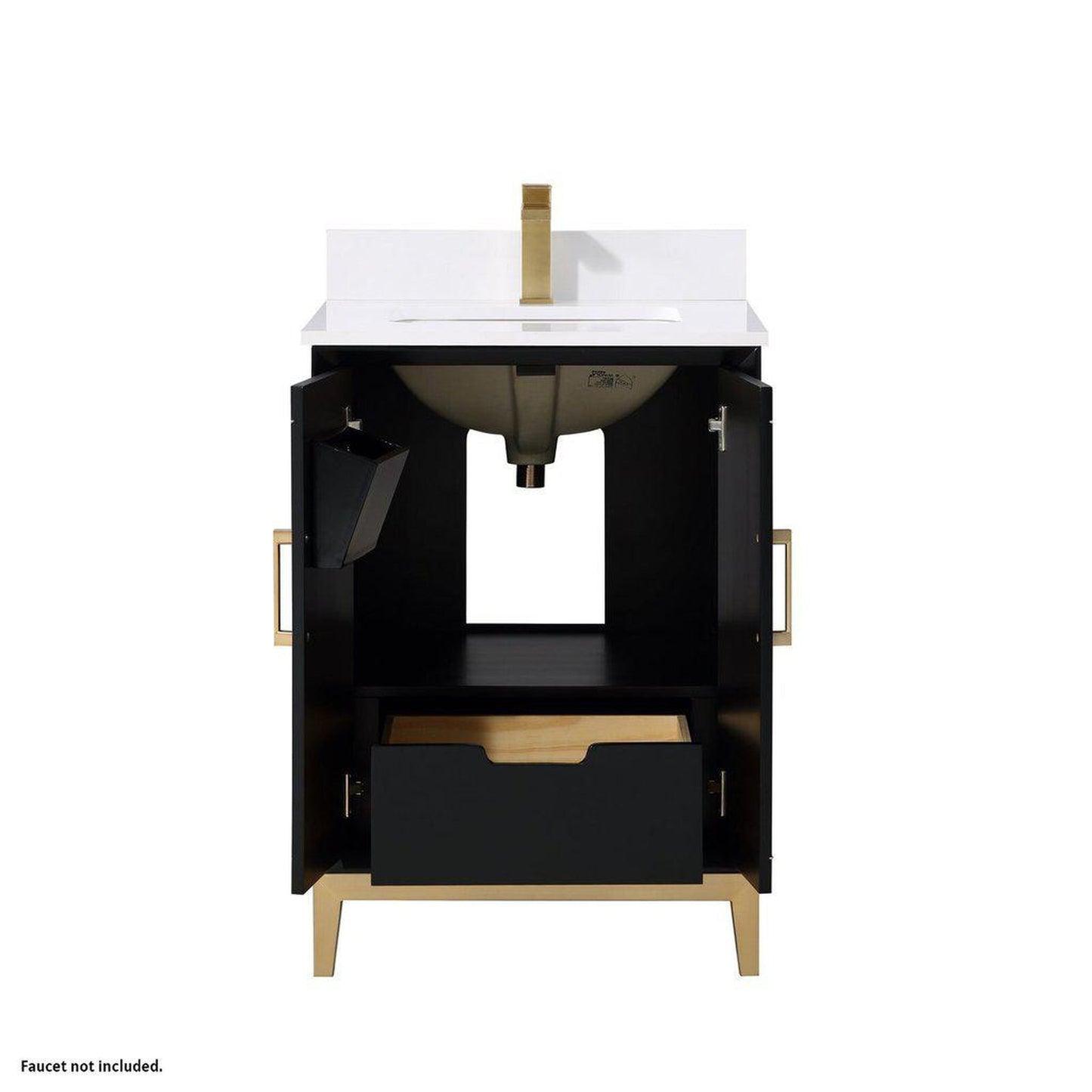 Bemma Design Gracie 24" Midnight Black Solid Wood Freestanding Bathroom Vanity With Single 1-Hole White Quartz Vanity Top, Rectangle Undermount Sink, Backsplash and Satin Brass Trim