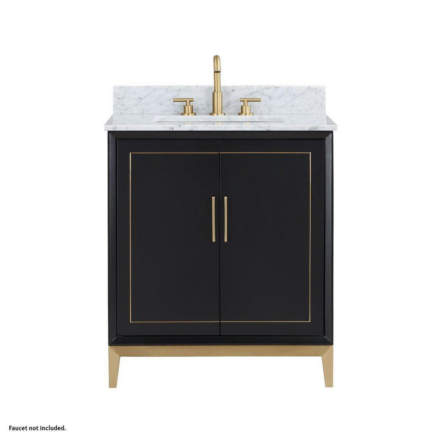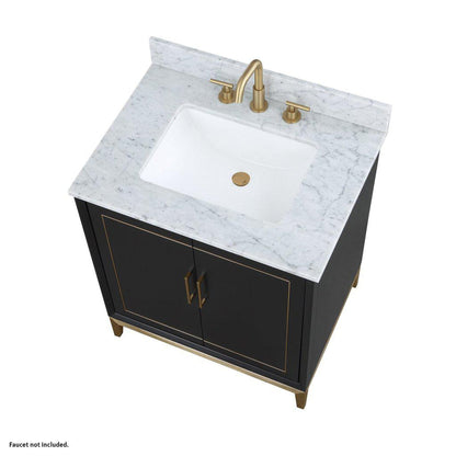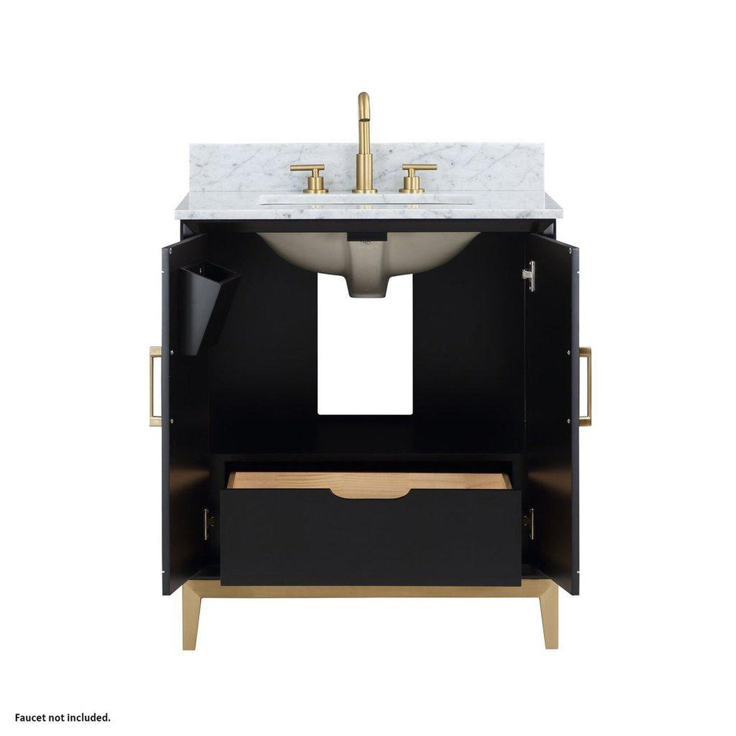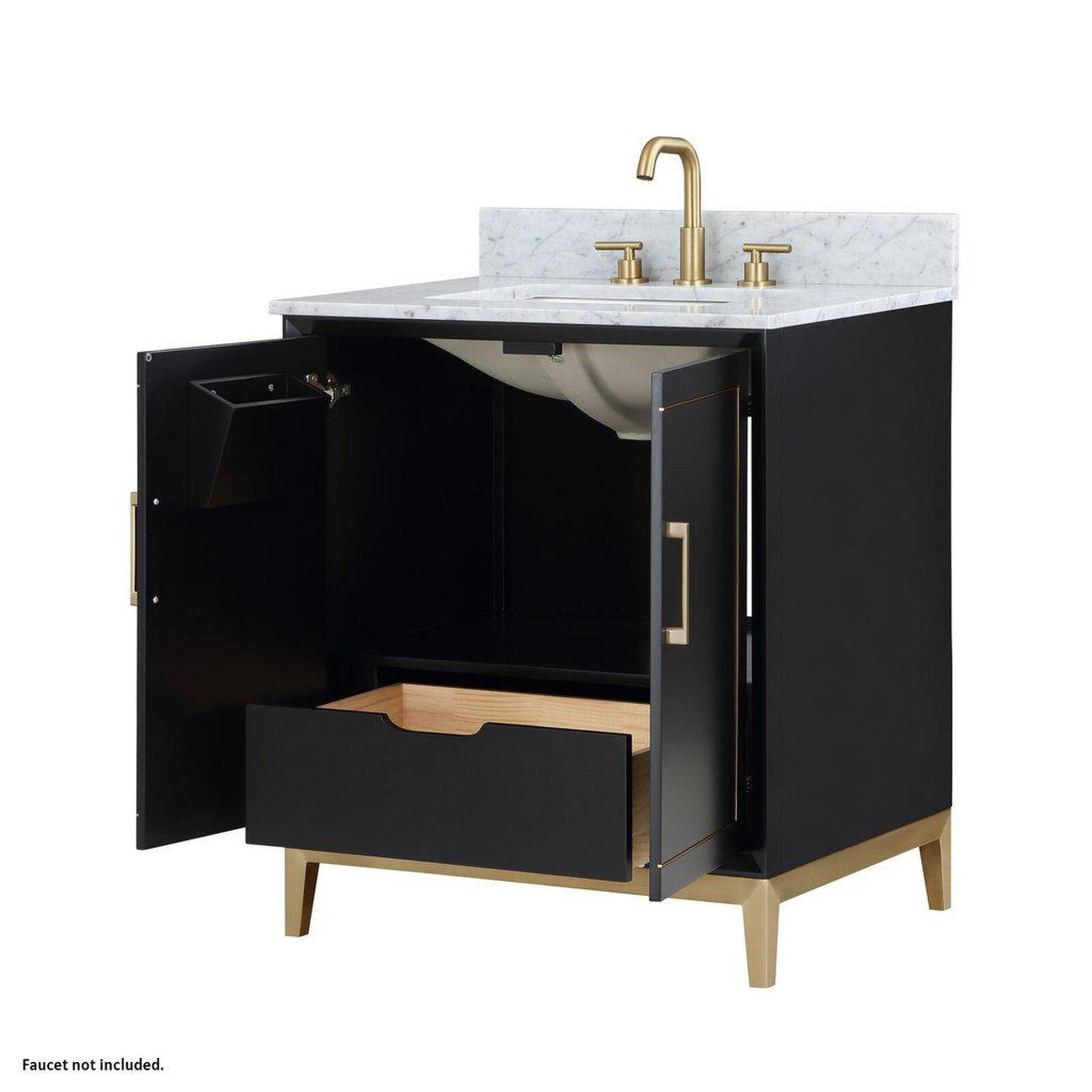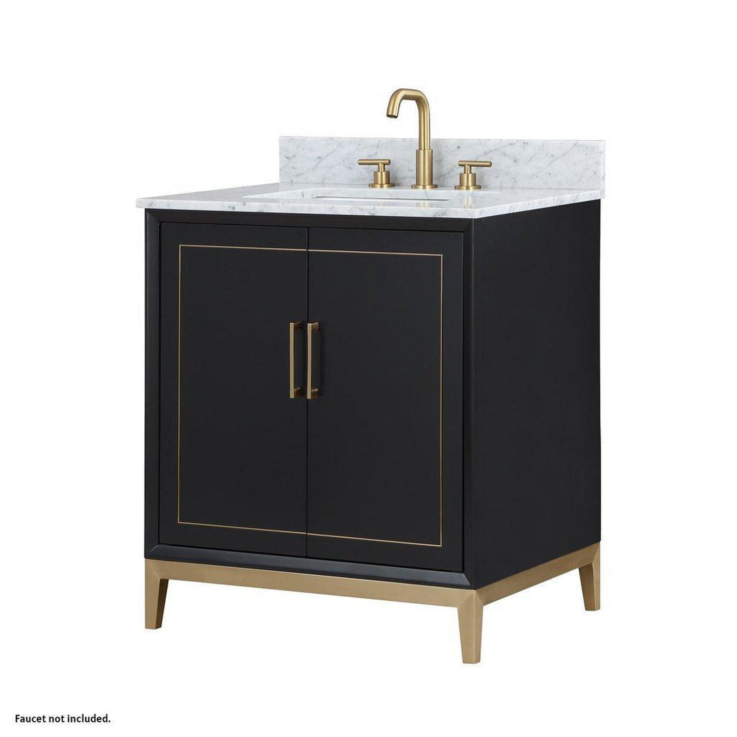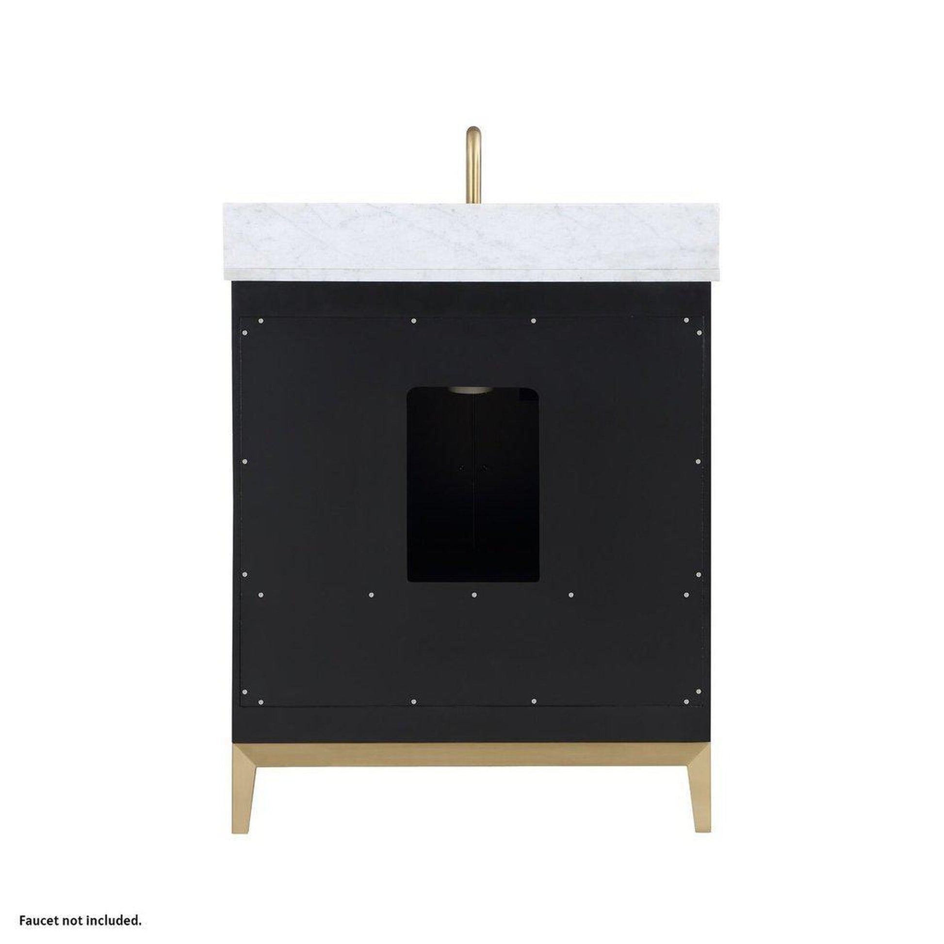 Bemma Design Gracie 30" Midnight Black Solid Wood Freestanding Bathroom Vanity With Single 3-Hole Italian Carra Marble Vanity Top, Rectangle Undermount Sink, Backsplash and Satin Brass Trim