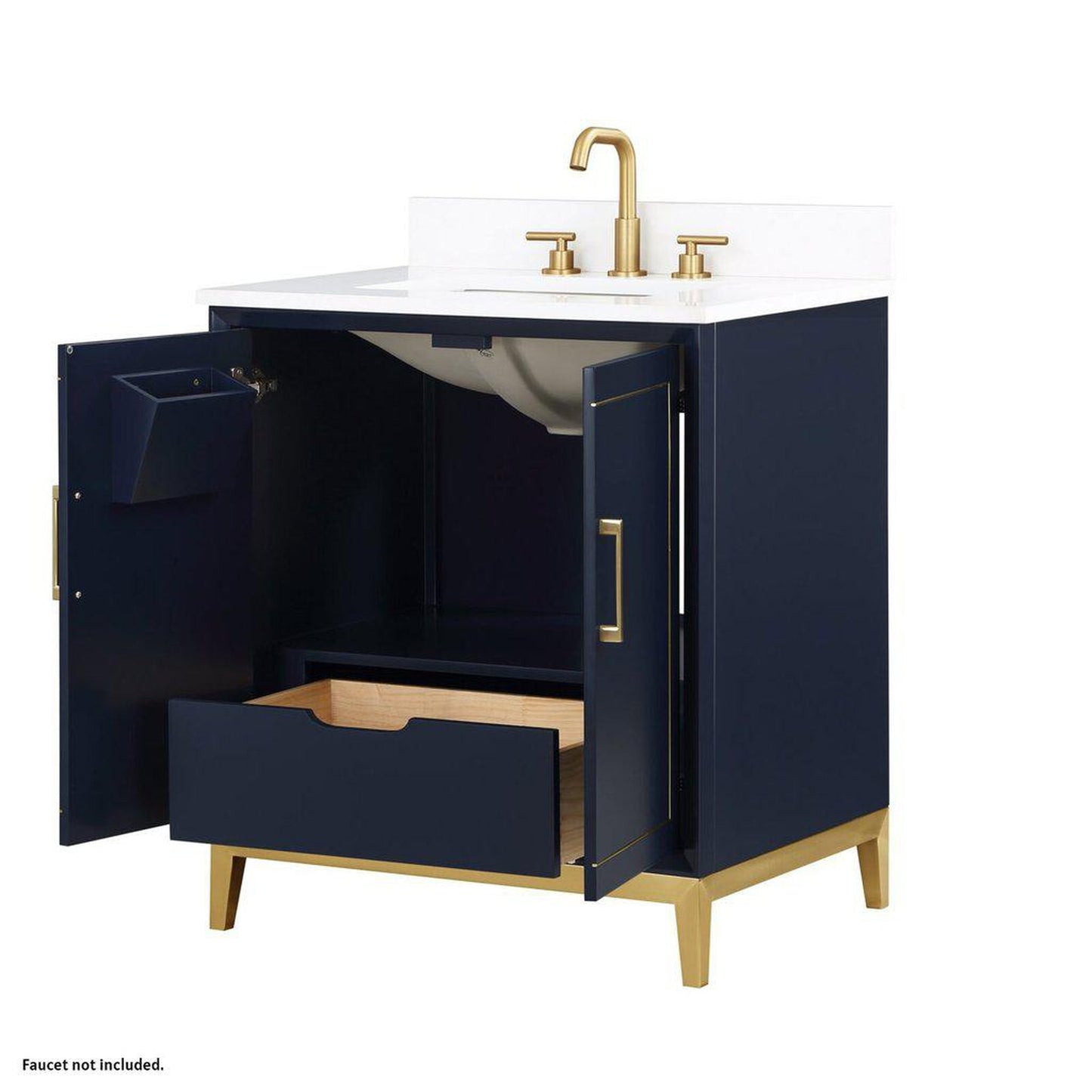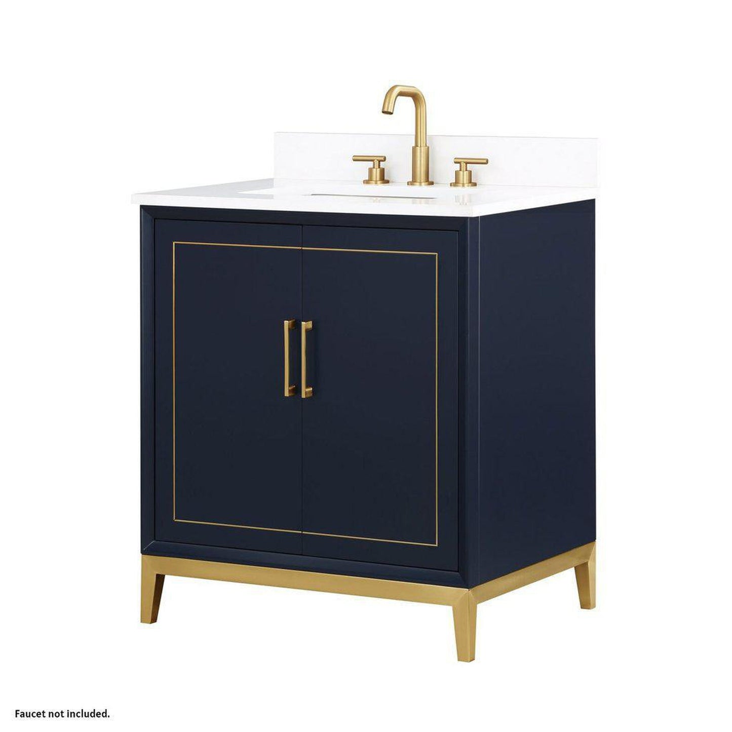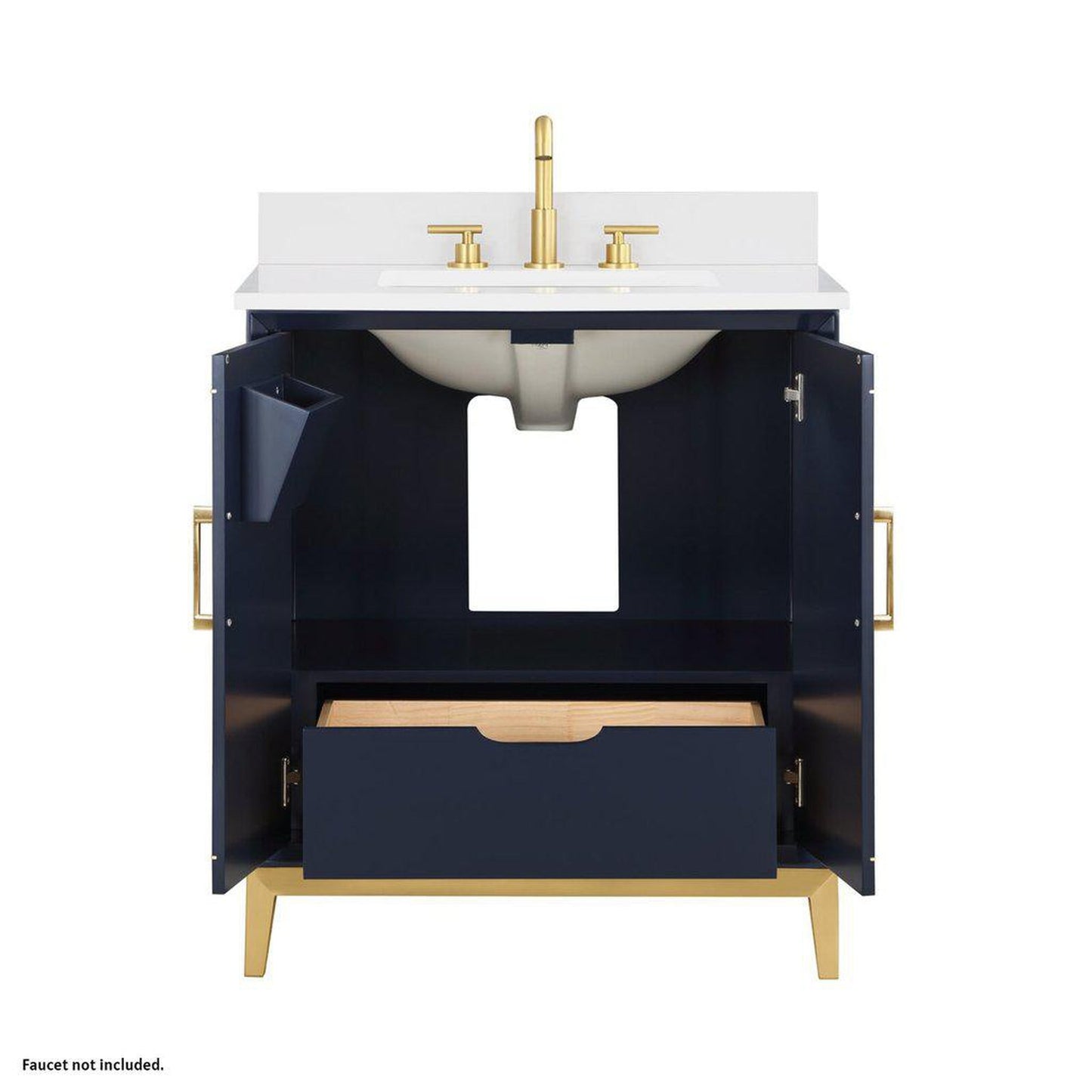 Bemma Design Gracie 30" Pacific Blue Solid Wood Freestanding Bathroom Vanity With Single 3-Hole White Quartz Vanity Top, Rectangle Undermount Sink, Backsplash and Satin Brass Trim
