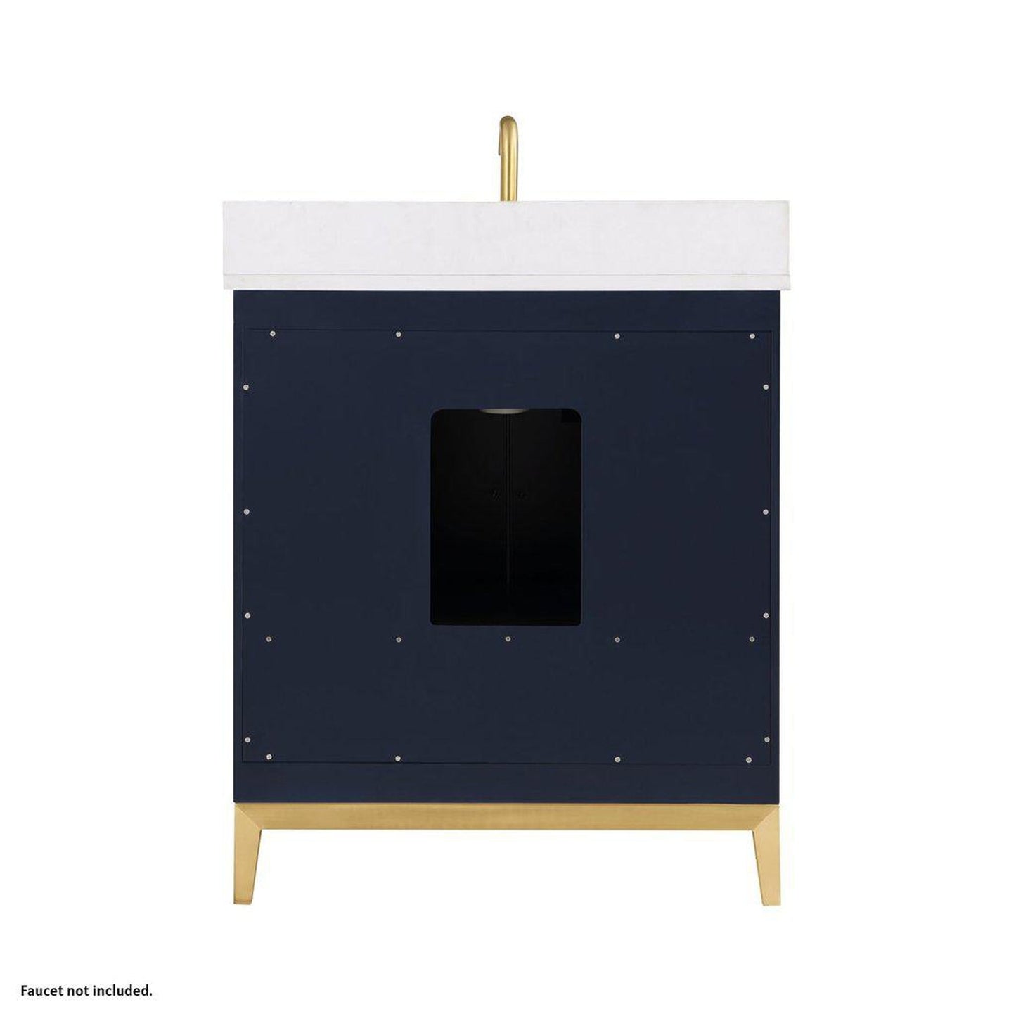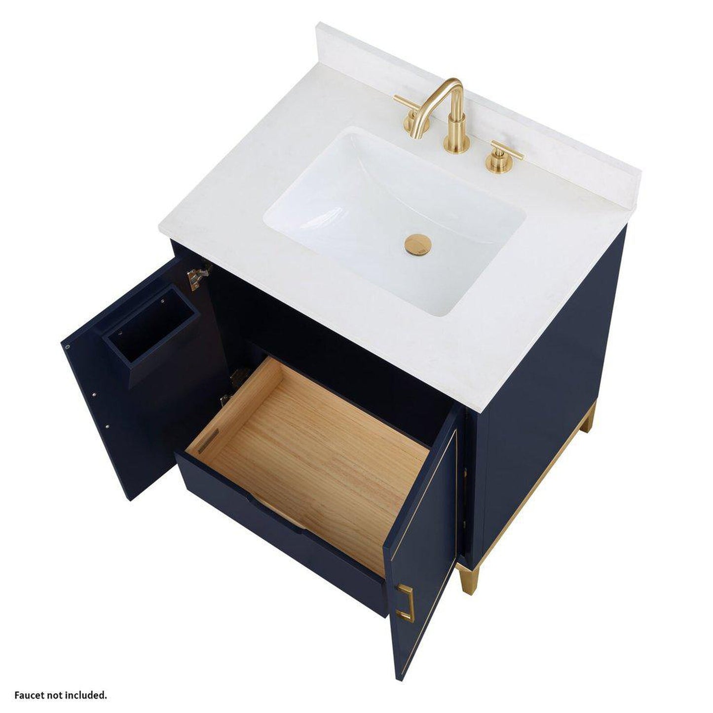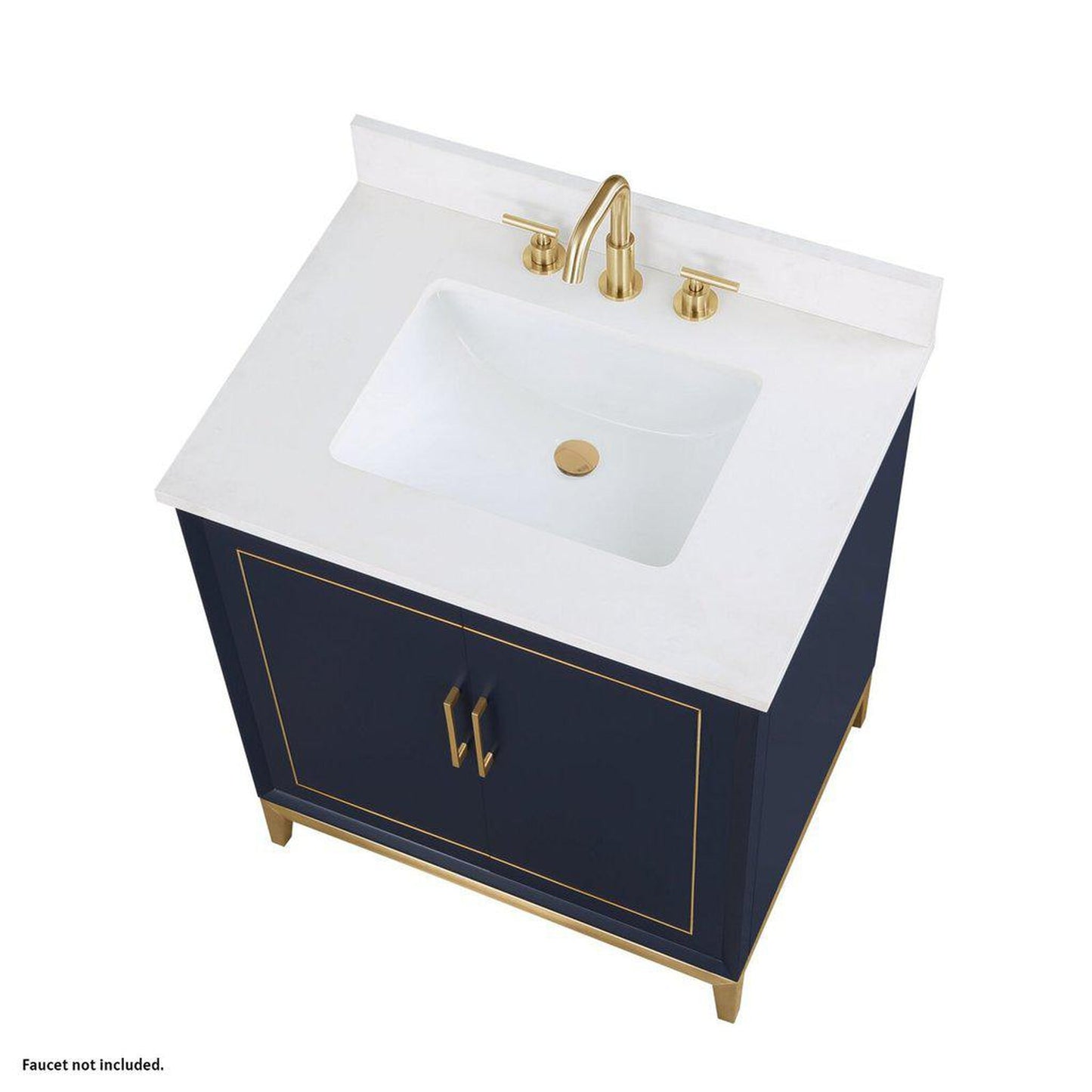 Bemma Design Gracie 30" Pacific Blue Solid Wood Freestanding Bathroom Vanity With Single 3-Hole White Quartz Vanity Top, Rectangle Undermount Sink, Backsplash and Satin Brass Trim