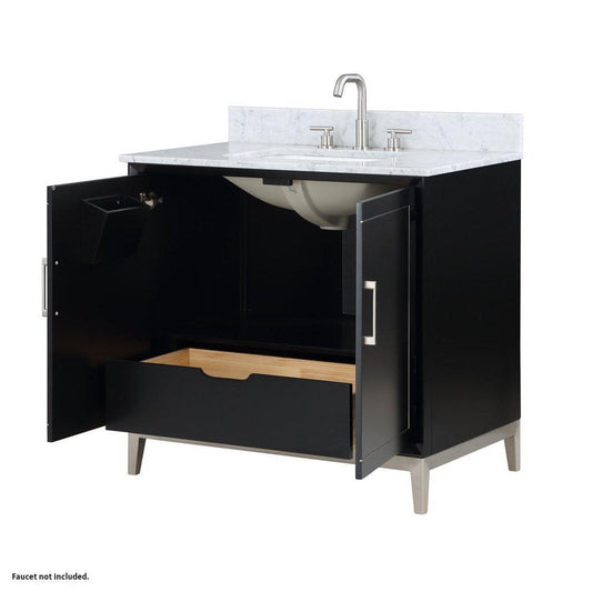 Bemma Design Gracie 36" Midnight Black Solid Wood Freestanding Bathroom Vanity With Single 3-Hole Italian Carra Marble Vanity Top, Rectangle Undermount Sink, Backsplash and Brushed Nickel Trim