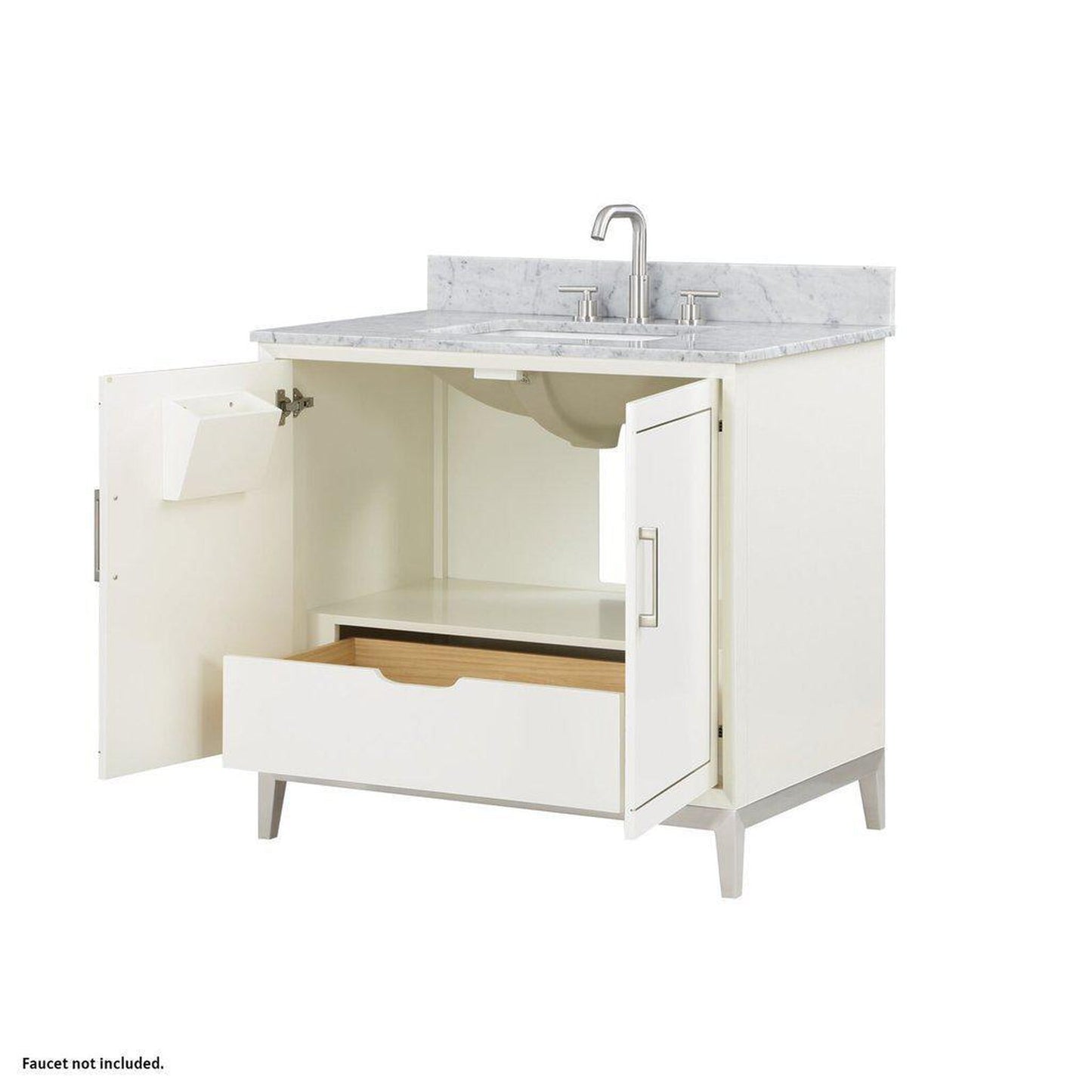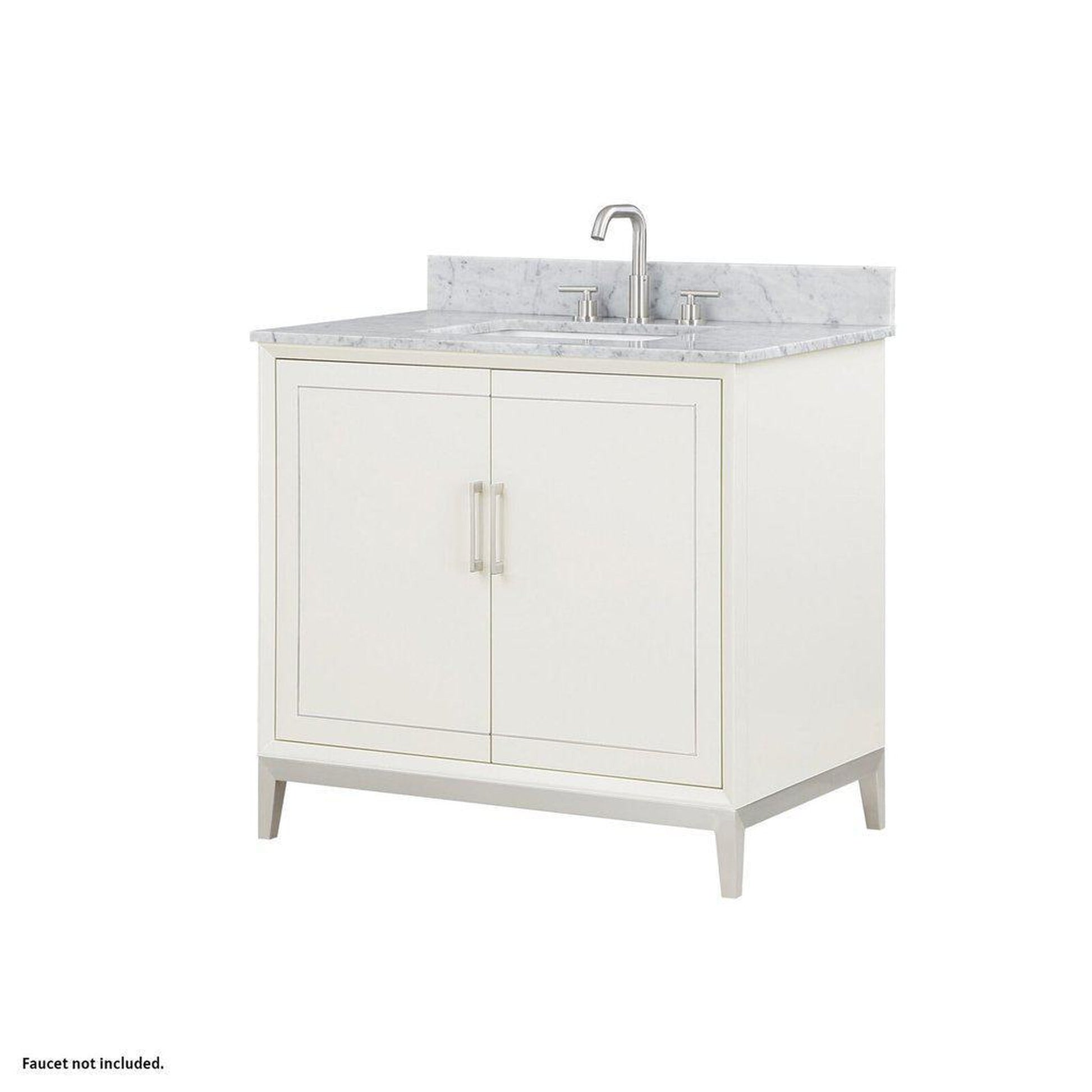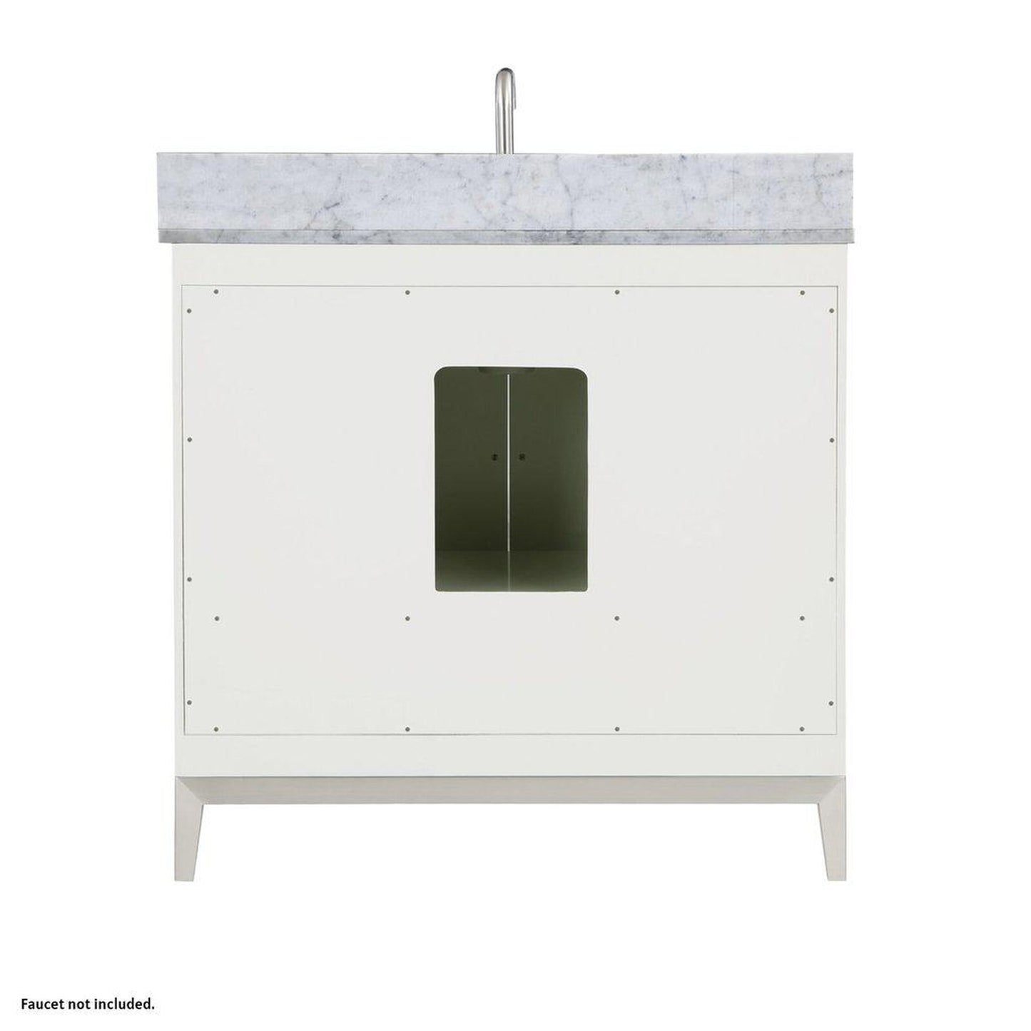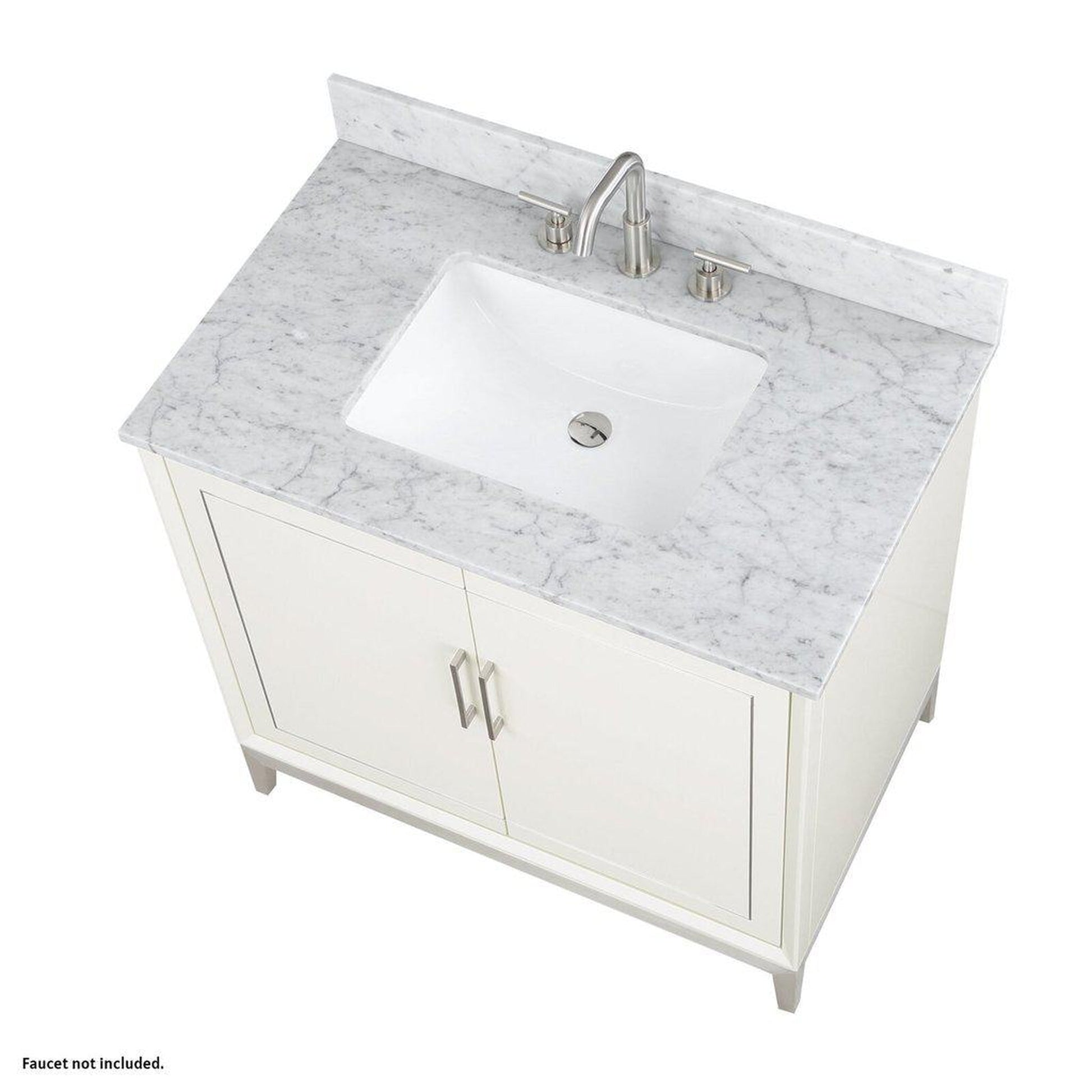 Bemma Design Gracie 36" Satin White Solid Wood Freestanding Bathroom Vanity With Single 3-Hole Italian Carra Marble Vanity Top, Rectangle Undermount Sink, Backsplash and Brushed Nickel Trim