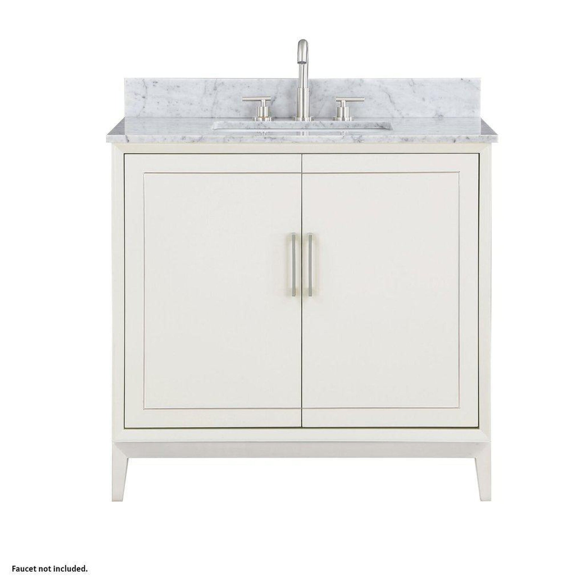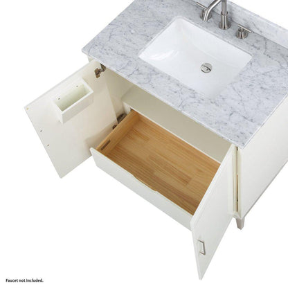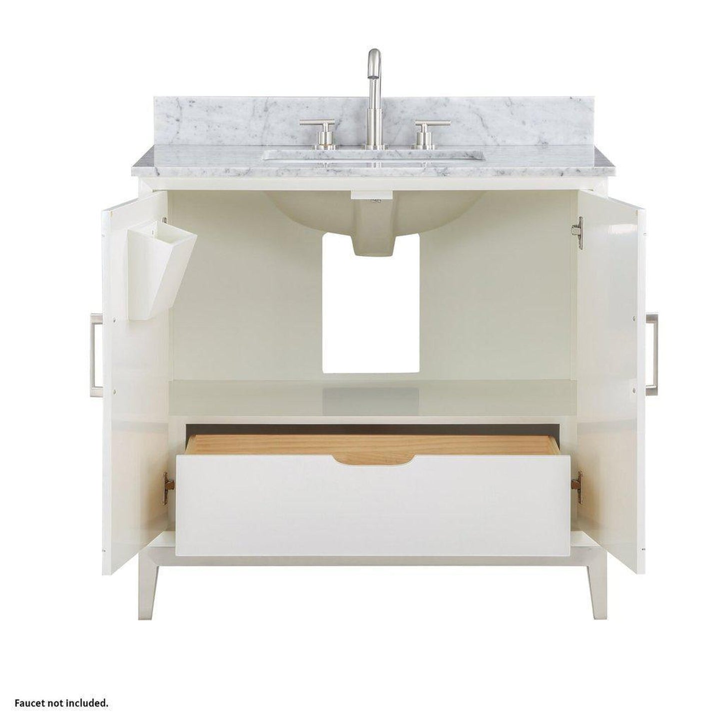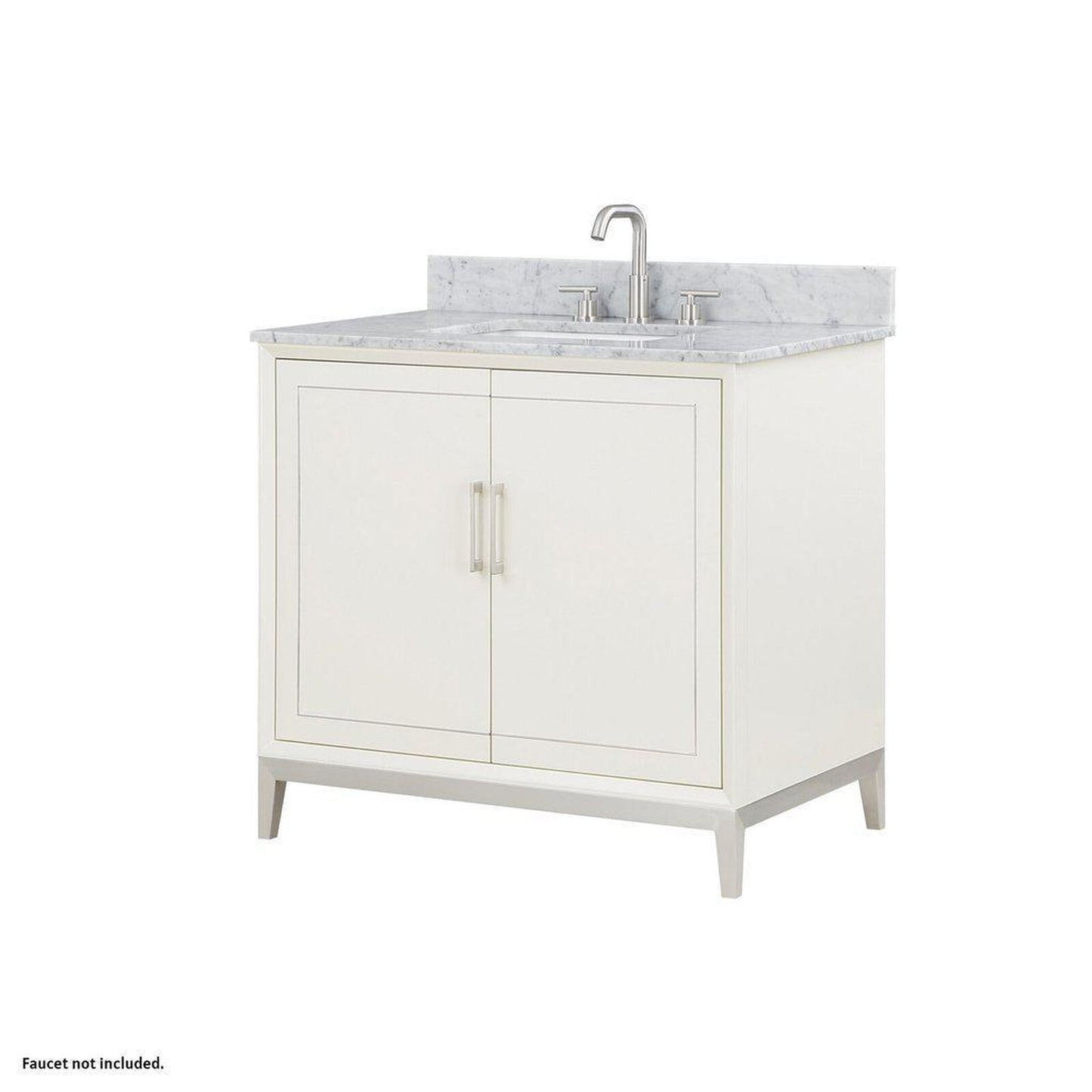 Bemma Design Gracie 36" Satin White Solid Wood Freestanding Bathroom Vanity With Single 3-Hole Italian Carra Marble Vanity Top, Rectangle Undermount Sink, Backsplash and Brushed Nickel Trim