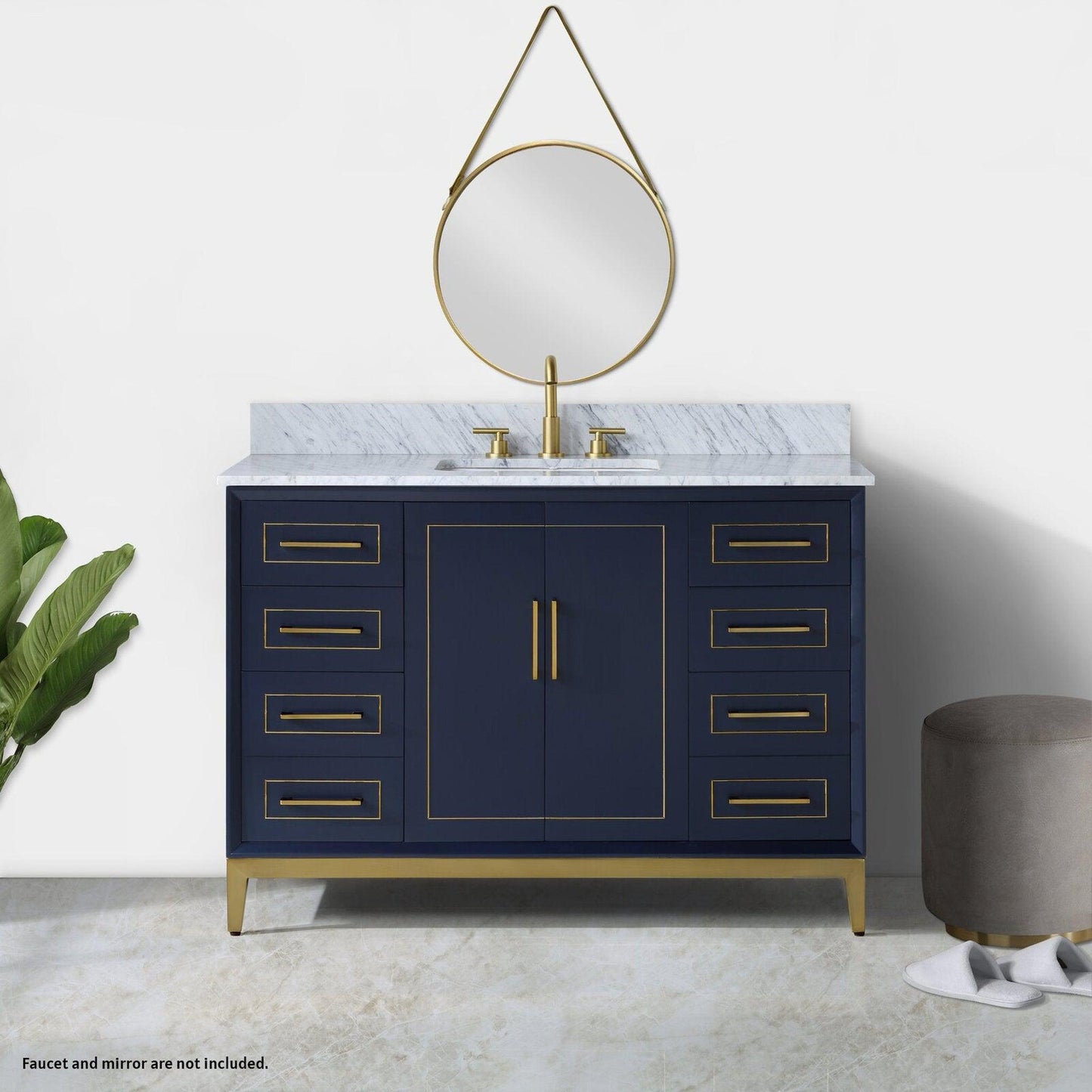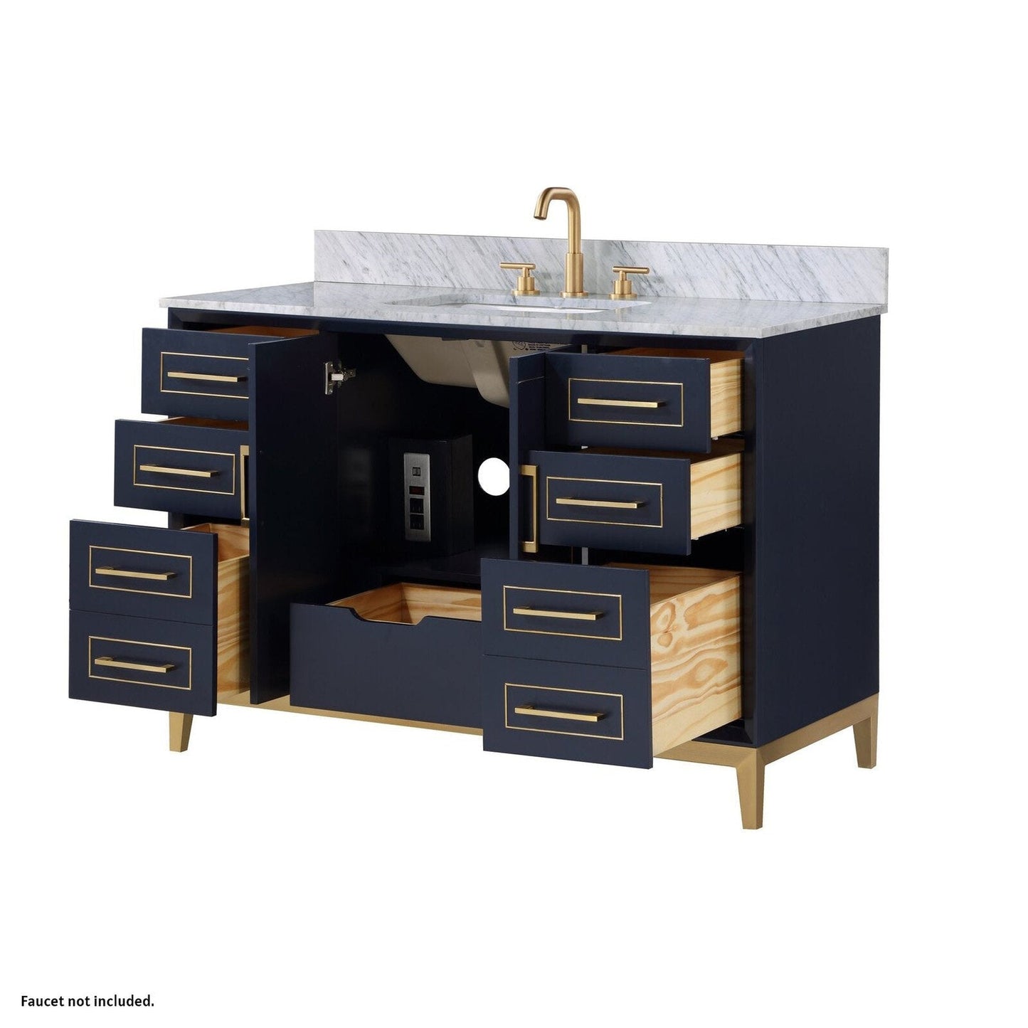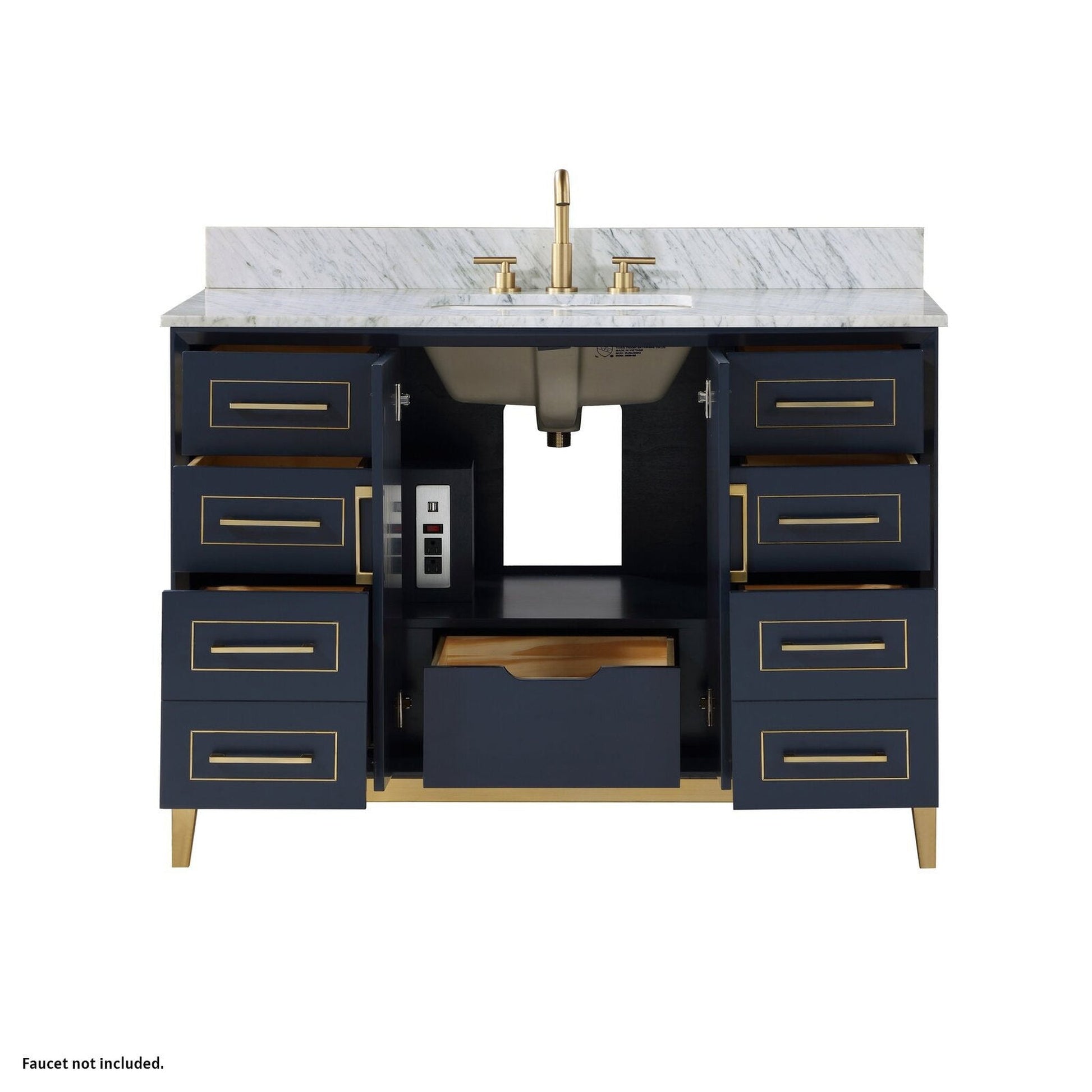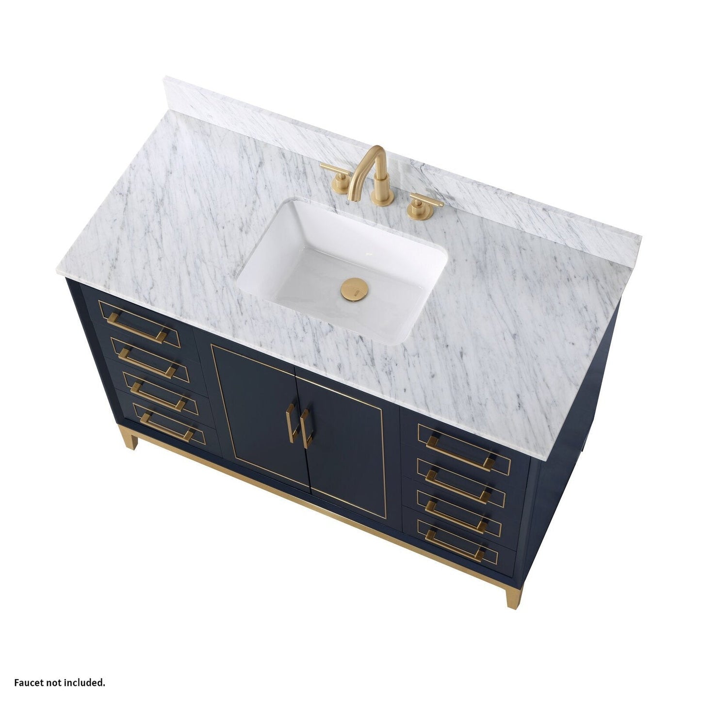 Bemma Design Gracie 48" Pacific Blue Solid Wood Freestanding Bathroom Vanity With Single 3-Hole Italian Carra Marble Vanity Top, Rectangle Undermount Sink, Backsplash and Satin Brass Trim