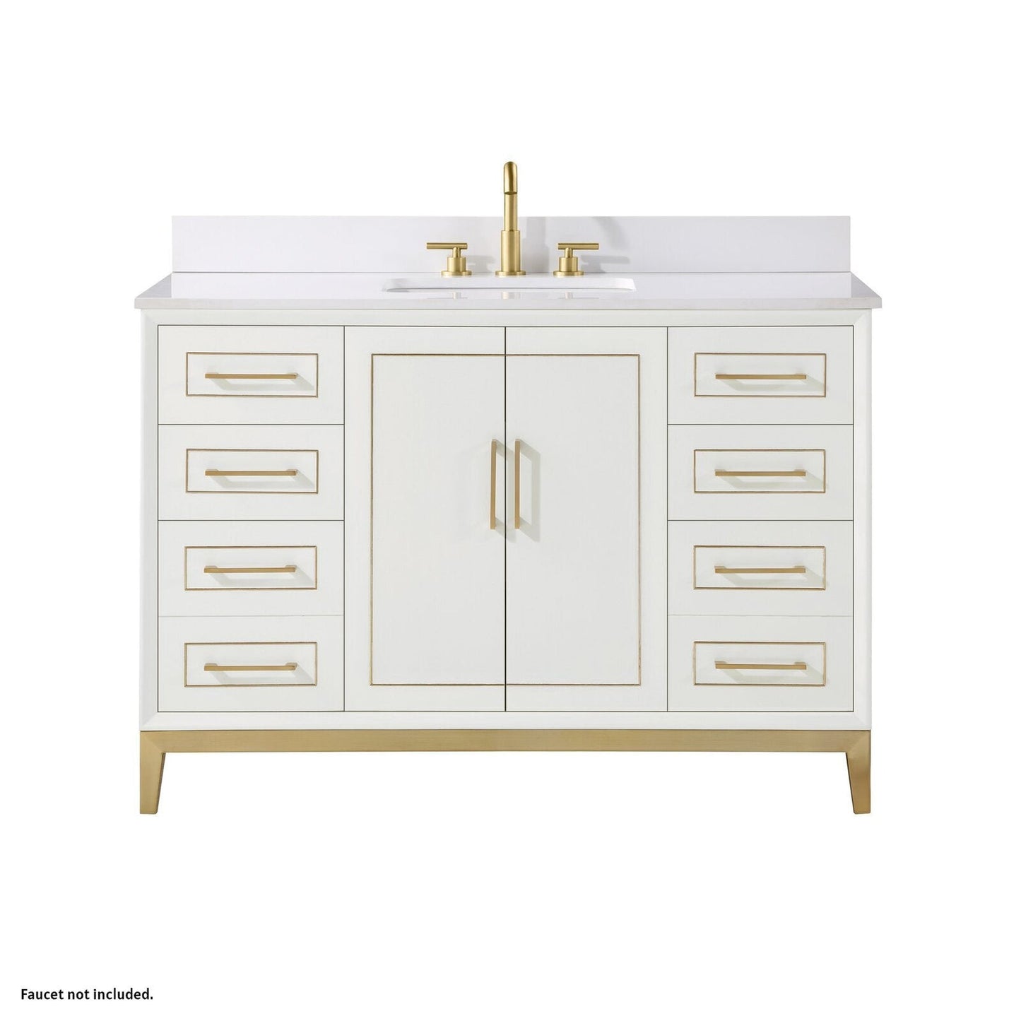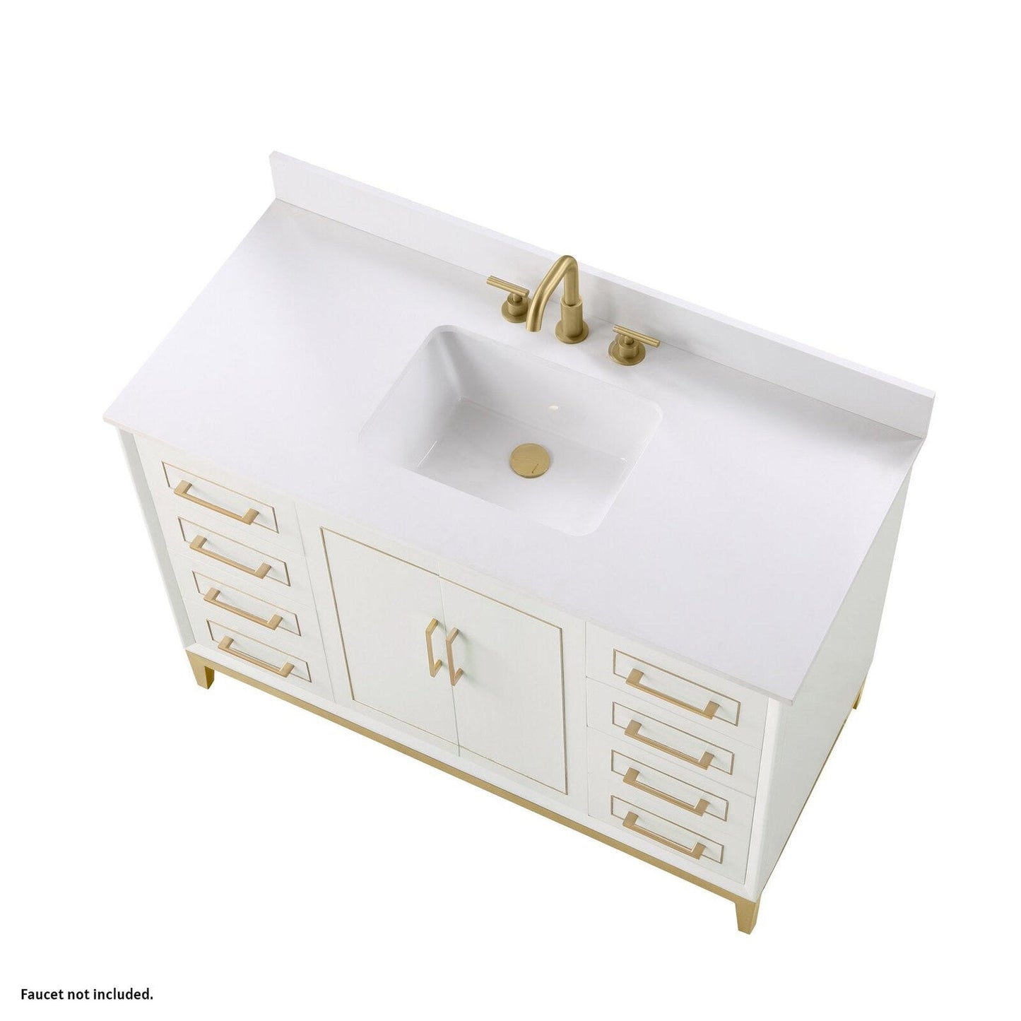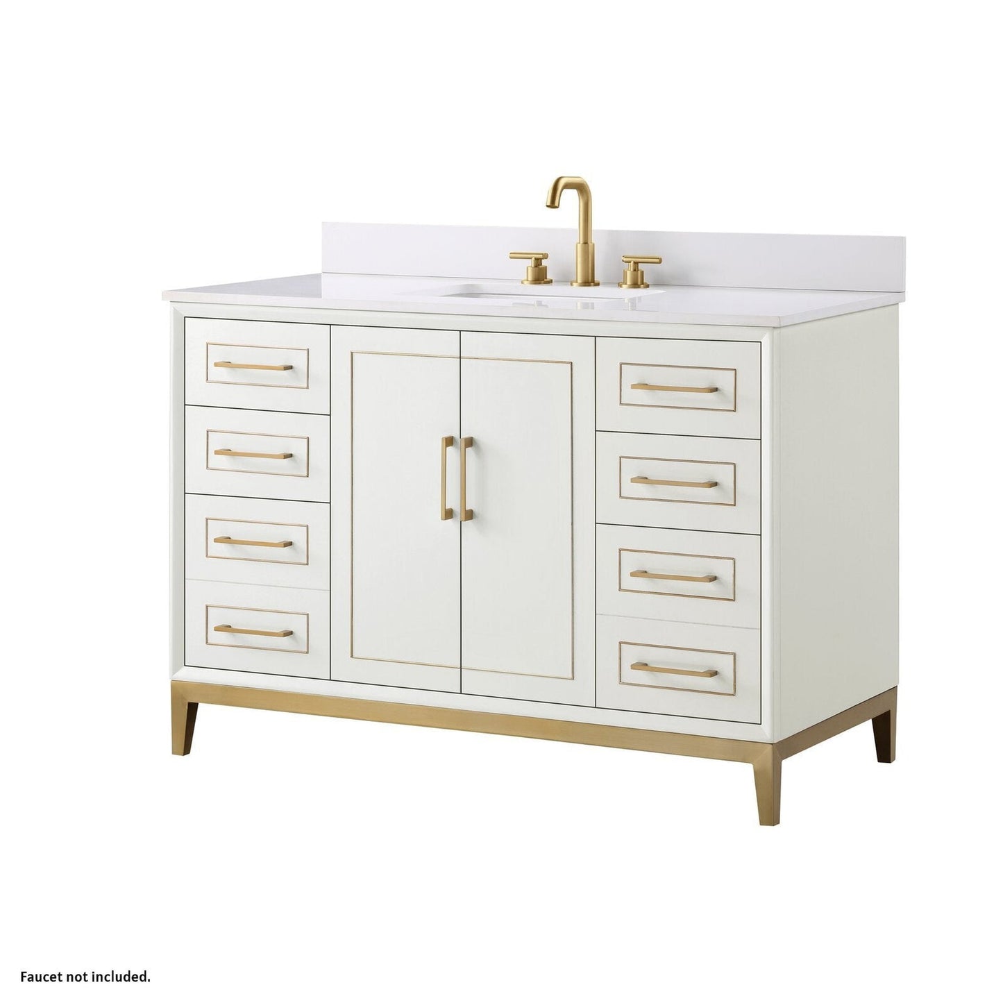 Bemma Design Gracie 48" Satin White Solid Wood Freestanding Bathroom Vanity With Single 3-Hole White Quartz Vanity Top, Rectangle Undermount Sink, Backsplash and Satin Brass Trim